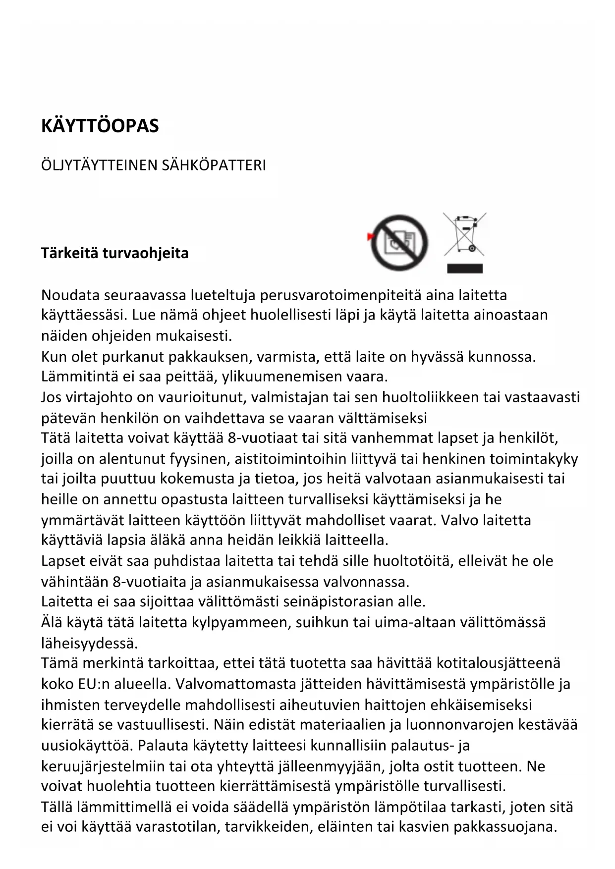 Tärkeitä turvaohjeita Noudata seuraavassa lueteltuja perusvarotoimenpiteitä aina laitetta käyttäessäsi. Lue nämä ohjeet huolellisesti läpi ja käytä laitetta ainoastaan näiden ohjeiden mukaisesti. Kun olet purkanut pakkauksen, varmista, että laite on hyvässä kunnossa. Lämmitintä ei saa peittää, ylikuumenemisen vaara. Jos virtajohto on vaurioitunut, valmistajan tai sen huoltoliikkeen tai vastaavasti pätevän henkilön on vaihdettava se vaaran välttämiseksi Tätä laitetta voivat käyttää 8-vuotiaat tai sitä vanhemmat lapset ja henkilöt, joilla on alentunut fyysinen, aistitoimintoihin liittyvä tai henkinen toimintakyky tai joilta puuttuu kokemusta ja tietoa, jos heitä valvotaan asianmukaisesti tai heille on annettu opastusta laitteen turvalliseksi käyttämiseksi ja he ymmärtävät laitteen käyttöön liittyvät mahdolliset vaarat. Valvo laitetta käyttäviä lapsia äläkä anna heidän leikkiä laitteella. Lapset eivät saa puhdistaa laitetta tai tehdä sille huoltotöitä, elleivät he ole vähintään 8-vuotiaita ja asianmukaisessa valvonnassa. Laitetta ei saa sijoittaa välittömästi seinäpistorasian alle. Älä käytä tätä laitetta kylpyammeen, suihkun tai uima-altaan välittömässä läheisyydessä. Tämä merkintä tarkoittaa, ettei tätä tuotetta saa hävittää kotitalousjätteenä koko EU:n alueella. Valvomattomasta jätteiden hävittämisestä ympäristölle ja ihmisten terveydelle mahdollisesti aiheutuvien haittojen ehkäisemiseksi kierrätä se vastuullisesti. Näin edistät materiaalien ja luonnonvarojen kestävää uusiokäyttöä. Palauta käytetty laitteesi kunnallisiin palautus- ja keruujärjestelmiin tai ota yhteyttä jälleenmyyjään, jolta ostit tuotteen. Ne voivat huolehtia tuotteen kierrättämisestä ympäristölle turvallisesti. Tällä lämmittimellä ei voida säädellä ympäristön lämpötilaa tarkasti, joten sitä ei voi käyttää varastotilan, tarvikkeiden, eläinten tai kasvien pakkassuojana.Tämä patteri on täytetty tarkasti määritetyllä määrällä erikoisöljyä. Öljytilan avaamista edellyttäviä korjauksia saa tehdä ainoastaan valmistaja tai sen huoltoasentaja, joihin on otettava yhteyttä myös vuodon yhteydessä. Kun romutat laitteen käytöstä, noudata öljyn hävittämistä koskevia säännöksiä. Tällä lämmittimellä ei voida säädellä ympäristön lämpötilaa tarkasti, joten sitä ei voi käyttää varastotilan, tarvikkeiden, eläinten tai kasvien pakkassuojana. Laite on tarkoitettu vain kotitalouskäyttöön. Varoitus Tulipalon vaara, jos laite peitetään tai sijoitetaan lähelle verhoja tai muita palavia materiaaleja. Tämän tuotteen osat voivat kuumentua voimakkaasti ja aiheuttaa palovammoja. Erityistä huomiota on kiinnitettävä lapsiin ja heikossa asemassa oleviin henkilöihin.KUVA LAITTEEN OSISTA (OR2000M) Rivat Virtakytkin: Termostaatin säädin Johtoteline Kääntyvät pyörät ÖLJYTÄYTTEISEN SÄHKÖPATTERIN KÄYTTÖ (OR2000M)