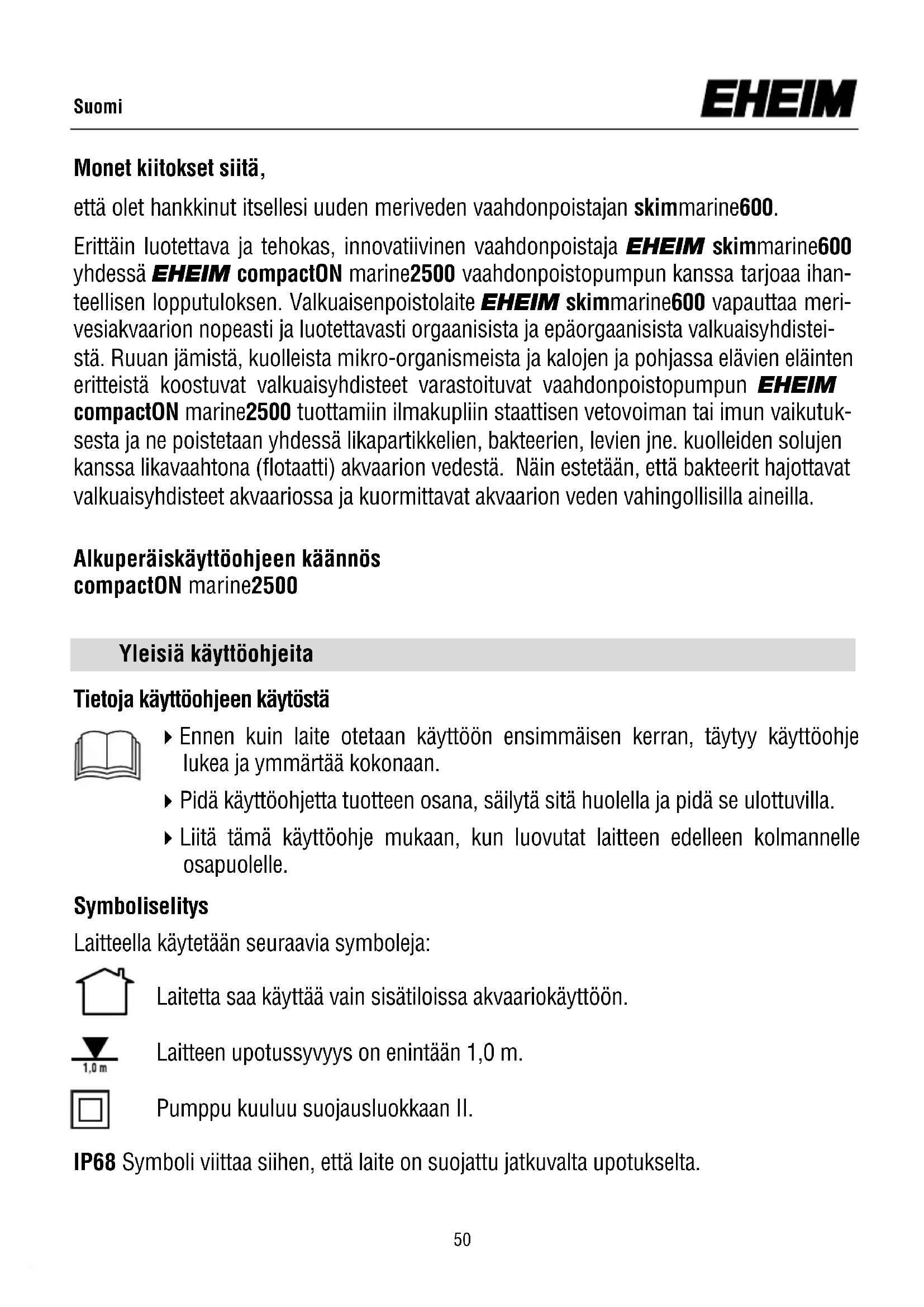 Luftinntak 300 - 540 l/h Størrelse ø 16 cm Flate mm 190 x 160 Vannivå mm 180 - 240 L x B x H cm dimensjoner 19 x 19 x 52,5 49Monet kiitokset siitä, että olet hankkinut itsellesi uuden meriveden vaahdonpoistajan skimmarine600. Erittäin luotettava ja tehokas, innovatiivinen vaahdonpoistaja EHEIM skimmarine600 yhdessä EHEIM compactON marine2500 vaahdonpoistopumpun kanssa tarjoaa ihan- teellisen lopputuloksen. Valkuaisenpoistolaite EHEIM skimmarine600 vapauttaa meri- vesiakvaarion nopeasti ja luotettavasti orgaanisista ja epäorgaanisista valkuaisyhdistei- stä. Ruuan jämistä, kuolleista mikro-organismeista ja kalojen ja pohjassa elävien eläinten eritteistä koostuvat valkuaisyhdisteet varastoituvat vaahdonpoistopumpun EHEIM compactON marine2500 tuottamiin ilmakupliin staattisen vetovoiman tai imun vaikutuk- sesta ja ne poistetaan yhdessä likapartikkelien, bakteerien, levien jne. kuolleiden solujen kanssa likavaahtona (flotaatti) akvaarion vedestä. Näin estetään, että bakteerit hajottavat valkuaisyhdisteet akvaariossa ja kuormittavat akvaarion veden vahingollisilla aineilla. Suomi Yleisiä käyttöohjeita Tietoja käyttöohjeen käytöstä Ennen kuin laite otetaan käyttöön ensimmäisen kerran, täytyy käyttöohje lukea ja ymmärtää kokonaan. Pidä käyttöohjetta tuotteen osana, säilytä sitä huolella ja pidä se ulottuvilla. Liitä tämä käyttöohje mukaan, kun luovutat laitteen edelleen kolmannelle osapuolelle. Symboliselitys Laitteella käytetään seuraavia symboleja: Laitetta saa käyttää vain sisätiloissa akvaariokäyttöön. Laitteen upotussyvyys on enintään 1,0 m. Pumppu kuuluu suojausluokkaan II. IP68 Symboli viittaa siihen, että laite on suojattu jatkuvalta upotukselta. Alkuperäiskäyttöohjeen käännös compactON marine2500 50Laite on hyväksytty asianomaisten kansallisten määräysten ja direktiivien mukaan ja vastaa EU-normeja Tässä käyttöohjeessa käytetään seuraavia symboleja ja merkkisanoja: VAARA! Symboli viittaa uhkaavaan sähköiskun vaaraan, josta voi olla seurauksena kuo- lema tai vakava kehon vamma. VAARA! Symboli viittaa uhkaavaan vaaraan, josta voi olla seurauksena kuolema tai vaka- va kehon vamma. VAROITUS! Symboli viittaa uhkaavaan vaaraan, josta voi olla seurauksena keskikokoise- sta lievään kehon vammaan tai terveydelliseen vaaraan. VARO! Symboli viittaa esinevahinkojen vaaraan. Ohje hyödyllisten tietojen ja vinkkien kanssa. Esityssopimus: A Viittaus kuvaan, tässä viittaus kuvaan A. Sinua pyydetään toimimaan. Käyttöalue Laite ja kaikki toimituslaajuuteen sisältyvät osat on tarkoitettu käyttöön yksityisalueel- la ja sitä saa käyttää vain: