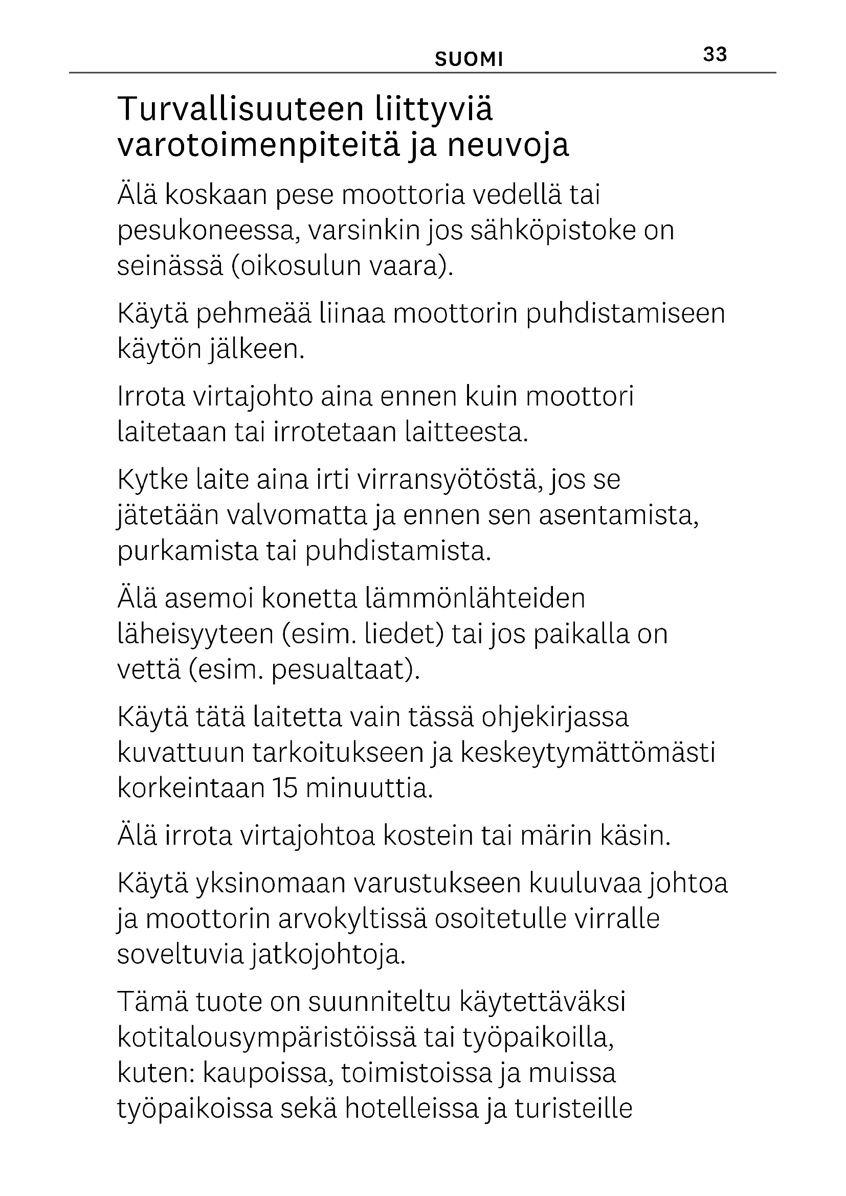- Instruktionsbog Sådan tilkobles motoren til Marcato- maskinen Anbring motoren tæt på maskinen i en vinkel på ca. 30°, og indsæt stiften i hullet i udfræsningen (fig. 1 ). Skub motoren, indtil den hviler på sidefladen. Derefter drejes den nedad ca. 30°, indtil den sidder helt fast. Inden du tilslutter strømkablet, skal du sikre dig, at forsyningsspændingen svarer til den, der er vist på motorens typeskilt (fig. 2 ). Tryk på knappen i position I for at starte motoren (fig. 3 - 4 ). Tryk på knappen II (PULSE) for at bruge motoren diskontinuerligt. For at erne motoren fra selve maskinen skal du dreje den opad i en vinkel på ca. 30° og trække den udad (fig. 5 ). Garanti Marcato-produkter fremstilles med de bedste tilgængelige materialer og gennemgår konstante kvalitetskontroller. Derfor garanterer vi assistance i 2 år mod produktionsfejl. Garantien dækker ikke skader forårsaget af forkert brug eller anden brug end den, der er illustreret i denne manual. For mere information eller opskrifter, besøg www.marcato.it eller skriv til info@marcato.it Nedhent oplysningerne på www.marcato.it DANSK33 SUOMI Turvallisuuteen liittyviä varotoimenpiteitä ja neuvoja Älä koskaan pese moottoria vedellä tai pesukoneessa, varsinkin jos sähköpistoke on seinässä (oikosulun vaara). Käytä pehmeää liinaa moottorin puhdistamiseen käytön jälkeen. Irrota virtajohto aina ennen kuin moottori laitetaan tai irrotetaan laitteesta. Kytke laite aina irti virransyötöstä, jos se jätetään valvomatta ja ennen sen asentamista, purkamista tai puhdistamista. Älä asemoi konetta lämmönlähteiden läheisyyteen (esim. liedet) tai jos paikalla on vettä (esim. pesualtaat). Käytä tätä laitetta vain tässä ohjekirjassa kuvattuun tarkoitukseen ja keskeytymättömästi korkeintaan 15 minuuttia. Älä irrota virtajohtoa kostein tai märin käsin. Käytä yksinomaan varustukseen kuuluvaa johtoa ja moottorin arvokyltissä osoitetulle virralle soveltuvia jatkojohtoja. Tämä tuote on suunniteltu käytettäväksi kotitalousympäristöissä tai työpaikoilla, kuten: kaupoissa, toimistoissa ja muissa työpaikoissa sekä hotelleissa ja turisteille34 tarkoitetuissa rakennuksissa olevissa keittiöissä ja ravintoloiden keittiöissä. Moottoreilla varustetuilla laitteilla tehtävän työskentelyn aikana vältä solmioiden, huivien tai pitkien kaulakorujen käyttöä. Muista lisäksi sitoa hiukset. Puhdistusta ja huoltoa ei saa suorittaa lasten toimesta, ellei heidän toimintaansa valvo aikuinen henkilö. Kaikki korjaustoimenpiteet, jotka koskevat sähköisiä osia, on suoritettava pätevän henkilöstön toimesta. Moottorin sisäisiin osiin meno valtuuttamattoman henkilöstön toimesta on kielletty. VAROITUS! Laitteen käyttö on sallittu yli 8-vuotiaille lapsille, jos heidän toimintaansa valvotaan tai jos he ovat saaneet ohjeet laitteen turvalliseen käyttöön ja ovat ymmärtäneet siihen liittyvät vaarat. Lapset eivät saa suorittaa käyttäjän tekemiä puhdistus- ja huoltotoimenpiteitä, elleivät he ole yli 8-vuotiaita ja heidän toimintaansa valvota. Pidä laite ja siihen kuuluva johto pois alle 8-vuotiaiden lasten ulottuvilta. Laitteita voivat käyttää henkilöt, joilla on fyysisiä, henkisiä tai älyllisiä rajoitteita, tai joilla ei ole kokemusta35 ja tietoa sen käytöstä, jos heitä valvotaan tai ohjataan laitteen turvalliseen käyttöön ja jos he ymmärtävät siitä koituvat vaarat. Lapset eivät saa käyttää laitetta leikkikaluna. Yliviivattu jätesäiliö osoittaa, että Euroopan unionin maissa tuote on käsiteltävä erikseen sen käytöstä poistamisen yhteydessä. Älä hävitä näitä tuotteita kotitalousjätteiden kanssa. Pakkauksen sisällä oleva materiaali