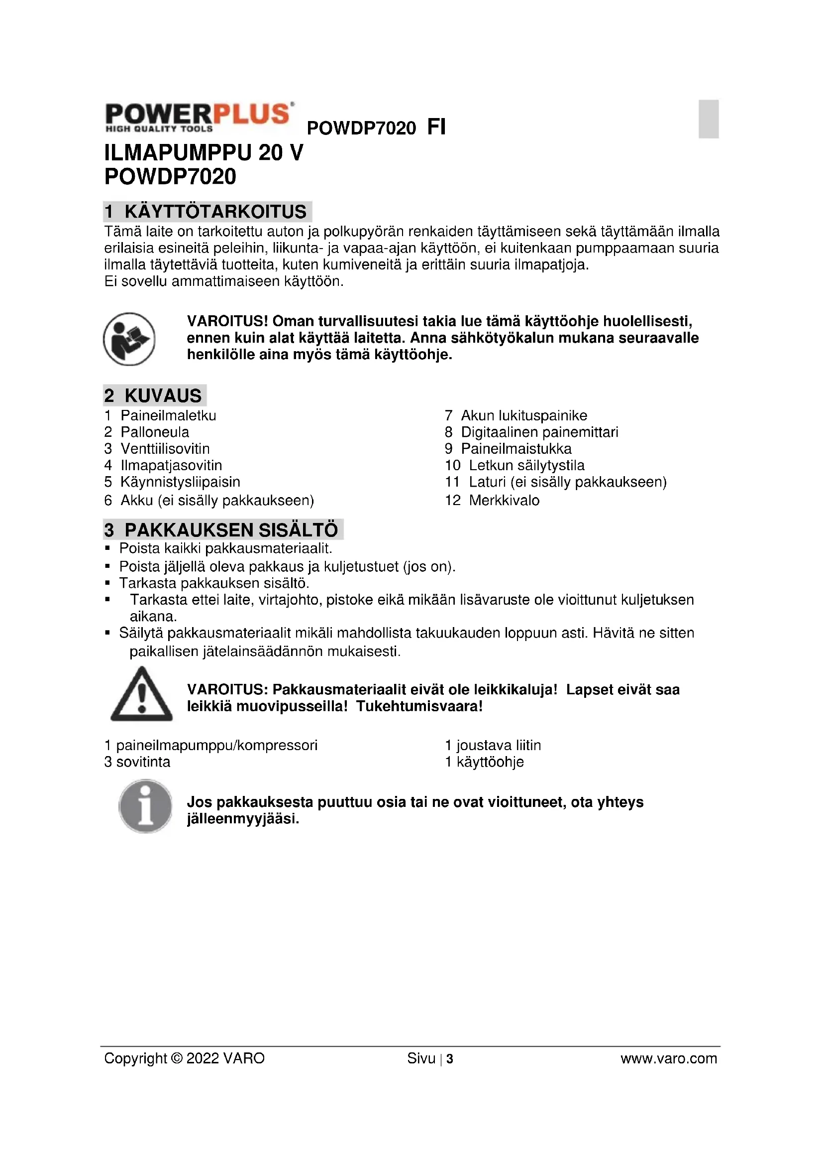 - Älä koskaan sahaa tai poraa reikiä kompressoriin.POWDP7020 FI Copyright © 2022 VARO Sivu | 6 www.varo.com