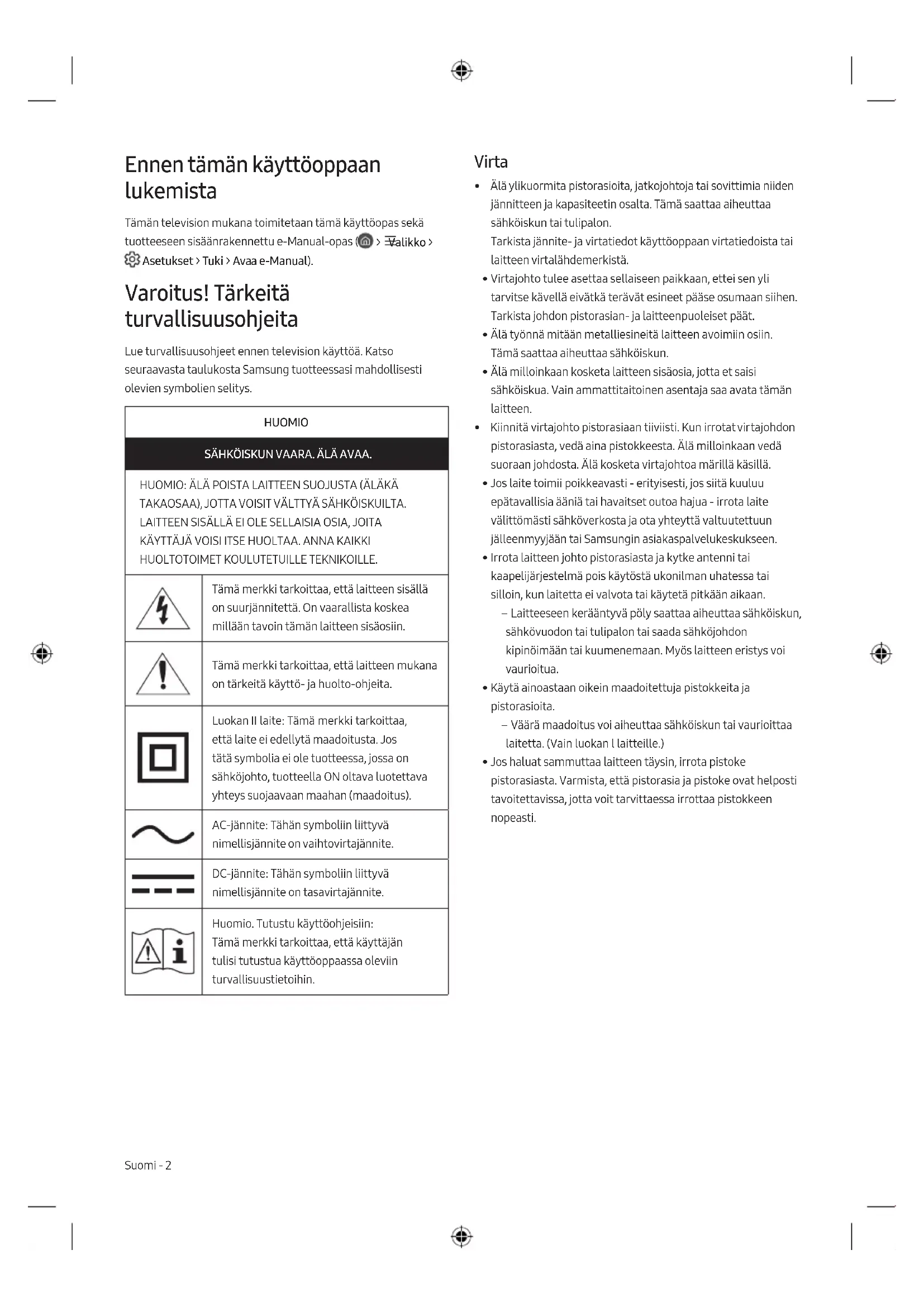- Batteritypen kan variere avhengig av modellen. Norsk - 9 NorskEnnen tämän käyttöoppaan lukemista Tämän television mukana toimitetaan tämä käyttöopas sekä tuotteeseen sisäänrakennettu e-Manual-opas ( > Valikko > Asetukset > Tuki > Avaa e-Manual). Varoitus! Tärkeitä turvallisuusohjeita Lue turvallisuusohjeet ennen television käyttöä. Katso seuraavasta taulukosta Samsung tuotteessasi mahdollisesti olevien symbolien selitys. HUOMIO SÄHKÖISKUN VAARA. ÄLÄ AVAA. HUOMIO: ÄLÄ POISTA LAITTEEN SUOJUSTA (ÄLÄKÄ TAKAOSAA), JOTTA VOISIT VÄLTTYÄ SÄHKÖISKUILTA. LAITTEEN SISÄLLÄ EI OLE SELLAISIA OSIA, JOITA KÄYTTÄJÄ VOISI ITSE HUOLTAA. ANNA KAIKKI HUOLTOTOIMET KOULUTETUILLE TEKNIKOILLE. Tämä merkki tarkoittaa, että laitteen sisällä on suurjännitettä. On vaarallista koskea millään tavoin tämän laitteen sisäosiin. Tämä merkki tarkoittaa, että laitteen mukana on tärkeitä käyttö- ja huolto-ohjeita. LuokanII laite: Tämä merkki tarkoittaa, että laite ei edellytä maadoitusta. Jos tätä symbolia ei ole tuotteessa, jossa on sähköjohto, tuotteella ON oltava luotettava yhteys suojaavaan maahan (maadoitus). AC-jännite: Tähän symboliin liittyvä nimellisjännite on vaihtovirtajännite. DC-jännite: Tähän symboliin liittyvä nimellisjännite on tasavirtajännite. Huomio. Tutustu käyttöohjeisiin: Tämä merkki tarkoittaa, että käyttäjän tulisi tutustua käyttöoppaassa oleviin turvallisuustietoihin. Virta
