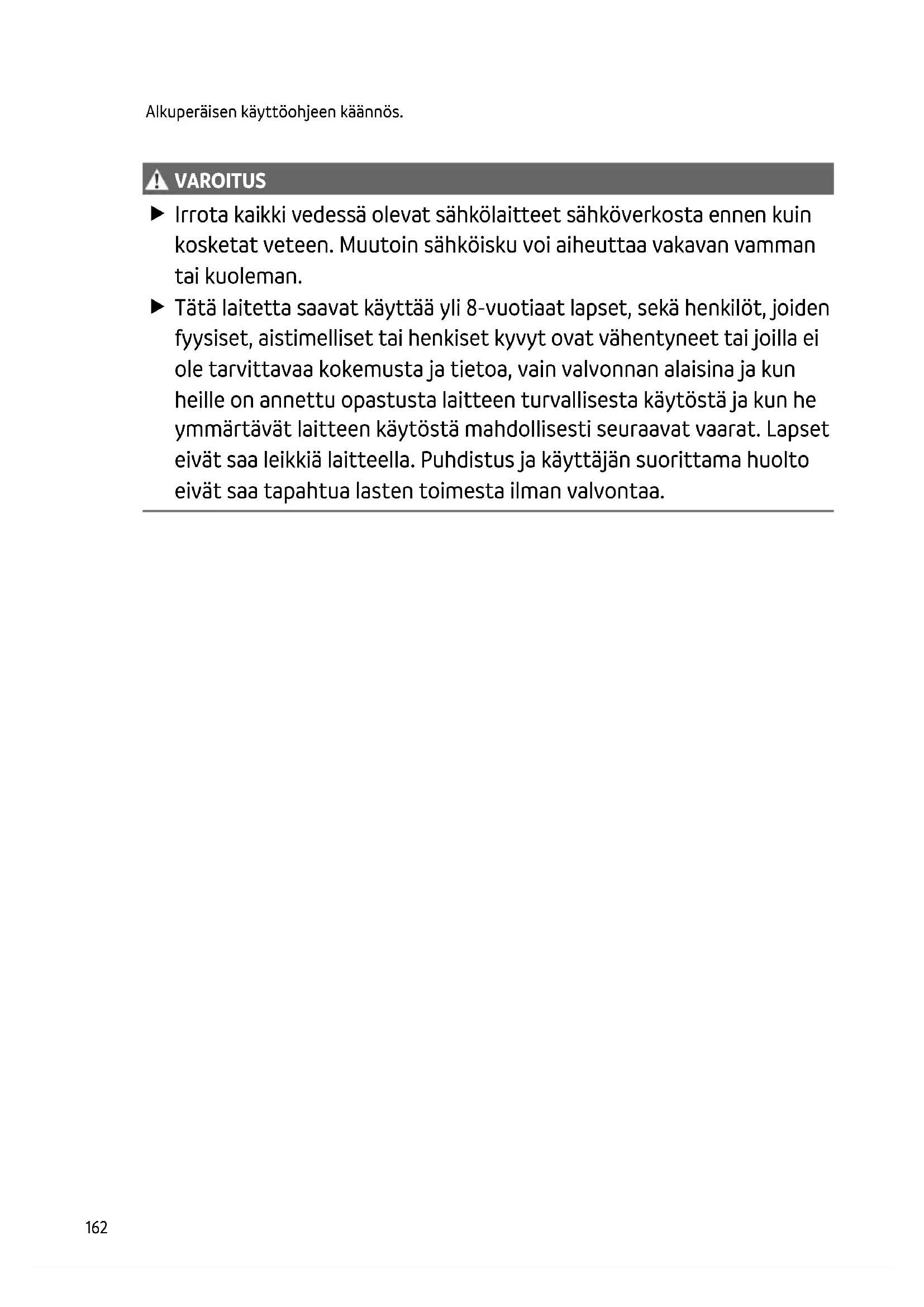 VAROIT US VAROITUS Irrota kaikki vedessä olevat sähkölaitteet sähköverkosta ennen kuin kosketat veteen. Muutoin sähköisku voi aiheuttaa vakavan vamman tai kuoleman. Tätä laitetta saavat käyttää yli 8-vuotiaat lapset, sekä henkilöt, joiden fyysiset, aistimelliset tai henkiset kyvyt ovat vähentyneet tai joilla ei ole tarvittavaa kokemusta ja tietoa, vain valvonnan alaisina ja kun heille on annettu opastusta laitteen turvallisesta käytöstä ja kun he ymmärtävät laitteen käytöstä mahdollisesti seuraavat vaarat. Lapset eivät saa leikkiä laitteella. Puhdistus ja käyttäjän suorittama huolto eivät saa tapahtua lasten toimesta ilman valvontaa.FI