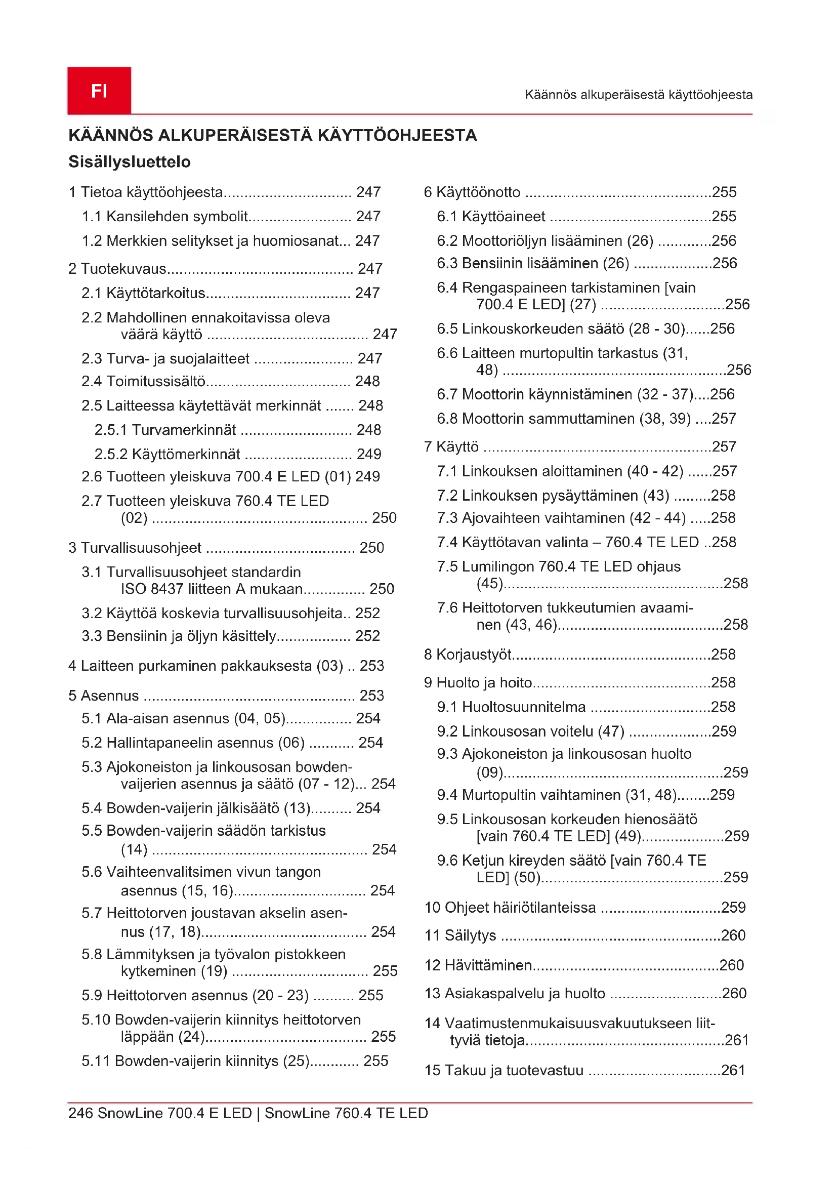Nro Osa 1 Lämmitettävät työntökahvat 2 Linkouksen kytkentäkahva 3 Ajokoneiston kytkentäkahva 4 Heittosuunnan säätökampi 5 Heittokorkeuden säätövipu 6 Vaihteenvalitsimen vipu, 6 vaihdetta eteen ja 2 taakse 7 Työntökahvojen lämmityksen kytkin 8 Varamurtopultit (2x) 9 Työvalo 10 Tankin kansi 11 Öljyn täyttöaukon kansi 12 Heittotorven ohjauslevy heittokorkeuden säätöä varten 13 Heittotorvi ja suojus 14 Kilpi 15 Puhdistustyökalu (kiinnitetty kilpeen)FI 250 SnowLine 700.4 E LED | SnowLine 760.4 TE LED Turvallisuusohjeet Nro Osa 16 Heittopyörä 17 Linkousosa 18 Linkouslevy 19 Korkeussäädettävät liukujalakset 20 Sytytystulpan pistoke