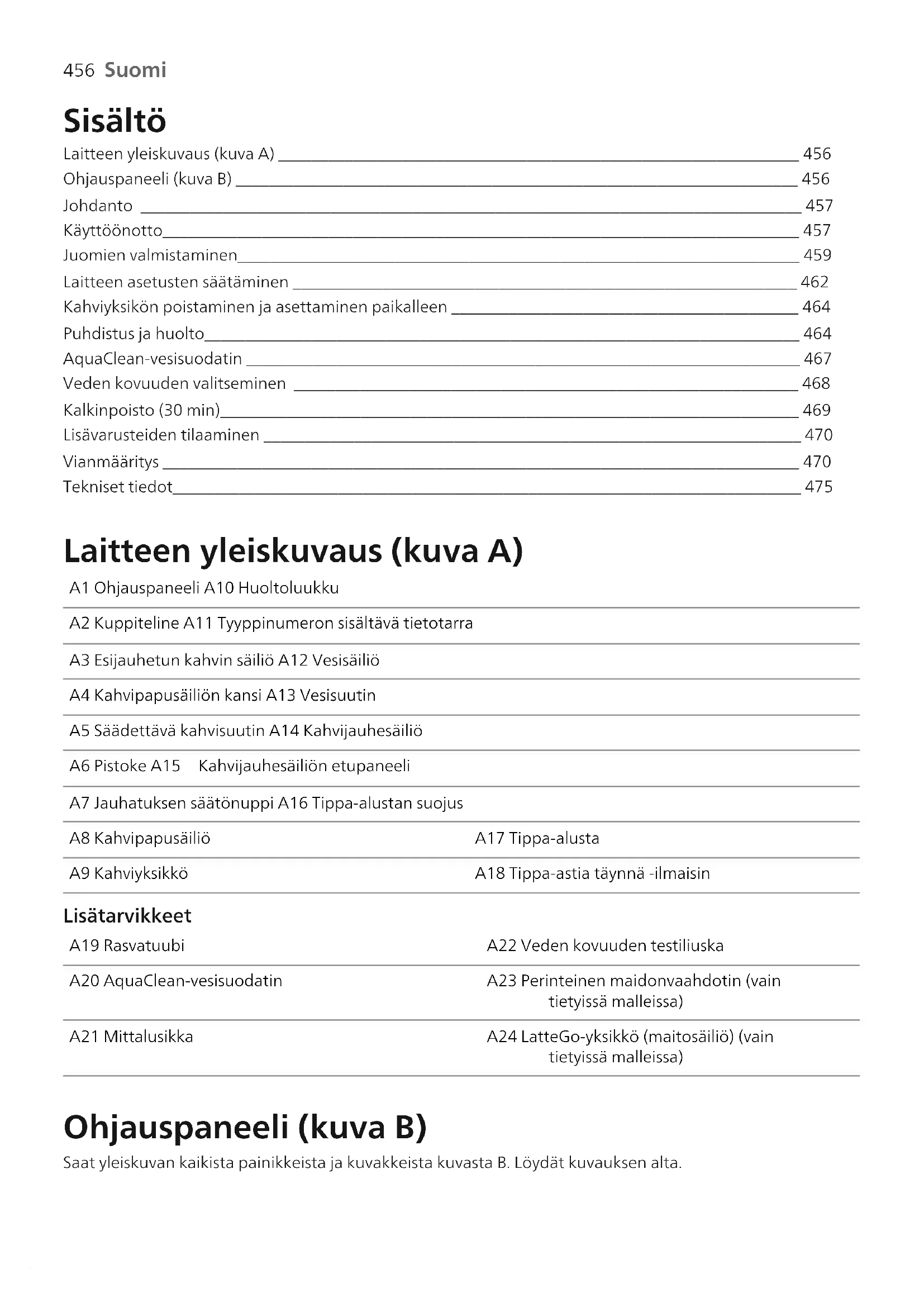 Suomi Sisältö Laitteen yleiskuvaus (kuva A) _______________________________________________________________ 456 Ohjauspaneeli (kuva B) ____________________________________________________________________ 456 Johdanto ________________________________________________________________________________ 457 Käyttöönotto_____________________________________________________________________________ 457 Juomien valmistaminen____________________________________________________________________ 459 Laitteen asetusten säätäminen _____________________________________________________________ 462 Kahviyksikön poistaminen ja asettaminen paikalleen __________________________________________ 464 Puhdistus ja huolto________________________________________________________________________ 464 AquaClean-vesisuodatin ___________________________________________________________________ 467 Veden kovuuden valitseminen _____________________________________________________________ 468 Kalkinpoisto (30 min)______________________________________________________________________ 469 Lisävarusteiden tilaaminen _________________________________________________________________ 470 Vianmääritys _____________________________________________________________________________ 470 Tekniset tiedot____________________________________________________________________________ 475 Laitteen yleiskuvaus (kuva A) A1 Ohjauspaneeli A10 Huoltoluukku A2 Kuppiteline A11 Tyyppinumeron sisältävä tietotarra A3 Esijauhetun kahvin säiliö A12 Vesisäiliö A4 Kahvipapusäiliön kansi A13 Vesisuutin A5 Säädettävä kahvisuutin A14 Kahvijauhesäiliö A6 Pistoke A15 Kahvijauhesäiliön etupaneeli A7 Jauhatuksen säätönuppi A16 Tippa-alustan suojus A8 Kahvipapusäiliö A17 Tippa-alusta A9 Kahviyksikkö A18 Tippa-astia täynnä -ilmaisin Lisätarvikkeet A19 Rasvatuubi A22 Veden kovuuden testiliuska A20 AquaClean-vesisuodatin A23 Perinteinen maidonvaahdotin (vain tietyissä malleissa) A21 Mittalusikka A24 LatteGo-yksikkö (maitosäiliö) (vain tietyissä malleissa) Ohjauspaneeli (kuva B) Saat yleiskuvan kaikista painikkeista ja kuvakkeista kuvasta B. Löydät kuvauksen alta.457 Suomi Suomi Jotkin painikkeista/kuvakkeista koskevat vain tiettyjä malleja. B1 Virtapainike B7 Varoituskuvakkeet B2 Juomakuvakkeet* B8 Aloituksen merkkivalo B3 Kahvin vahvuus / esijauhetun kahvin kuvake B9 Käynnistys- painike B4 Juoman määrän kuvake B10 Calc / Clean -kuvake B5 Maidon määrän kuvake (vain tietyissä malleissa) B11 AquaClean-kuvake B6 Kahvin lämpötilan kuvake (vain tietyissä malleissa)