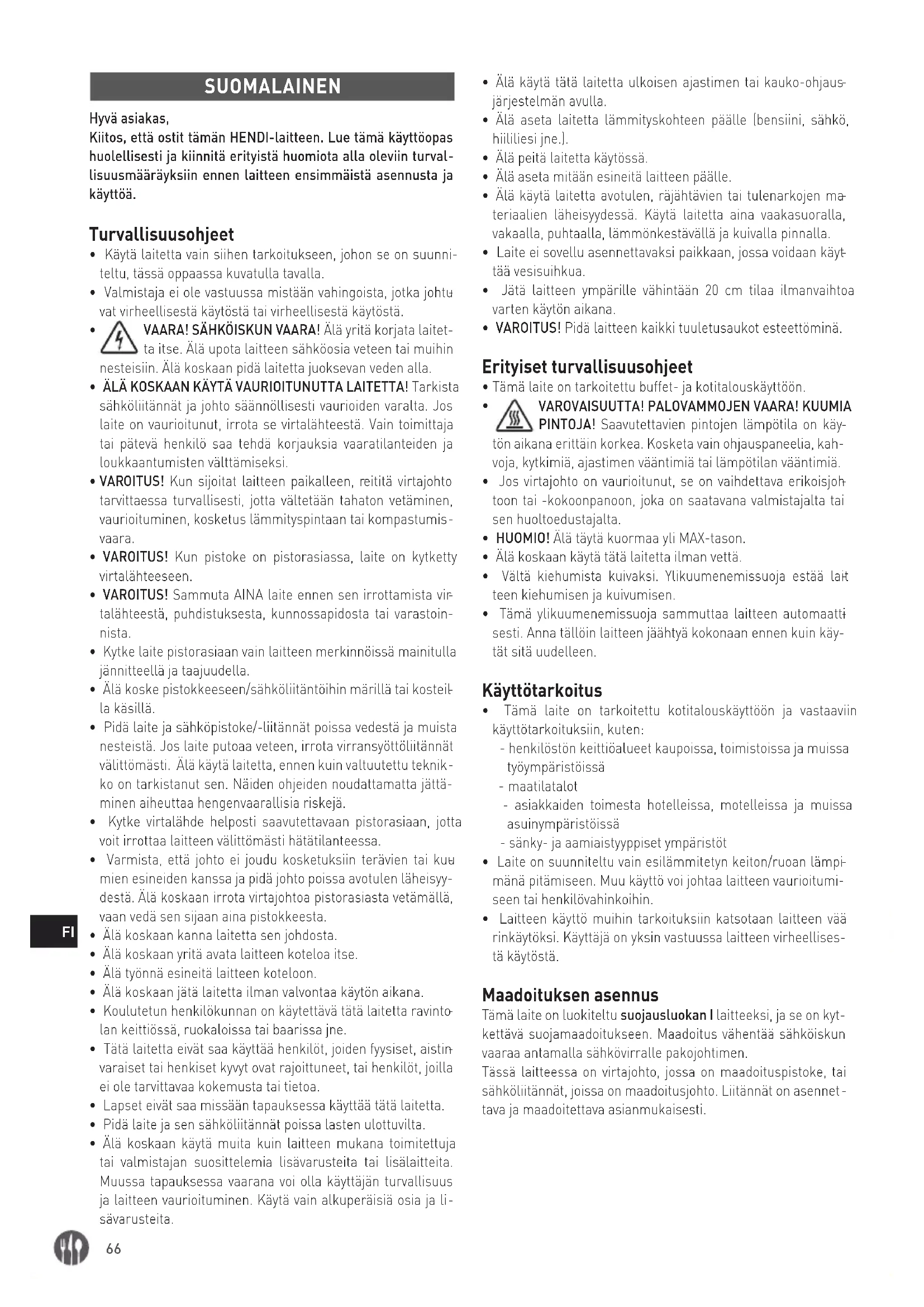 SUOMALAINEN Hyvä asiakas, Kiitos, että ostit tämän HENDI-laitteen. Lue tämä käyttöopas huolellisesti ja kiinnitä erityistä huomiota alla oleviin turval