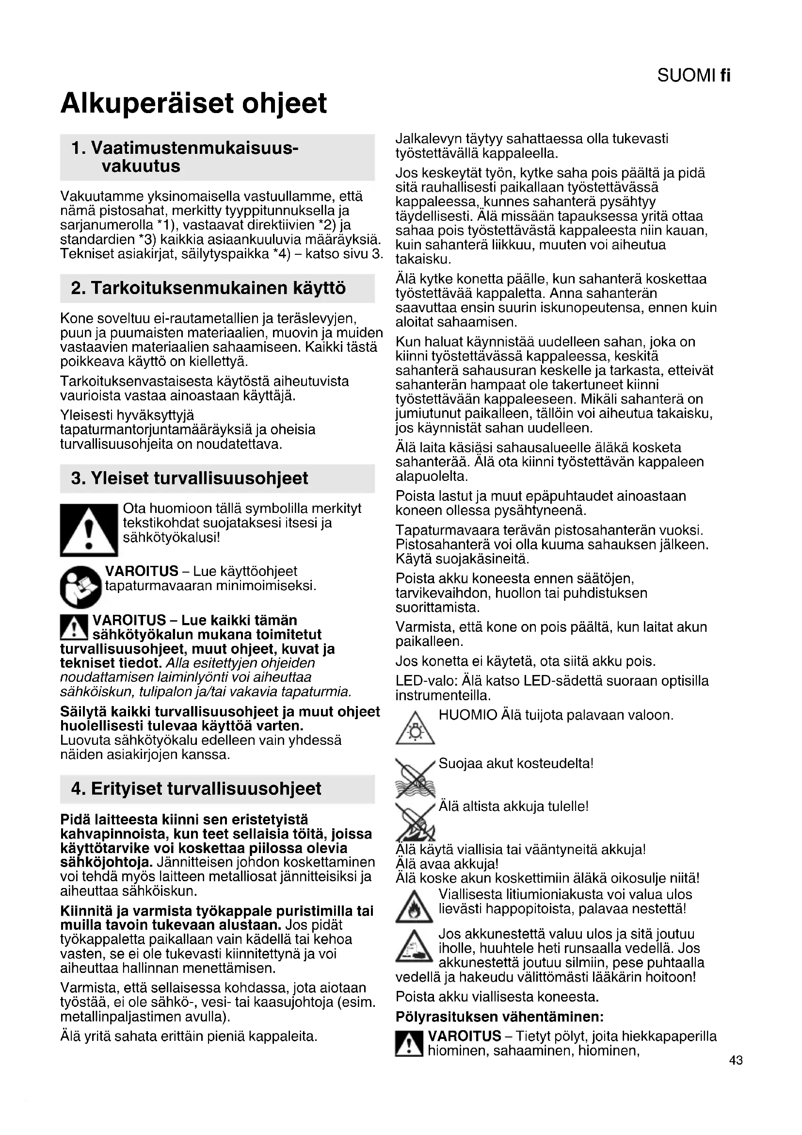 Alkuperäiset ohjeet Vakuutamme yksinomaisella vastuullamme, että nämä pistosahat, merkitty tyyppitunnuksella ja sarjanumerolla *1), vastaavat direktiivien *2) ja standardien *3) kaikkia asiaankuuluvia määräyksiä. Tekniset asiakirjat, säilytyspaikka *4) – katso sivu 3. Kone soveltuu ei-rautametallien ja teräslevyjen, puun ja puumaisten materiaalien, muovin ja muiden vastaavien materiaalien sahaamiseen. Kaikki tästä poikkeava käyttö on kiellettyä. Tarkoituksenvastaisesta käytöstä aiheutuvista vaurioista vastaa ainoastaan käyttäjä. Yleisesti hyväksyttyjä tapaturmantorjuntamääräyksiä ja oheisia turvallisuusohjeita on noudatettava. Ota huomioon tällä symbolilla merkityt tekstikohdat suojataksesi itsesi ja sähkötyökalusi! VAROITUS – Lue käyttöohjeet tapaturmavaaran minimoimiseksi. VAROITUS – Lue kaikki tämän sähkötyökalun mukana toimitetut turvallisuusohjeet, muut ohjeet, kuvat ja tekniset tiedot. Alla esitettyjen ohjeiden noudattamisen laiminlyönti voi aiheuttaa sähköiskun, tulipalon ja/tai vakavia tapaturmia. Säilytä kaikki turvallisuusohjeet ja muut ohjeet huolellisesti tulevaa käyttöä varten. Luovuta sähkötyökalu edelleen vain yhdessä näiden asiakirjojen kanssa. Pidä laitteesta kiinni sen eristetyistä kahvapinnoista, kun teet sellaisia töitä, joissa käyttötarvike voi koskettaa piilossa olevia sähköjohtoja. Jännitteisen johdon koskettaminen voi tehdä myös laitteen metalliosat jännitteisiksi ja aiheuttaa sähköiskun. Kiinnitä ja varmista työkappale puristimilla tai muilla tavoin tukevaan alustaan. Jos pidät työkappaletta paikallaan vain kädellä tai kehoa vasten, se ei ole tukevasti kiinnitettynä ja voi aiheuttaa hallinnan menettämisen. Varmista, että sellaisessa kohdassa, jota aiotaan työstää, ei ole sähkö-, vesi- tai kaasujohtoja (esim. metallinpaljastimen avulla). Älä yritä sahata erittäin pieniä kappaleita. Jalkalevyn täytyy sahattaessa olla tukevasti työstettävällä kappaleella. Jos keskeytät työn, kytke saha pois päältä ja pidä sitä rauhallisesti paikallaan työstettävässä kappaleessa, kunnes sahanterä pysähtyy täydellisesti. Älä missään tapauksessa yritä ottaa sahaa pois työstettävästä kappaleesta niin kauan, kuin sahanterä liikkuu, muuten voi aiheutua takaisku. Älä kytke konetta päälle, kun sahanterä koskettaa työstettävää kappaletta. Anna sahanterän saavuttaa ensin suurin iskunopeutensa, ennen kuin aloitat sahaamisen. Kun haluat käynnistää uudelleen sahan, joka on kiinni työstettävässä kappaleessa, keskitä sahanterä sahausuran keskelle ja tarkasta, etteivät sahanterän hampaat ole takertuneet kiinni työstettävään kappaleeseen. Mikäli sahanterä on jumiutunut paikalleen, tällöin voi aiheutua takaisku, jos käynnistät sahan uudelleen. Älä laita käsiäsi sahausalueelle äläkä kosketa sahanterää. Älä ota kiinni työstettävän kappaleen alapuolelta. Poista lastut ja muut epäpuhtaudet ainoastaan koneen ollessa pysähtyneenä. Tapaturmavaara terävän pistosahanterän vuoksi. Pistosahanterä voi olla kuuma sahauksen jälkeen. Käytä suojakäsineitä. Poista akku koneesta ennen säätöjen, tarvikevaihdon, huollon tai puhdistuksen suorittamista. Varmista, että kone on pois päältä, kun laitat akun paikalleen. Jos konetta ei käytetä, ota siitä akku pois. LED-valo: Älä katso LED-sädettä suoraan optisilla instrumenteilla. HUOMIO Älä tuijota palavaan valoon. Suojaa akut kosteudelta! Älä altista akkuja tulelle! Älä käytä viallisia tai vääntyneitä akkuja! Älä avaa akkuja! Älä koske akun koskettimiin äläkä oikosulje niitä! Viallisesta litiumioniakusta voi valua ulos lievästi happopitoista, palavaa nestettä! Jos akkunestettä valuu ulos ja sitä joutuu iholle, huuhtele heti runsaalla vedellä. Jos akkunestettä joutuu silmiin, pese puhtaalla vedellä ja hakeudu välittömästi lääkärin hoitoon! Poista akku viallisesta koneesta. Pölyrasituksen vähentäminen: VAROITUS – Tietyt pölyt, joita hiekkapaperilla hiominen, sahaaminen, hiominen,