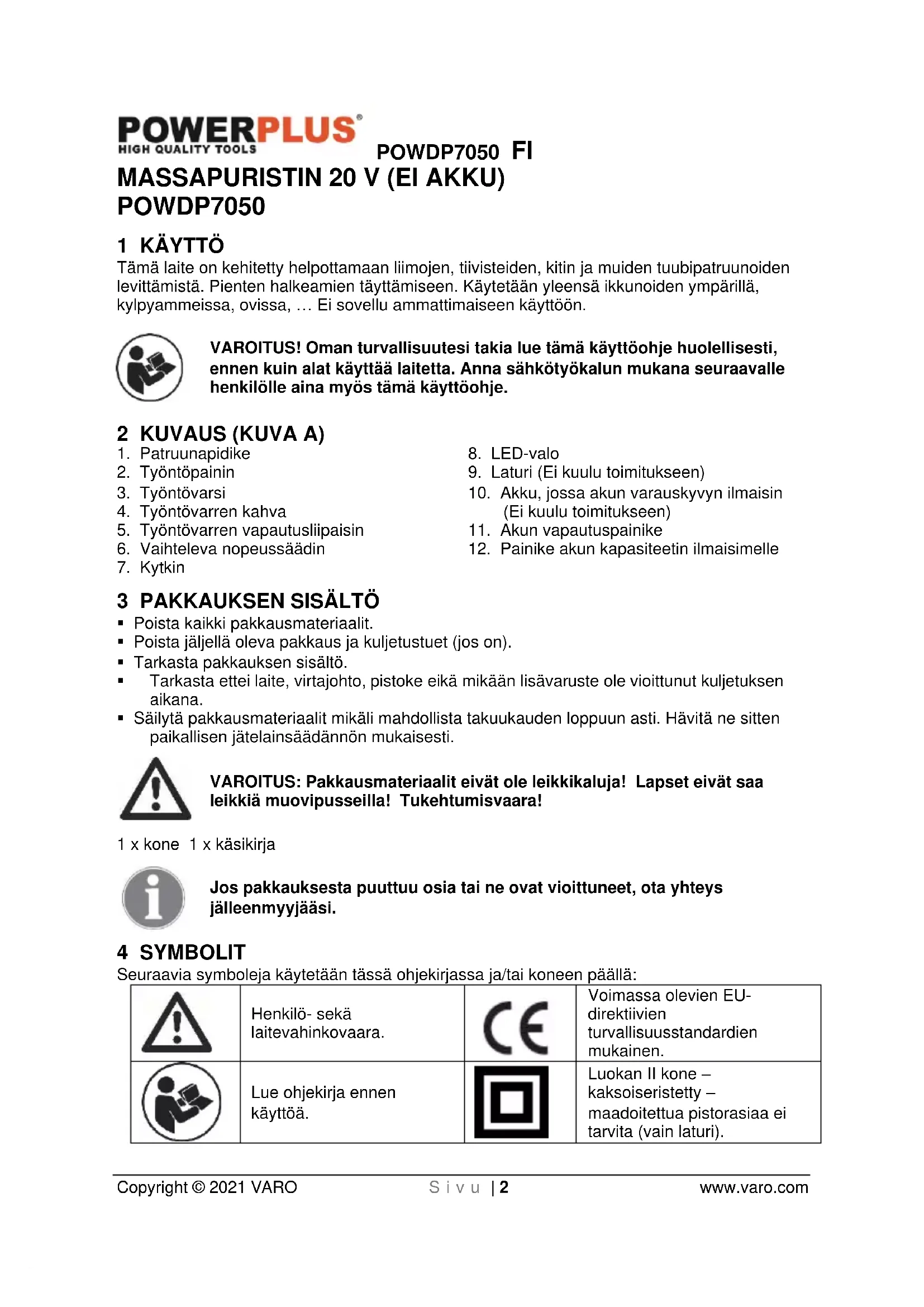 Copyright © 2021 VARO S i v u | 2 www.varo.com MASSAPURISTIN 20 V (EI AKKU) POWDP7050 1 KÄYTTÖ Tämä laite on kehitetty helpottamaan liimojen, tiivisteiden, kitin ja muiden tuubipatruunoiden levittämistä. Pienten halkeamien täyttämiseen. Käytetään yleensä ikkunoiden ympärillä, kylpyammeissa, ovissa, … Ei sovellu ammattimaiseen käyttöön. VAROITUS! Oman turvallisuutesi takia lue tämä käyttöohje huolellisesti, ennen kuin alat käyttää laitetta. Anna sähkötyökalun mukana seuraavalle henkilölle aina myös tämä käyttöohje. 2 KUVAUS (KUVA A)