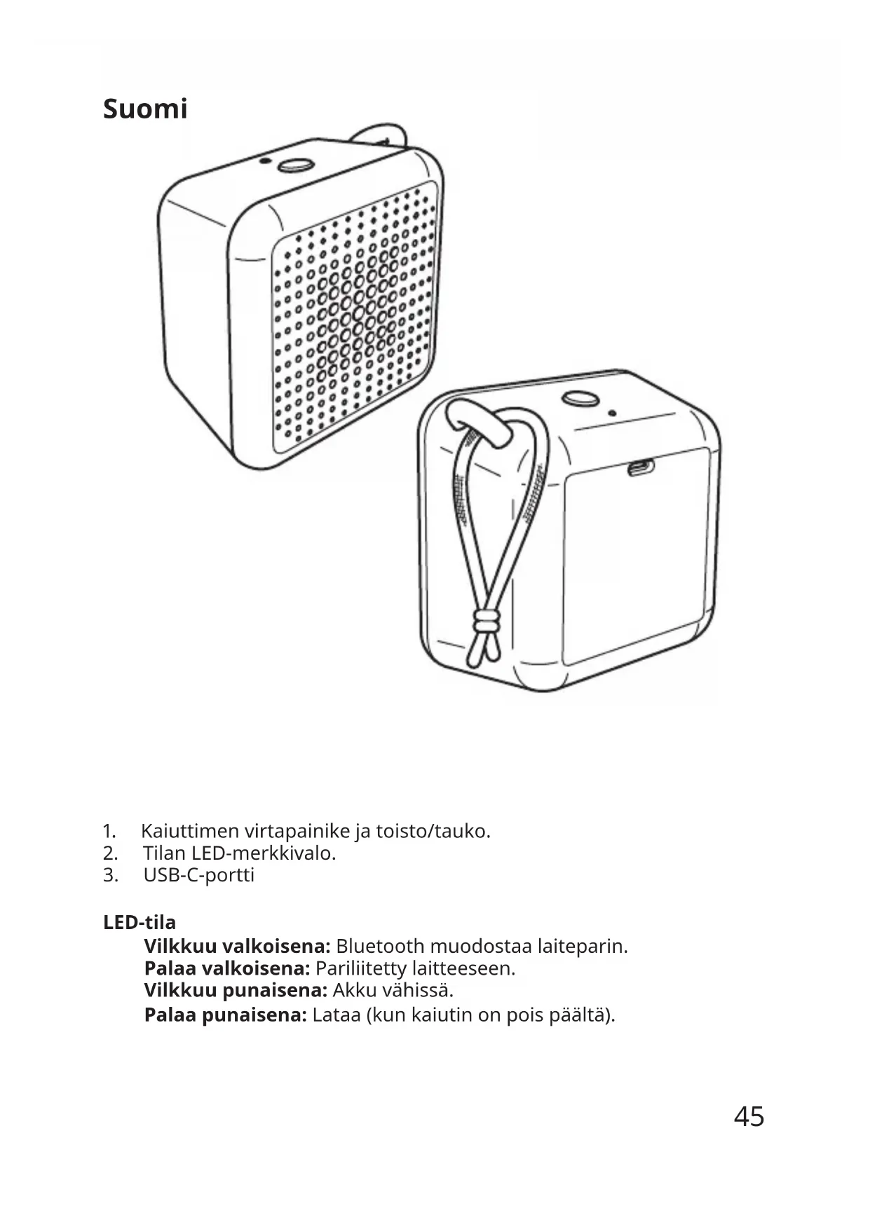 LED-tila Vilkkuu valkoisena:Bluetoothmuodostaalaiteparin. Palaa valkoisena:Pariliitettylaitteeseen. Vilkkuu punaisena:Akkuvähissä. Palaa punaisena:Lataa(kunkaiutinonpoispäältä). Suomi46 Käytönaloittaminen LiitäUSB-C-kaapelituloporttiinjatoinenpäävirtalähteeseen (tietokoneeseentaivirtalähteeseen)tuotteenlataamiseksiennen ensimmäistäkäyttökertaajaaina,kunLED-valovilkkuupunaisenaakun loppumisenmerkiksi.LatauksenaikanaLED-valopalaapunaisena,jos kaiutinonpoispäältä,jasammuu,kunakkuonlatautunuttäyteen. Suositeltava virtalähde: 5,0VDC,1,0A(eisisällytoimitukseen) Kaiuttimen toiminnot Kytkeminenpäälle/poispäältä Kytkekaiutinpäälletaipoispäältäpitämällävirtapainiketta(1) painettuna. Toisto/tauko Virtapainikkeenlyhytpainallustoistaataikeskeyttäämusiikin. Automaattinenvirrankatkaisu Joskaiutintaeiolepariliitettymihinkäänlaitteeseen,sesammuu automaattisesti5minuutinkuluttua.Joskaiutinonpariliitetty muttamusiikkiaeitoisteta,sesammuuautomaattisesti20minuutin kuluttua. Bluetooth-pariliitos KaiuttimenonoltavaBluetooth-pariliitostilassa,jottavoittehdä pariliitoksenlähdelaitteeseen.Muodostalaitepariavaamalla lähdelaitteenBluetooth-asetuksetjayhdistämällä”VAPPEBYPortable” -laitteeseen. KaiutinsiirtyyBluetooth-pariliitostilaanautomaattisesti,kunse käynnistetäänensimmäisenkerran,jaaina,kunaiemminyhdistettyä laitettaeilöydy. Tehdasasetusten palautus JoshaluatpoistaaaiemmatBluetooth-pariliitokset,palautakaiuttimen tehdasasetuksetpainamallapainiketta(1)yli5sekuntia.Onnistunut tehdasasetustenpalautusvahvistetaanvilkkuvallapunaisellaLED-valolla jamerkkiäänellä. VaihtoehtoisestivoitavatalähdelaitteesiBluetooth-valikonjapoistaa pariliitoksen.47 Stereo-pariliitos: KaksikannettavaaVAPPEBY-laitettavoidaanliittäästereopariksi: 1.Varmista,ettämolemmatkaiuttimetovatBluetooth-hakutilassa. 2.Painatoisenkaiuttimenvirtapainikettakaksikertaa.Merkkiääni vahvistaaonnistuneenstereopariliitoksen. 3.YhdistälähdelaitteeseennoudattamallaBluetooth-pariliitosohjeita. Hyvätietää