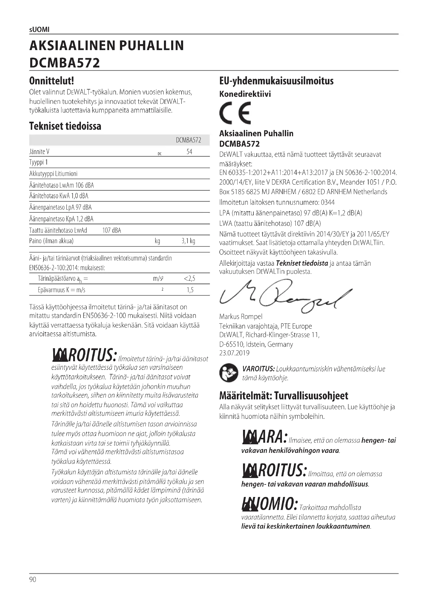 HUOMIO: Tarkoittaa mahdollista vaaratilannetta. Ellei tilannetta korjata, saattaa aiheutua lievä tai keskinkertainenloukkaantuminen. EU-yhdenmukaisuusilmoitus Konedirektiivi Aksiaalinen Puhallin DCMBA572 DeWALT vakuuttaa, että nämä tuotteet täyttävät seuraavat määräykset: EN 60335-1:2012+A11:2014+A13:2017 ja EN 50636-2-100:2014. 2000/14/EY, liite V DEKRA Certification B.V., Meander 1051 / P.O. Box 5185 6825 MJ ARNHEM / 6802 ED ARNHEM Netherlands Ilmoitetun laitoksen tunnusnumero: 0344 LPA (mitattu äänenpainetaso) 97 dB(A) K=1,2 dB(A)LWA (taattu äänitehotaso) 107 dB(A)Nämä tuotteet täyttävät direktiivin 2014/30/EY ja 2011/65/EY vaatimukset. Saat lisätietoja ottamalla yhteyden DeWALTiin. Osoitteet näkyvät käyttöohjeentakasivulla.Allekirjoittaja vastaa Tekniset tiedoista ja antaa tämän vakuutuksen DeWALTinpuolesta.Markus Rompel Tekniikan varajohtaja, PTE Europe DeWALT, Richard-Klinger-Strasse 11, D-65510, Idstein, Germany 23.07.2019Tässä käyttöohjeessa ilmoitetut tärinä- ja/tai äänitasot on mitattu standardin EN50636-2-100 mukaisesti. Niitä voidaan käyttää verrattaessa työkaluja keskenään. Sitä voidaan käyttää arvioitaessaaltistumista.