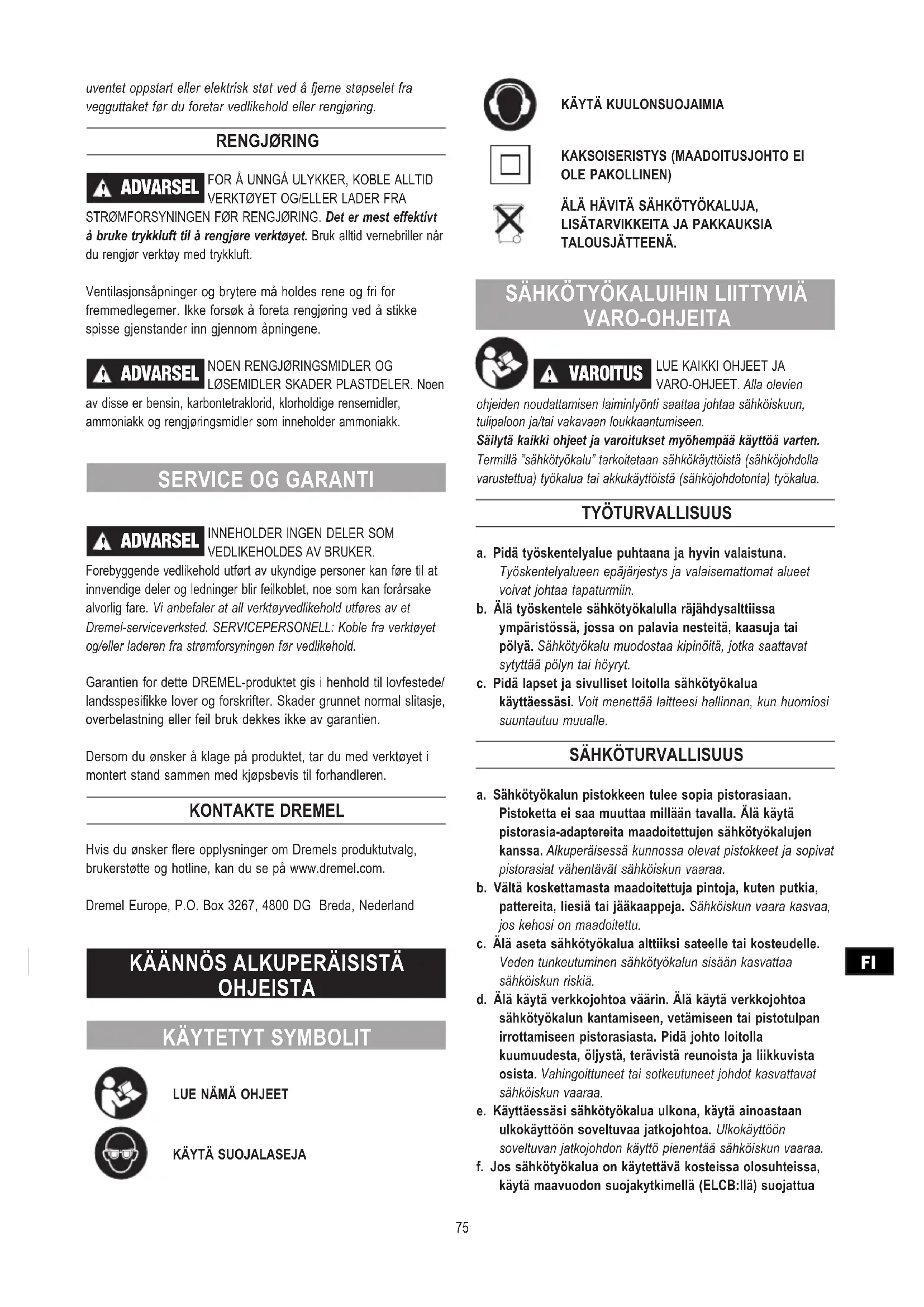 VAROITUS TYÖKALUN SISÄLLÄ EI OLE KÄYTTÄJÄN HUOLLETTAVIA OSIA. Valtuuttamattomien henkilöiden suorittamat ennaltaehkäiset huoltotoimet voivat johtaa sisäisten johtojen ja osien väärään sijoittamiseen, mikä voi aiheuttaa vakavan vaaran. Suosittelemme, että Dremelin huoltopalvelu suorittaa kaikki työkalun huoltotoimenpiteet. HUOLTOTEKNIKOT: Työkalu ja/tai laturi on irrotettava virtalähteestä ennen huoltoa. Tällä DREMEL-tuotteella on lakisääteinen / maakohtaisten säännösten mukainen takuu. Normaalista kulumisesta johtuvat vauriot, ylikuormitus ja väärä käsittely ovat tämän takuun ulkopuolella. Jos haluat tehdä valituksen, lähetä työkalu tai laturi purkamattomana yhdessä ostokuitin kanssa jälleenmyyjälle. DREMELIN YHTEYSTIEDOT Lisätietoja Dremelin tuotevalikoimasta, tuesta ja hotlinesta on osoitteessa www.dremel.com. Dremel Europe, P.O. Box 3267, 4800 DG Breda, Alankomaat