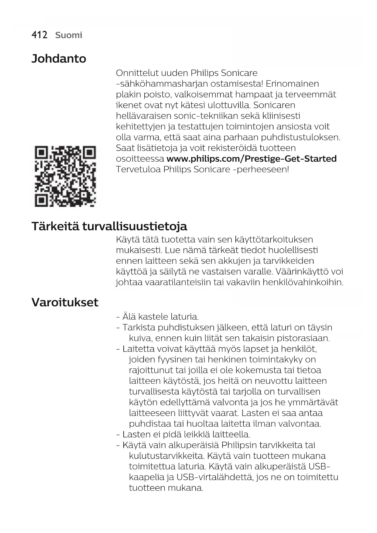 Suomi Johdanto Onnittelut uuden Philips Sonicare ‑sähköhammasharjan ostamisesta! Erinomainen plakin poisto, valkoisemmat hampaat ja terveemmät ikenet ovat nyt kätesi ulottuvilla. Sonicaren hellävaraisen sonic-tekniikan sekä kliinisesti kehitettyjen ja testattujen toimintojen ansiosta voit olla varma, että saat aina parhaan puhdistustuloksen. Saat lisätietoja ja voit rekisteröidä tuotteen osoitteessa www.philips.com/Prestige-Get-Started Tervetuloa Philips Sonicare ‑perheeseen! Tärkeitä turvallisuustietoja Käytä tätä tuotetta vain sen käyttötarkoituksen mukaisesti. Lue nämä tärkeät tiedot huolellisesti ennen laitteen sekä sen akkujen ja tarvikkeiden käyttöä ja säilytä ne vastaisen varalle. Väärinkäyttö voi johtaa vaaratilanteisiin tai vakaviin henkilövahinkoihin. Varoitukset - Älä kastele laturia. - Tarkista puhdistuksen jälkeen, että laturi on täysin kuiva, ennen kuin liität sen takaisin pistorasiaan. - Laitetta voivat käyttää myös lapset ja henkilöt, joiden fyysinen tai henkinen toimintakyky on rajoittunut tai joilla ei ole kokemusta tai tietoa laitteen käytöstä, jos heitä on neuvottu laitteen turvallisesta käytöstä tai tarjolla on turvallisen käytön edellyttämä valvonta ja jos he ymmärtävät laitteeseen liittyvät vaarat. Lasten ei saa antaa puhdistaa tai huoltaa laitetta ilman valvontaa. - Lasten ei pidä leikkiä laitteella. - Käytä vain alkuperäisiä Philipsin tarvikkeita tai kulutustarvikkeita. Käytä vain tuotteen mukana toimitettua laturia. Käytä vain alkuperäistä USB- kaapelia ja USB-virtalähdettä, jos ne on toimitettu tuotteen mukana.413 Suomi - Laitteessa ei ole käyttäjän huollettavissa olevia osia. Jos laite on vahingoittunut, lopeta sen käyttö ota yhteyttä maasi kuluttajapalvelukeskukseen (katso 'Takuu ja tuki'). Jos johto on vaurioitunut, vaihda laturi uuteen. - Älä käytä laturia ulkona tai lämmönlähteiden lähellä. - Älä puhdista mitään tuotteen osaa astianpesukoneessa. - Laite on suunniteltu ainoastaan hampaiden, ikenien ja kielen puhdistamiseen. - Lopeta laitteen käyttö ja kysy neuvoa hammaslääkäriltä tai lääkäriltä, jos käytön jälkeen ilmenee voimakasta verenvuotoa, jos verenvuoto jatkuu viikon käytön jälkeen tai jos laitteen käyttö tuntuu epämukavalta tai aiheuttaa kipua. - Jos olet ollut hammas- tai ienleikkauksessa viimeisten kahden kuukauden aikana, kysy neuvoa hammaslääkäriltä ennen laitteen käyttöä. - Jos sinulla on sydämentahdistin tai muu kehonsisäinen laite, kysy neuvoa lääkäriltä tai kyseisen laitteen valmistajalta ennen käyttöä. - Jos epäröit käyttää laitetta terveydellisistä syistä, neuvottele laitteen käytöstä ensin lääkärin kanssa. - Laite on tarkoitettu henkilökohtaiseen käyttöön eikä sitä ole tarkoitettu potilaiden yleiseen käyttöön hammashoitoloissa tai sairaaloissa. - Lopeta harjaspään käyttö, jos ilmenee katkenneita tai taipuneita harjaksia. Vaihda harjaspää 3 kuukauden välein tai useammin, jos ilmenee merkkejä kulumisesta. - Jos käyttämäsi hammastahna sisältää peroksidia, ruokasoodaa tai bikarbonaattia (yleisiä etenkin valkaisevissa hammastahnoissa), puhdista harjaspää huolellisesti saippualla jokaisen käytön jälkeen. Tämä estää muovin halkeamisen. - Vältä suoraa kosketusta tuotteisiin, jotka sisältävät eteerisiä öljyjä tai kookosöljyä. Niiden koskettaminen voi johtaa harjasten irtoamiseen.414 Suomi - Käytä akun lataamiseen vain tuotteen mukana toimitettua USB-sovitinta, latausalustaa ja matkalatauskoteloa: WAA1001, WAA2001, HX9200 or HX9200/B, and TCC1001, TCC2001, TCC3001, CBB1001 tai CBB2001. Älä käytä jatkojohtoa. - Lataa, käytä ja säilytä tuotetta 0-40°C:n lämpötilassa. - Suojaa tuote ja akut tulelta äläkä altista niitä suoralle auringonvalolle tai korkeille lämpötiloille. - Jos tuote kuumenee epätavallisen paljon, siitä tulee hajua, se muuttaa väriä tai jos lataaminen kestää tavallista pidempään, lopeta tuotteen käyttö ja lataaminen ja ota yhteyttä Philipsiin. - Älä laita tuotteita ja niiden paristoja tai akkuja mikroaaltouuneihin tai induktioliesille. - Älä avaa, muuta, puhkaise, vahingoita tai pura tuotetta tai akkuja, sillä tämä saattaa aiheuttaa niiden ylikuumenemisen tai myrkyllisiä tai vaarallisia vuotoja niistä. Älä aiheuta akkuihin oikosulkua, ylilataa niitä tai lataa niitä käänteisesti. - Jos paristot tai akut ovat vahingoittuneet tai ne vuotavat, vältä paristo- tai akkunesteen joutumista iholle tai silmiin. Jos näin kuitenkin käy, huuhtele iho tai silmät välittömästi runsaalla vedellä ja hakeudu lääkäriin. Sähkömagneettiset kentät (EMF) Tämä Philips-laite vastaa kaikkia sähkömagneettisia kenttiä (EMF) koskevia standardeja ja säännöksiä. Radiolaitedirektiivi Philips vakuuttaa täten, että radiotaajuusliittymällä (Bluetooth tai BrushSync) varustetut sähköhammasharjat ovat direktiivin 2014/53/EU ehtojen mukaisia. - Bluetooth-radiotaajuus: 2,4 GHz - Suurin Bluetooth-radiotaajuusteho: 3 dBm - NFC-radiotaajuus: 13,56 MHz - Suurin NFC-radiotaajuusteho: 30,16 dBm415 Suomi EU:n vaatimustenmukaisuusvakuutuksen teksti on kokonaisuudessaan saatavilla osoitteessa www.philips.com/support Käyttötarkoitus Sonicare Prestige ‑sähköhammasharjat on tarkoitettu poistamaan hampaisiin kertynyt plakki ja ruokajäämät hammasmädän ilmenemisen vähentämiseksi sekä suuterveyden parantamiseksi ja ylläpitämiseksi. Prestige-sähköhammasharjat on tarkoitettu kuluttajien kotikäyttöön. Aikuisen on valvottava lasten hammasharjan käyttöä. Philips Sonicare ‑hammasharja 1 Hygieeninen suojus 2 Premium All-in-One ‑harjaspää (A3) 3 BrushSync-merkki 4 Runko 5 Virtapainike 6 Tehon merkkivalo ja piilotettu painike 7 SenseIQ-merkkivalo 8 Harjaspään vaihdon muistutusmerkkivalo 9 Akun merkkivalo 10 Harjauspalautteen merkkivalo 11 Latausalusta 12 Latausteline 13 USB-A-sovitin 14 USB-C-johto 15 Matkalataus