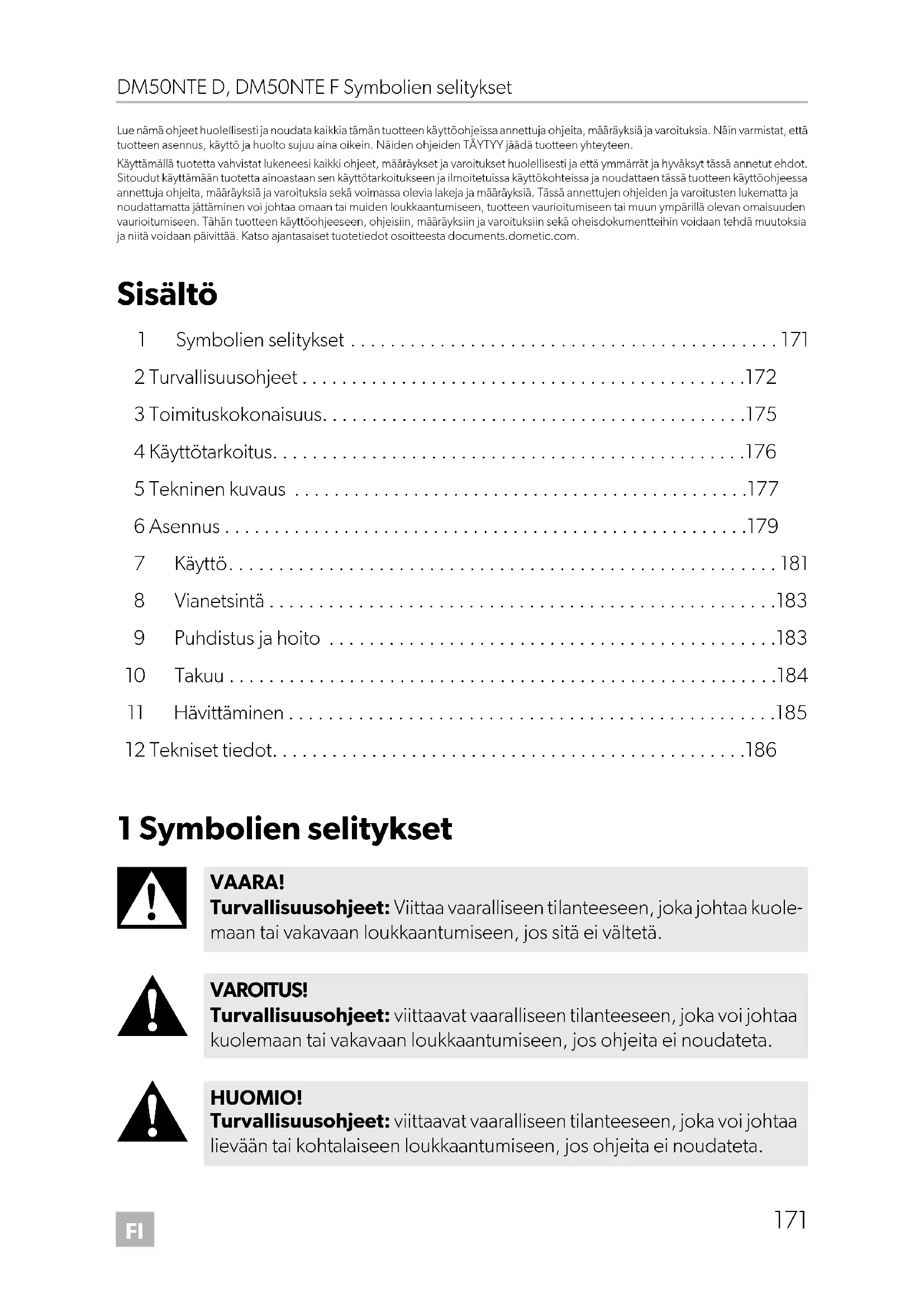 - Lue nämä ohjeet huolellisesti ja noudata kaikkia tämän tuotteen käyttöohjeissa annettuja ohjeita, määräyksiä ja varoituksia. Näin varmistat, että tuotteen asennus, käyttö ja huolto sujuu aina oikein. Näiden ohjeiden TÄYTYY jäädä tuotteen yhteyteen. Käyttämällä tuotetta vahvistat lukeneesi kaikki ohjeet, määräykset ja varoitukset huolellisesti ja että ymmärrät ja hyväksyt tässä annetut ehdot. Sitoudut käyttämään tuotetta ainoastaan sen käyttötarkoitukseen ja ilmoitetuissa käyttökohteissa ja noudattaen tässä tuotteen käyttöohjeessa annettuja ohjeita, määräyksiä ja varoituksia sekä voimassa olevia lakeja ja määräyksiä. Tässä annettujen ohjeiden ja varoitusten lukematta ja noudattamatta jättäminen voi johtaa omaan tai muiden loukkaantumiseen, tuotteen vaurioitumiseen tai muun ympärillä olevan omaisuuden vaurioitumiseen. Tähän tuotteen käyttöohjeeseen, ohjeisiin, määräyksiin ja varoituksiin sekä oheisdokumentteihin voidaan tehdä muutoksia ja niitä voidaan päivittää. Katso ajantasaiset tuotetiedot osoitteesta documents.dometic.com. Sisältö 1 Symbolien selitykset p. 171