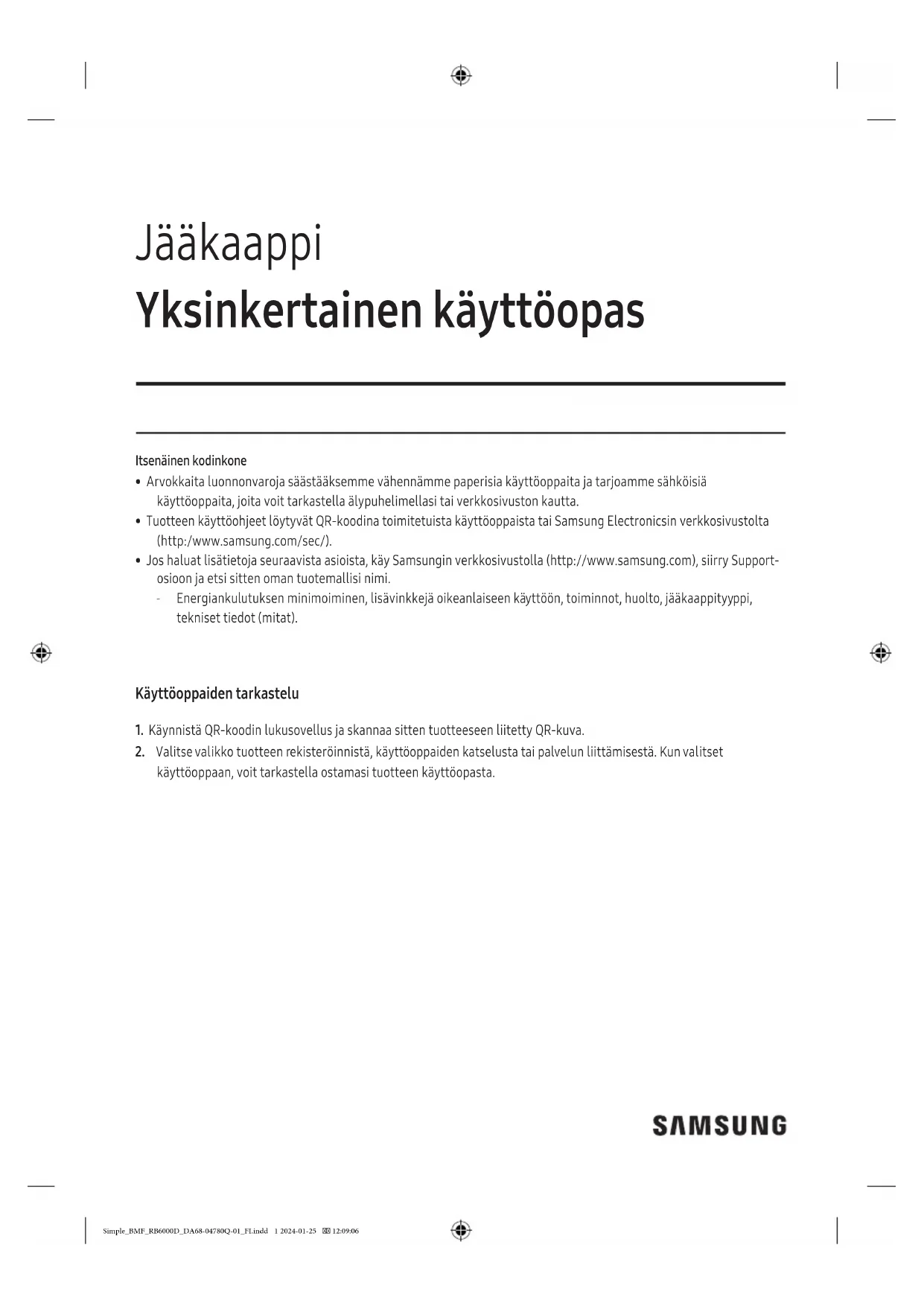 käyttöoppaan, voit tarkastella ostamasi tuotteen käyttöopasta. Simple_BMF_RB6000D_DA68-04780Q-01_FI.indd 1 2024-01-25 12:09:06Sisällysluettelo2 Suomi Sisällysluettelo Turvallisuusohjeet 3 Tärkeitä varotoimenpiteitä 4 Sähkö- ja elektroniikkalaiteromua koskevat ohjeet 8 Turvallisuusopas 8 Asennus 10 Jääkaapin kuvaus 10 Vapaa tila 11 Vaiheittainen asennus 12 Toiminnot 14 SmartThings 14 Huolto 16 Puhdistaminen 16 Liite 17 Turvallisuusohje 17 Asennusohje 17 Lämpötilaohje 17 Tiedot mallista ja varaosien tilaamisesta 19 Simple_BMF_RB6000D_DA68-04780Q-01_FI.indd 2 2024-01-25 12:09:063Turvallisuusohjeet Suomi Turvallisuusohjeet