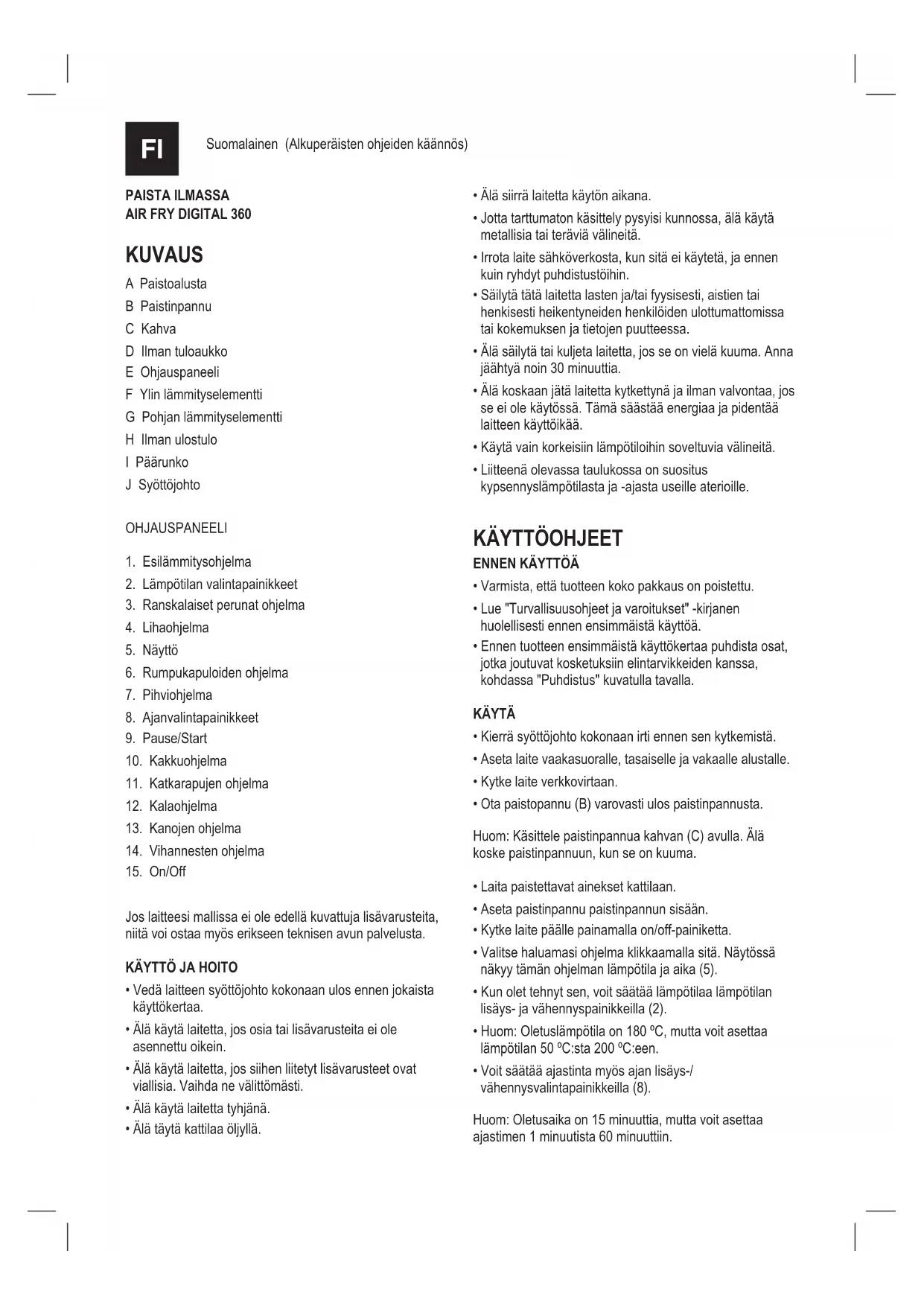 KUVAUS A Paistoalusta B Paistinpannu C Kahva D Ilman tuloaukko E Ohjauspaneeli F Ylin lämmityselementti G Pohjan lämmityselementti H Ilman ulostulo I Päärunko J Syöttöjohto OHJAUSPANEELI
