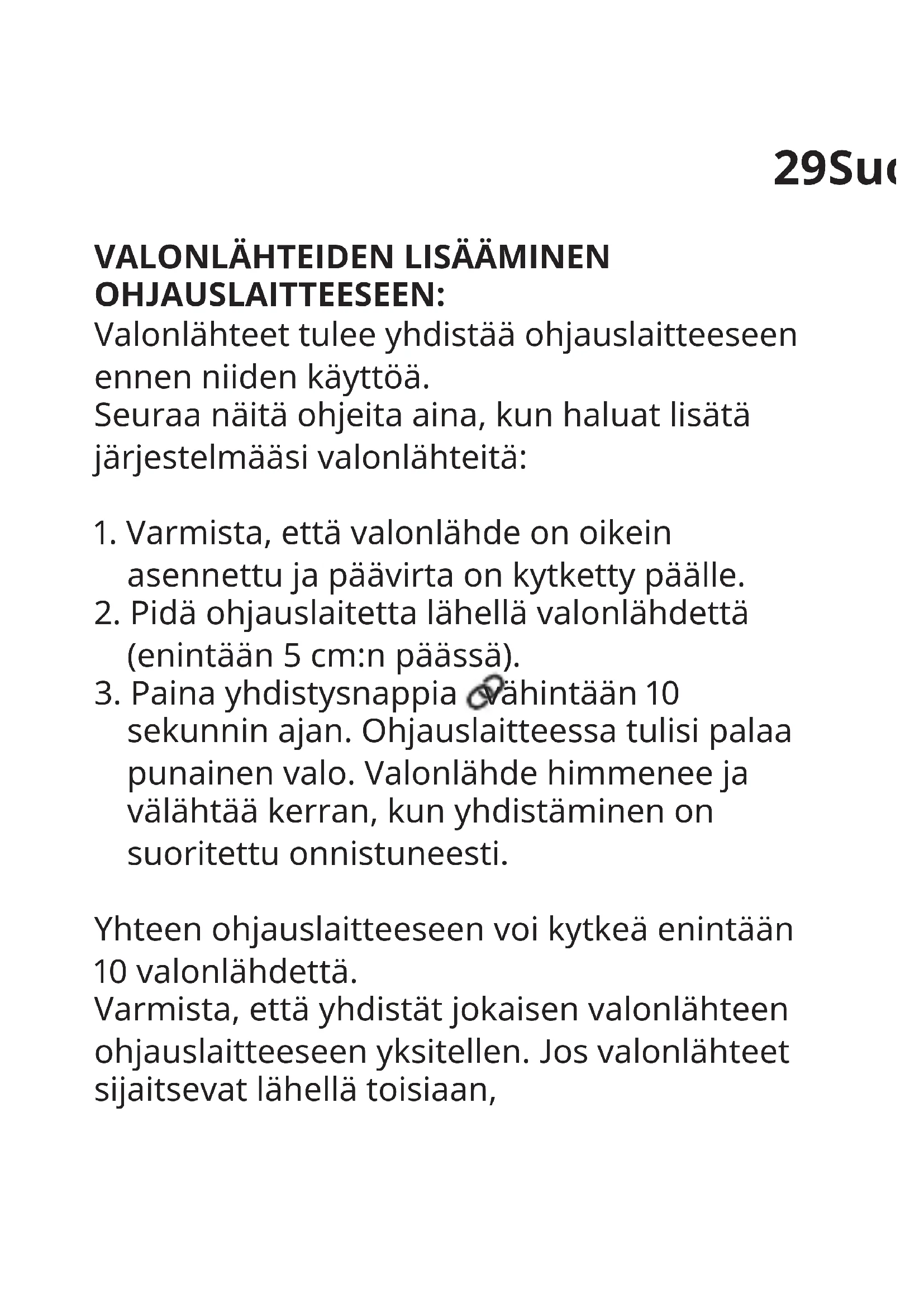 sekunnin ajan. Ohjauslaitteessa tulisi palaa punainen valo. Valonlähde himmenee ja välähtää kerran, kun yhdistäminen on suoritettu onnistuneesti. Yhteen ohjauslaitteeseen voi kytkeä enintään 10 valonlähdettä. Varmista, että yhdistät jokaisen valonlähteen ohjauslaitteeseen yksitellen. Jos valonlähteet sijaitsevat lähellä toisiaan,30 kytke virta pois niistä, jotka olet jo yhdistänyt ohjauslaitteeseen. VAROITUS: