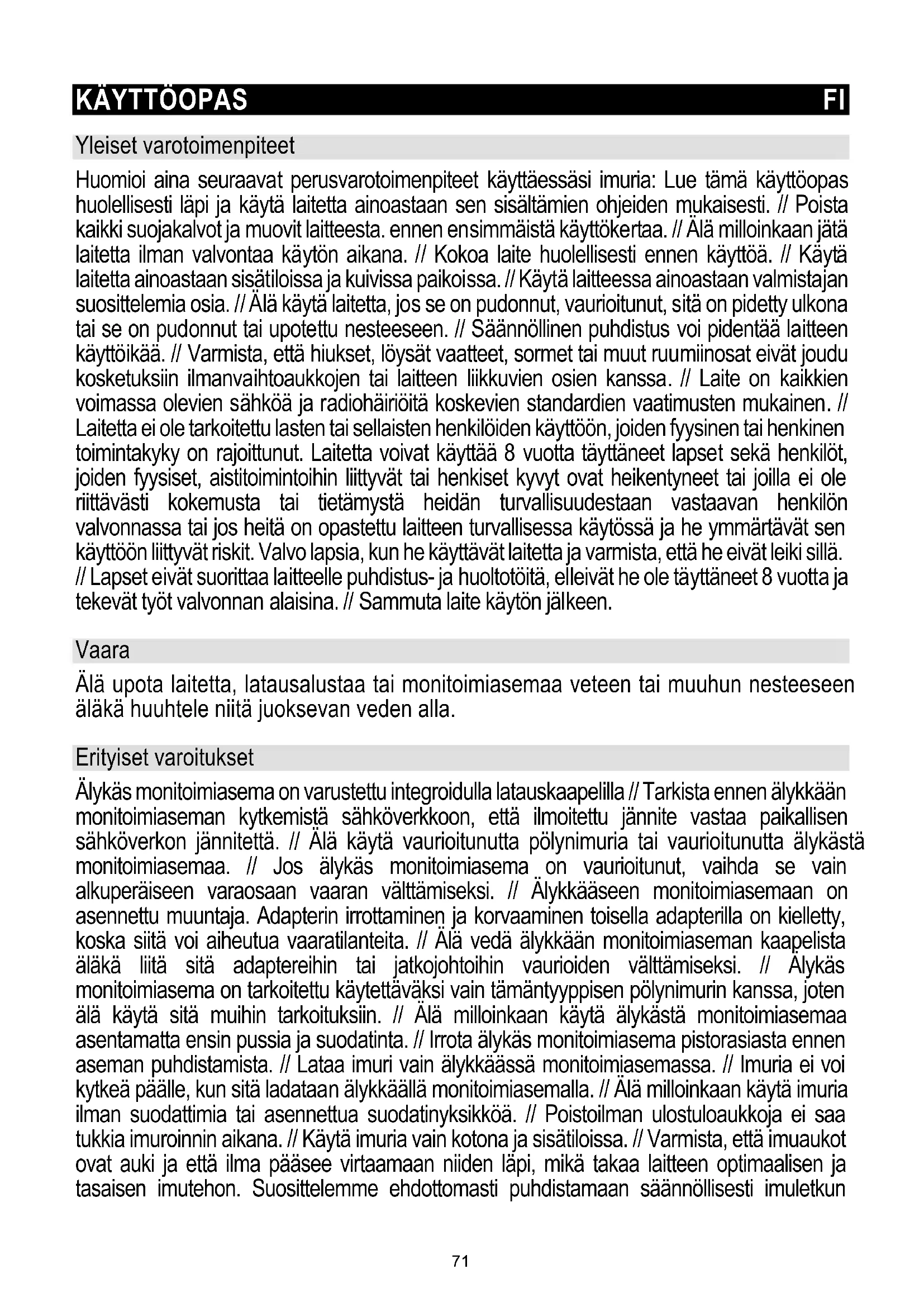 Yleiset varotoimenpiteet Huomioi aina seuraavat perusvarotoimenpiteet käyttäessäsi imuria: Lue tämä käyttöopas huolellisesti läpi ja käytä laitetta ainoastaan sen sisältämien ohjeiden mukaisesti. // Poista kaikki suojakalvot ja muovit laitteesta. ennen ensimmäistä käyttökertaa. // Älä milloinkaan jätä laitetta ilman valvontaa käytön aikana. // Kokoa laite huolellisesti ennen käyttöä. // Käytä laitetta ainoastaan sisätiloissa ja kuivissa paikoissa. // Käytä laitteessa ainoastaan valmistajan suosittelemia osia. // Älä käytä laitetta, jos se on pudonnut, vaurioitunut, sitä on pidetty ulkona tai se on pudonnut tai upotettu nesteeseen. // Säännöllinen puhdistus voi pidentää laitteen käyttöikää. // Varmista, että hiukset, löysät vaatteet, sormet tai muut ruumiinosat eivät joudu kosketuksiin ilmanvaihtoaukkojen tai laitteen liikkuvien osien kanssa. // Laite on kaikkien voimassa olevien sähköä ja radiohäiriöitä koskevien standardien vaatimusten mukainen. // Laitetta ei ole tarkoitettu lasten tai sellaisten henkilöiden käyttöön, joiden fyysinen tai henkinen toimintakyky on rajoittunut. Laitetta voivat käyttää 8 vuotta täyttäneet lapset sekä henkilöt, joiden fyysiset, aistitoimintoihin liittyvät tai henkiset kyvyt ovat heikentyneet tai joilla ei ole riittävästi kokemusta tai tietämystä heidän turvallisuudestaan vastaavan henkilön valvonnassa tai jos heitä on opastettu laitteen turvallisessa käytössä ja he ymmärtävät sen käyttöön liittyvät riskit. Valvo lapsia, kun he käyttävät laitetta ja varmista, että he eivät leiki sillä. // Lapset eivät suorittaa laitteelle puhdistus- ja huoltotöitä, elleivät he ole täyttäneet 8 vuotta ja tekevät työt valvonnan alaisina. // Sammuta laite käytön jälkeen. Vaara Älä upota laitetta, latausalustaa tai monitoimiasemaa veteen tai muuhun nesteeseen äläkä huuhtele niitä juoksevan veden alla. Erityiset varoitukset Älykäs monitoimiasema on varustettu integroidulla latauskaapelilla // Tarkista ennen älykkään monitoimiaseman kytkemistä sähköverkkoon, että ilmoitettu jännite vastaa paikallisen sähköverkon jännitettä. // Älä käytä vaurioitunutta pölynimuria tai vaurioitunutta älykästä monitoimiasemaa. // Jos älykäs monitoimiasema on vaurioitunut, vaihda se vain alkuperäiseen varaosaan vaaran välttämiseksi. // Älykkääseen monitoimiasemaan on asennettu muuntaja. Adapterin irrottaminen ja korvaaminen toisella adapterilla on kielletty, koska siitä voi aiheutua vaaratilanteita. // Älä vedä älykkään monitoimiaseman kaapelista äläkä liitä sitä adaptereihin tai jatkojohtoihin vaurioiden välttämiseksi. // Älykäs monitoimiasema on tarkoitettu käytettäväksi vain tämäntyyppisen pölynimurin kanssa, joten älä käytä sitä muihin tarkoituksiin. // Älä milloinkaan käytä älykästä monitoimiasemaa asentamatta ensin pussia ja suodatinta. // Irrota älykäs monitoimiasema pistorasiasta ennen aseman puhdistamista. // Lataa imuri vain älykkäässä monitoimiasemassa. // Imuria ei voi kytkeä päälle, kun sitä ladataan älykkäällä monitoimiasemalla. // Älä milloinkaan käytä imuria ilman suodattimia tai asennettua suodatinyksikköä. // Poistoilman ulostuloaukkoja ei saa tukkia imuroinnin aikana. // Käytä imuria vain kotona ja sisätiloissa. // Varmista, että imuaukot ovat auki ja että ilma pääsee virtaamaan niiden läpi, mikä takaa laitteen optimaalisen ja tasaisen imutehon. Suosittelemme ehdottomasti puhdistamaan säännöllisesti imuletkun 71avoimet osat sekä poistamaan pölyn, hiukset tai muun ilmavirran tukkeutumiseen johtavan aineksen. // Älä milloinkaan imuroi laitteella palavia hiukkasia tai roskia, tupakantumppeja, tulitikkuja, nesteitä (esim. vesi, mattovaahto) tai teräviä tai teräväkärkisiä esineitä (lasinsirut jne.) // Älä milloinkaan tuo imuletkua tai laitteen avointa osaa lähelle kasvojasi tai vartaloasi. // Älä milloinkaan käytä imuria rakennusmateriaalien (kuten hieno hiekka, kalkki, sementtipöly, värijauhe jne.) imurointiin. Seurauksena saattaa olla laitteen vaurioituminen. Ongelmat ja niiden ratkaisu Ongelma Mahdollinen syy Ratkaisu Imuri ei toimi. Akku on tyhjä. Käsipölynimuria ei ole asennettu oikein. Lataa akku. Kokoa käsipölynimuri oikein. Imuteho on laskenut. Pölyastia on täynnä. tukkeutunut. Ilman tulovirtaus on tukkeutunut tai sähköharjan rulla jumiutunut. Poista pöly. Puhdista tai vaihda. Puhdista sähköinen harja. Käsipölynimuri ei lataa. Laturia ei ole liitetty pistorasiaan. Laturin liitintä ei ole liitetty rungon liitäntään. Käsipölynimuria ei ole asennettu runkoon. Liitä laturi pistorasiaan. Liitä laturi käsipölynimurin runkoon. Kiinnitä käsipölynimuri runkoon. Käyttö hyvin lyhyen ajan kuluessa latauksesta. Latausaika ei riittävän pitkä. Akku alkaa vanhentua. Lataa ohjeiden mukaisesti. Vaihda akku. Ympäristö Älä hävitä laitetta normaalin kotitalousjätteen mukana sen käyttöiän päätyttyä. Toimita laite kierrätykseen viralliseen keräyspisteeseen Tekemällä näin autat säästämään ympäristöä. Tämä tuote on merkitty Euroopan parlamentin ja neuvoston sähkö- ja laiteromusta antaman direktiivin 2012/19/EY (WEEE) mukaisesti. Ohje perustuu koko Euroopan käsittävään sähkö- ja laiteromun palautusta ja kierrätystä koskevaan sopimukseen. Takuu ja huolto Jos tarvitset tietoja, tai jos sinulla on ongelma, ota yhteyttä Hisense maassasi sijaitsevaan asiakaspalvelukeskukseen (puhelinnumero on maailmanlaajuisessa takuulehtisessä). Jos maassasi ei ole asiakaspalvelukeskusta, käy paikallisen Hisense -kauppiaasi luona tai ota yhteyttä Hisense kotitalouslaitteiden huolto-osastoon. Huomaa: Pölynimurin akun takuu on 12 kuukautta. Vain yksityiseen käyttöön!