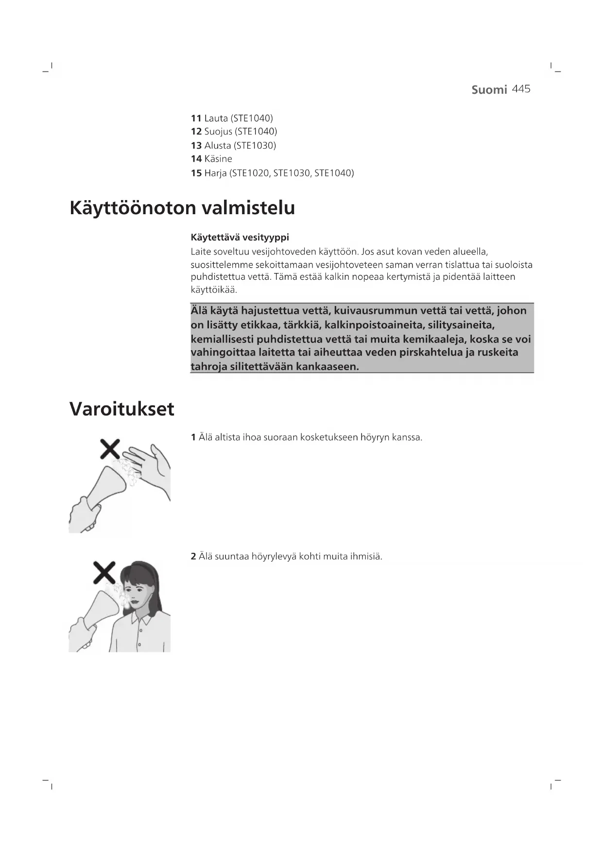1 Höyrystimen pää 2 Höyryletku 3 Höyrystimen telakka 4 Ripustin (STE1011, STE1020, STE1030, STE1040) 5 Varren lukitsin 6 Varsi 7 Höyryvalitsin 8 Jalusta 9 Kalkinpoistonuppi 10 Vesisäiliö445 Suomi 11 Lauta (STE1040) 12 Suojus (STE1040) 13 Alusta (STE1030) 14 Käsine 15 Harja (STE1020, STE1030, STE1040) Käyttöönoton valmistelu Käytettävä vesityyppi Laite soveltuu vesijohtoveden käyttöön. Jos asut kovan veden alueella, suosittelemme sekoittamaan vesijohtoveteen saman verran tislattua tai suoloista puhdistettua vettä. Tämä estää kalkin nopeaa kertymistä ja pidentää laitteen käyttöikää. Älä käytä hajustettua vettä, kuivausrummun vettä tai vettä, johon on lisätty etikkaa, tärkkiä, kalkinpoistoaineita, silitysaineita, kemiallisesti puhdistettua vettä tai muita kemikaaleja, koska se voi vahingoittaa laitetta tai aiheuttaa veden pirskahtelua ja ruskeita tahroja silitettävään kankaaseen. Varoitukset 1 Älä altista ihoa suoraan kosketukseen höyryn kanssa. 2 Älä suuntaa höyrylevyä kohti muita ihmisiä.446 Suomi 3 Älä aseta vaatetta niin, että se on suorassa kosketuksessa höyryn kanssa. 4 Älä käytä höyrystintä siten, että sen pää on suunnattu alaspäin. 5 Älä taivuta letkua, kun höyrytät vaatetta. > 5 min. 6 Älä jätä telinemallista höyrystintä ilman valvontaa yli viiden minuutin ajaksi.447 Suomi
