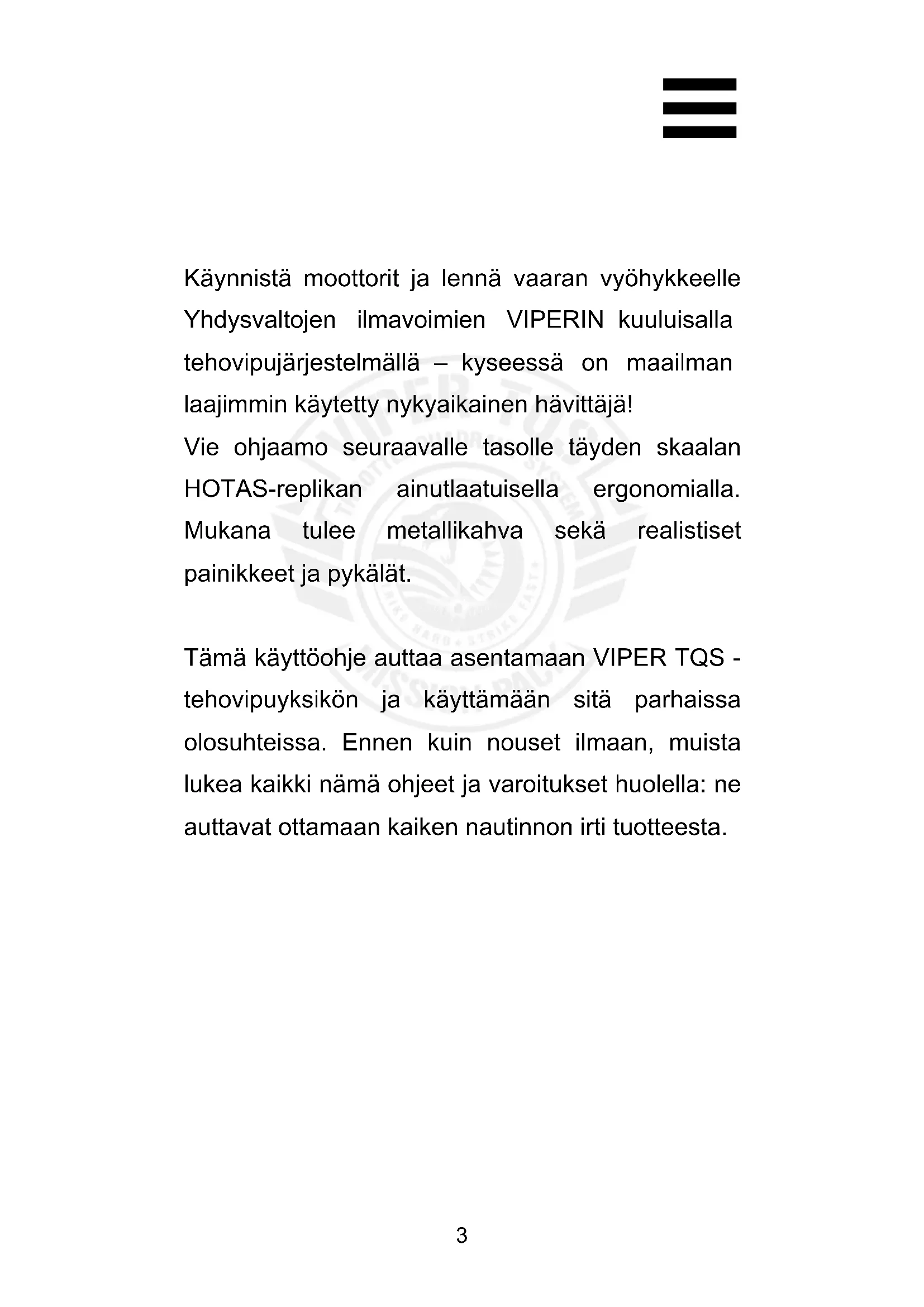Käynnistä moottorit ja lennä vaaran vyöhykkeelle Yhdysvaltojen ilmavoimien VIPERIN kuuluisalla tehovipujärjestelmällä – kyseessä on maailman laajimmin käytetty nykyaikainen hävittäjä! Vie ohjaamo seuraavalle tasolle täyden skaalan HOTAS-replikan ainutlaatuisella ergonomialla. Mukana tulee metallikahva sekä realistiset painikkeet ja pykälät. Tämä käyttöohje auttaa asentamaan VIPER TQS - tehovipuyksikön ja käyttämään sitä parhaissa olosuhteissa. Ennen kuin nouset ilmaan, muista lukea kaikki nämä ohjeet ja varoitukset huolella: ne auttavat ottamaan kaiken nautinnon irti tuotteesta.4