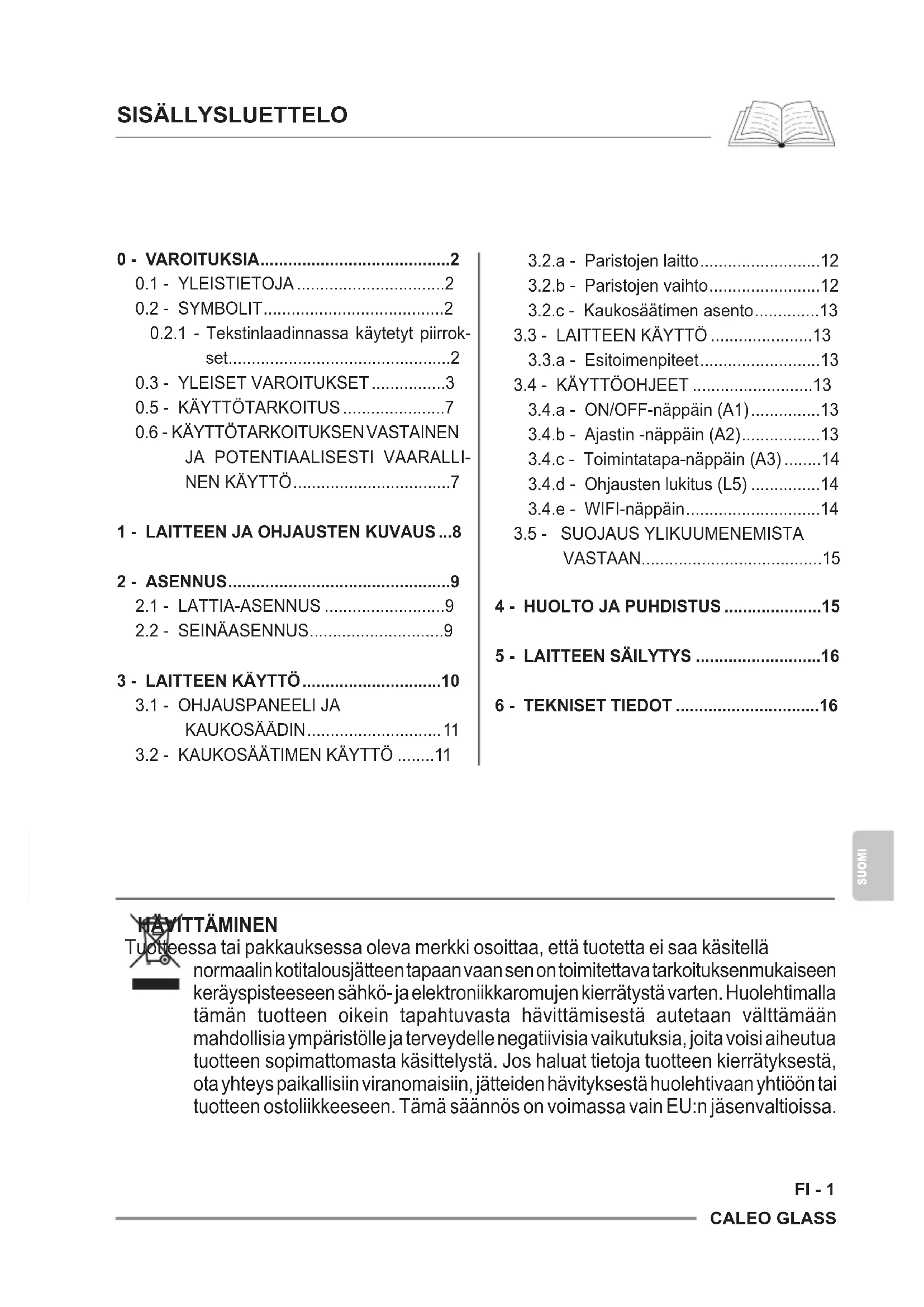 Tätä tuotetta saa käyttää vain tässä käyttöohjeessa annet- tujen ohjeiden mukaisesti. Muu kuin määritetty käyttö voi ai- heuttaa vakavia vammoja. VALMISTAJA EI OTA VASTUUTA HENKILÖ- TAI OMAISUUSVAHIN- GOISTA, JOTKA JOHTUVAT SIITÄ, ETTÄ TÄSSÄ OPPAASSA ANNET- TUJA MÄÄRÄYKSIÄ EI OLE NOUDATETTU.CALEO GLASS SUOMI FI - 9