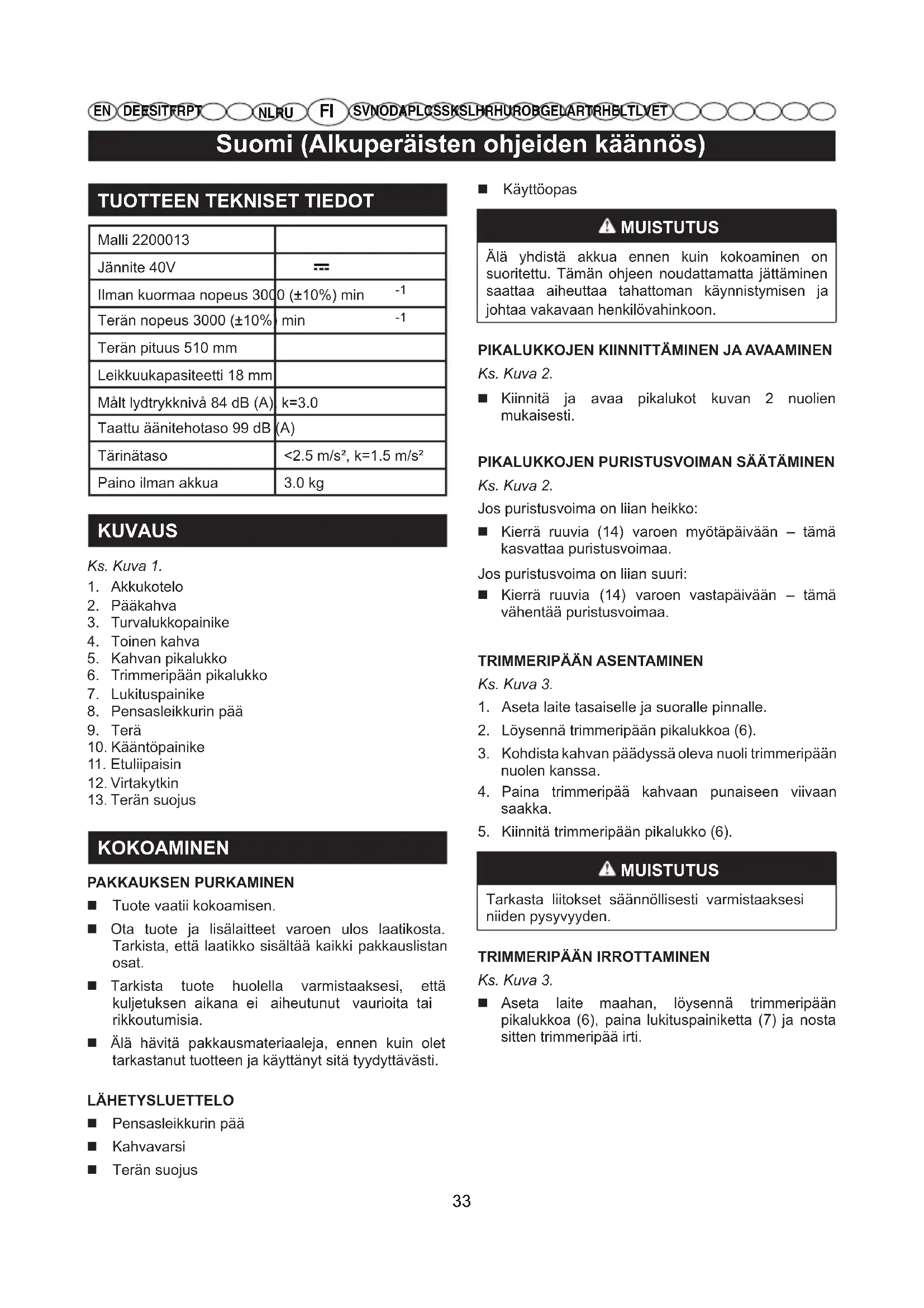 SV NO DA PL CS SK SL HR HU RO BG EL AR TR HE LT LV ET VIKOJEN PAIKANNUS VIKA MAHDOLLINEN SYY KORJAUSTOIMEN- PIDE Moottori pysähtyy työstön aikana. Akkua ei ole asetettu oikein. Varmista, että akku on asetettu oikein. Laite vahingoittunut. Älä käytä laitetta, irrota akku ja ota yhteyttä huoltokeskukseen. Turvalukko- painikkeen ja liipaisimen ollessa painettuina leikkuuterät eivät liiku. Laite vahingoittunut. Laitetta ei saa käyttää. Pysäytä laite välittömästi, irrota akku ja ota yhteyttä huoltokeskukseen. Leikkuuväline kuumenee liikaa työskentelyn aikana. Terien voitelu ei ole riittävä. Pysäytä laite, odota leikkuuvälineen pysähtymistä, irrota akku, voitelu terät. Liiallista melua ja/ tai tärinää työstön aikana. Löystyneitä tai vahingoittuneita osia. Pysäytä laite, irrota akku ja: – tarkista vauriot – tarkista onko laitteessa löystyneitä osia ja kiristä ne – vaihda tai korjaa vaurioituneet osat vastaavilla ominaisuuksilla varustetuilla osilla. Laite savuttaa sen toiminnan aikana. Laite vahingoittunut. Laitetta ei saa käyttää. Pysäytä laite välittömästi, irrota akku ja ota yhteyttä valtuutettuun huoltokeskukseen. 36Svenska(Översättning från originalinstruktioner)
