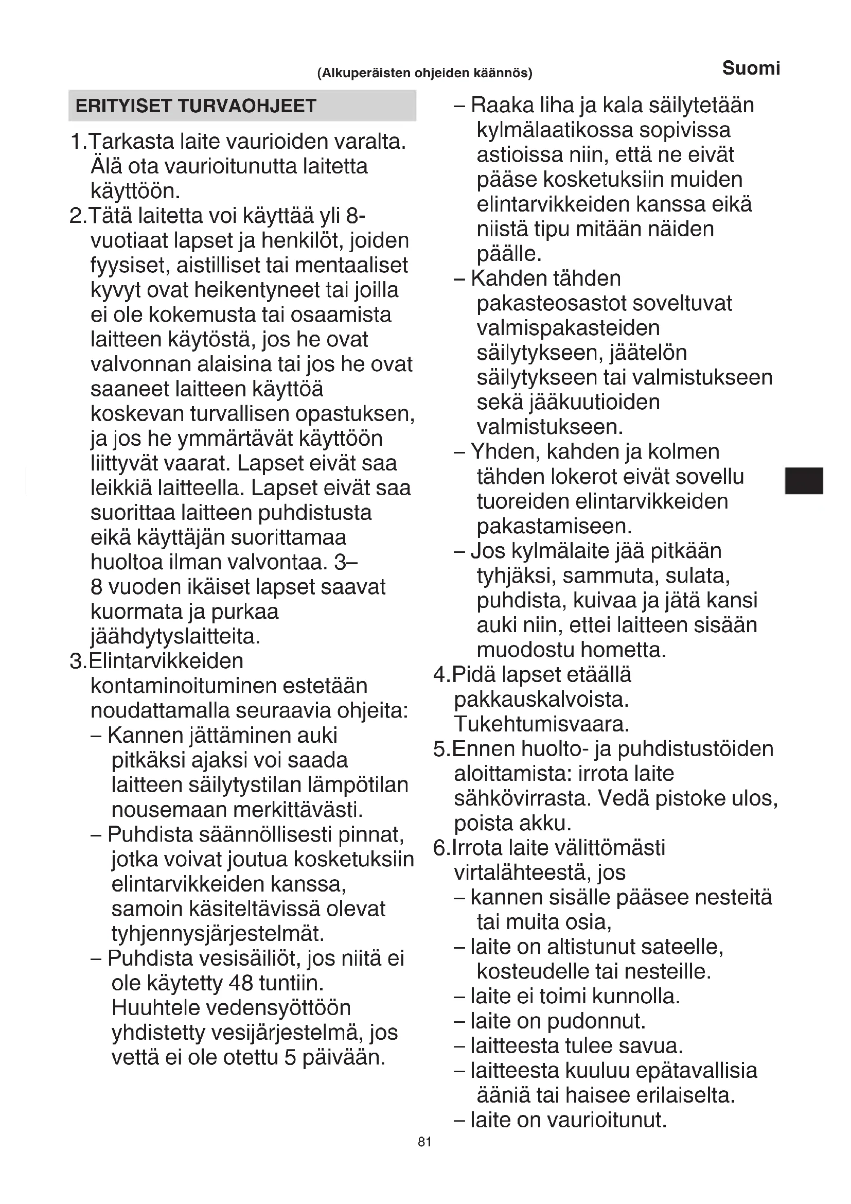 Tata laitetta voi kayttä yli 8- vuotiaat lapset ja henkilöt, joiden fyysiset, aistilliset tai mentalailetok kyvyt ovat heikentyneet tai joilla ei ole kokemusta tai osaamista laitteen kaytosta,Jos he ovat valvonnan alaisina tai jos he ovat saaneet laitteen kayttoa koskevan turvallisen opastuksen, ja Jos he ymmartavat kayttoon liittyvat vaarat. Lapset eivat saa leikkä laitteella. Lapset eivat saa suorittaa laitteen puhdistusa eikä kayttäjan suorittamaa huoltoa ilman valontaa.3- 8 vuoden ikäiset lapset saavat kuormata ja purkaa jäahdytyslaitteita.