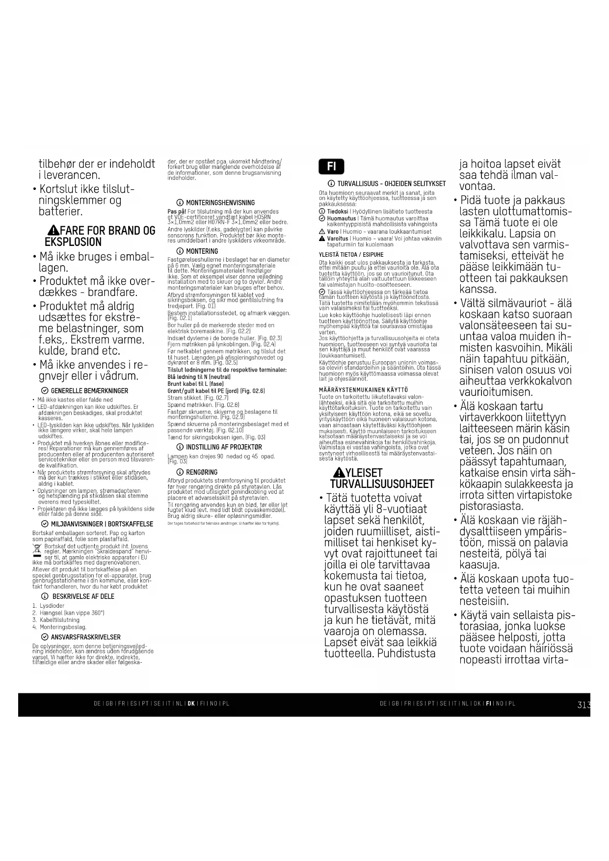 Välta silmävauriot - ala koskaan katso suoraan valonsäteeseen tai suuntaa valoa muiden ihmisten kasvoihin. Mikälinän tapahtuu pitkään, sinisen valon osuus voi aiheuttaa verkkokalvon vaurioitumisen. - Alä koskaan tartu virtavernkoon liitettyyn laitteeseen mariin kasin tai, jos se on pudonnut veteen. Jos nain on paassyt tapahtumaan, katkaise ensin virta sahkoapain sulakkeesta ja irrota sitten virtapistoke pistorasiasta.