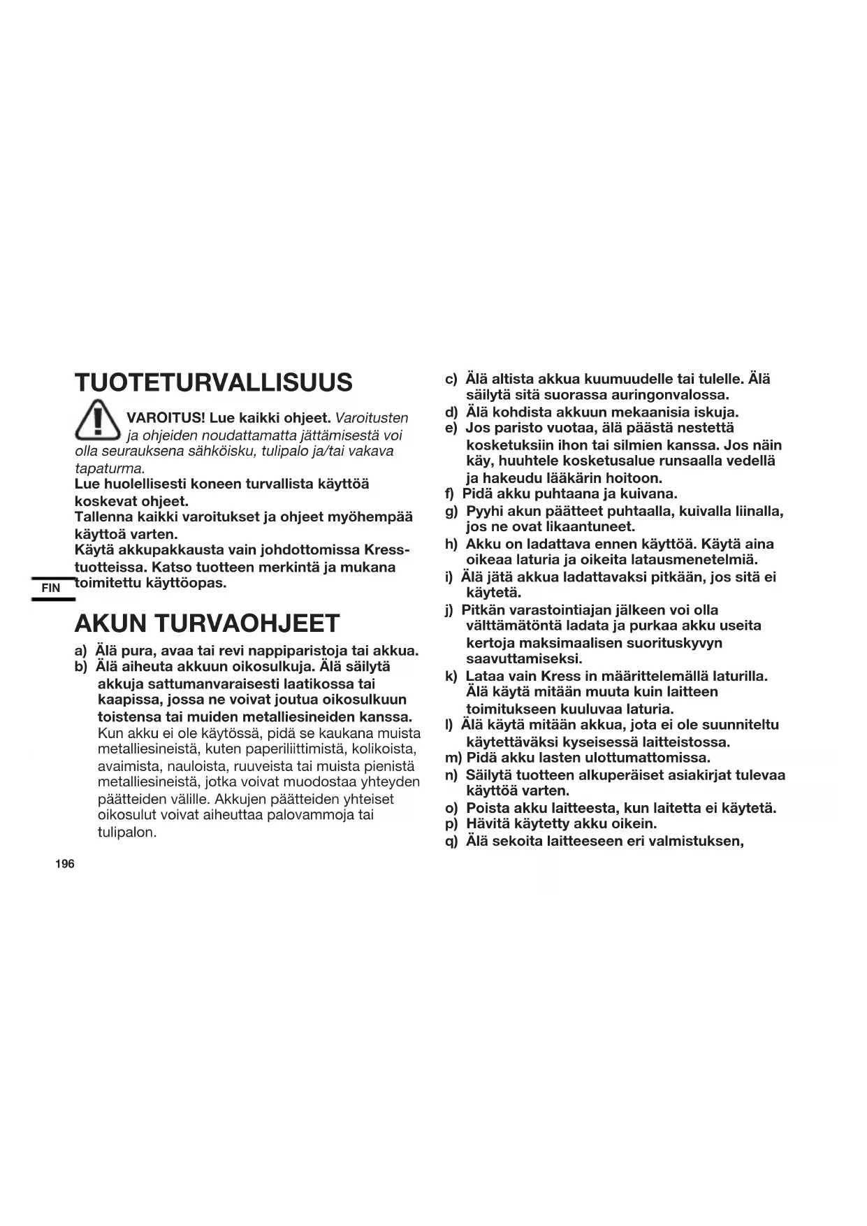 käytetä. j) Pitkän varastointiajan jälkeen voi olla välttämätöntä ladata ja purkaa akku useita kertoja maksimaalisen suorituskyvyn saavuttamiseksi. k) Lataa vain Kress in määrittelemällä laturilla. Älä käytä mitään muuta kuin laitteen toimitukseen kuuluvaa laturia. l) Älä käytä mitään akkua, jota ei ole suunniteltu käytettäväksi kyseisessä laitteistossa. m) Pidä akku lasten ulottumattomissa. n) Säilytä tuotteen alkuperäiset asiakirjat tulevaa käyttöä varten. o) Poista akku laitteesta, kun laitetta ei käytetä. p) Hävitä käytetty akku oikein. q) Älä sekoita laitteeseen eri valmistuksen,197 FIN kapasiteetin, koon tai tyypin paristoja. r) Pidä akku poissa mikroaaltojen ja korkean paineen vaikutusalueelta. s) Varoitus! Älä käytä akkuja, joita ei voi ladata (paristoja). KAUPALLISTA AKKUYKSIKKÖÄ