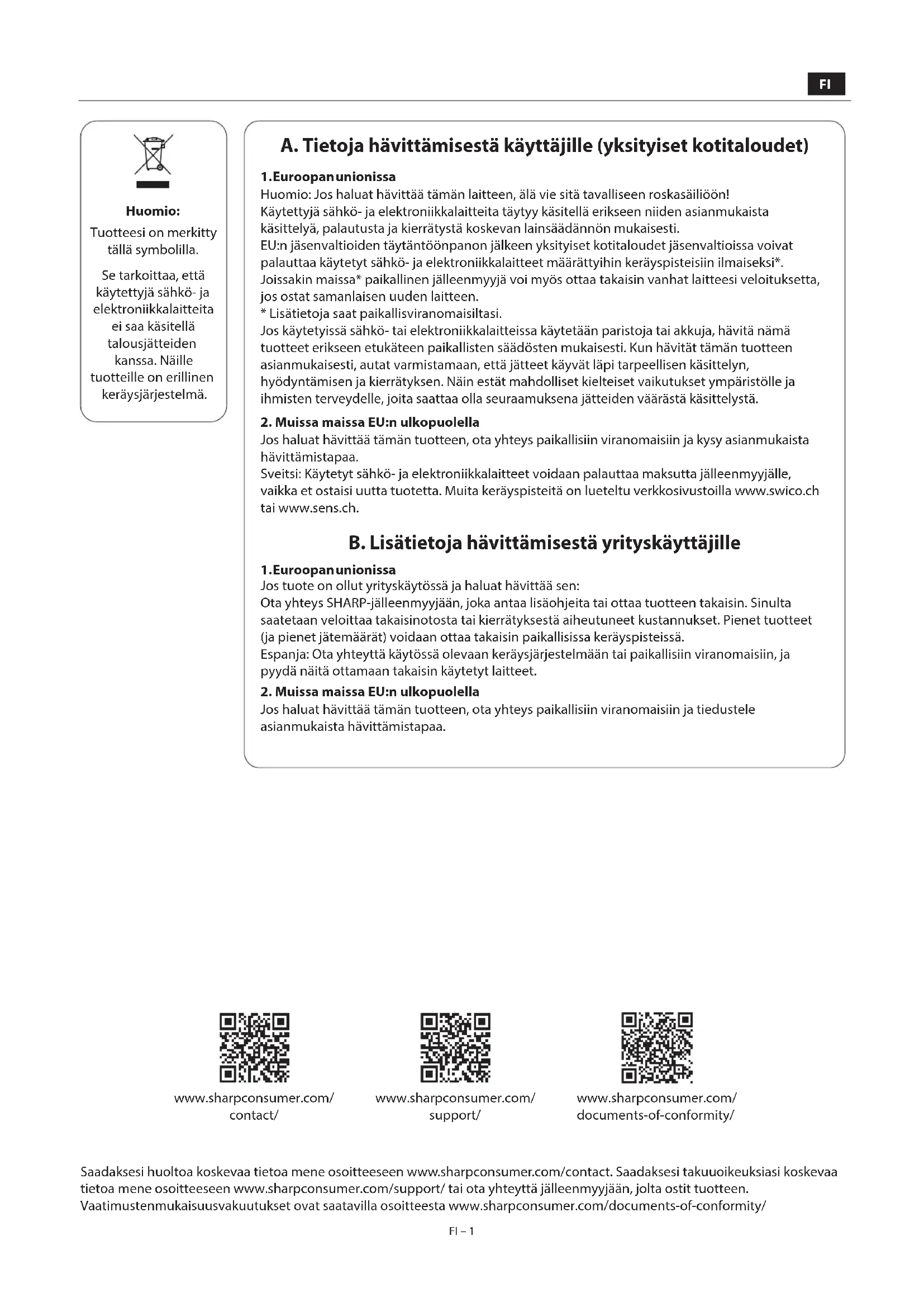 FI – 1 FI – 1 A. Tietoja hävittämisestä käyttäjille (yksityiset kotitaloudet)