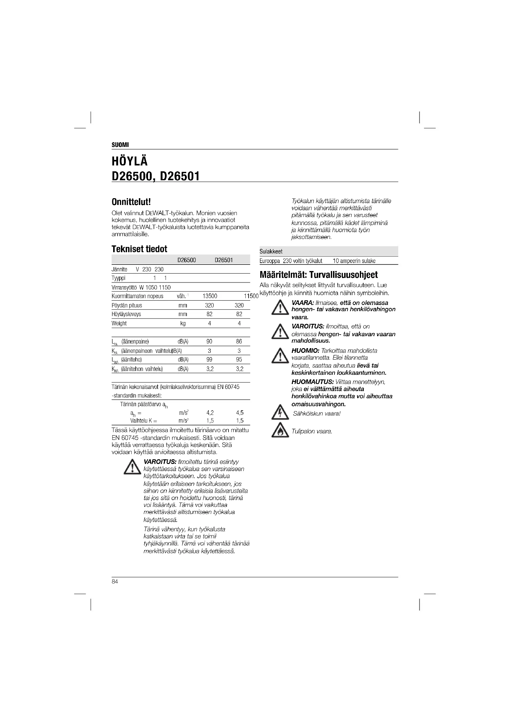 HÖYLÄ D26500, D26501 Onnittelut! Olet valinnut DEWALT-työkalun. Monien vuosien kokemus, huolellinen tuotekehitys ja innovaatiot tekevät DEWALT-työkaluista luotettavia kumppaneita ammattilaisille. Tekniset tiedot D26500 D26501 Jännite V 230 230 Tyyppi 1 1 Virransyöttö W 1050 1150 Kuormittamaton nopeus väh.