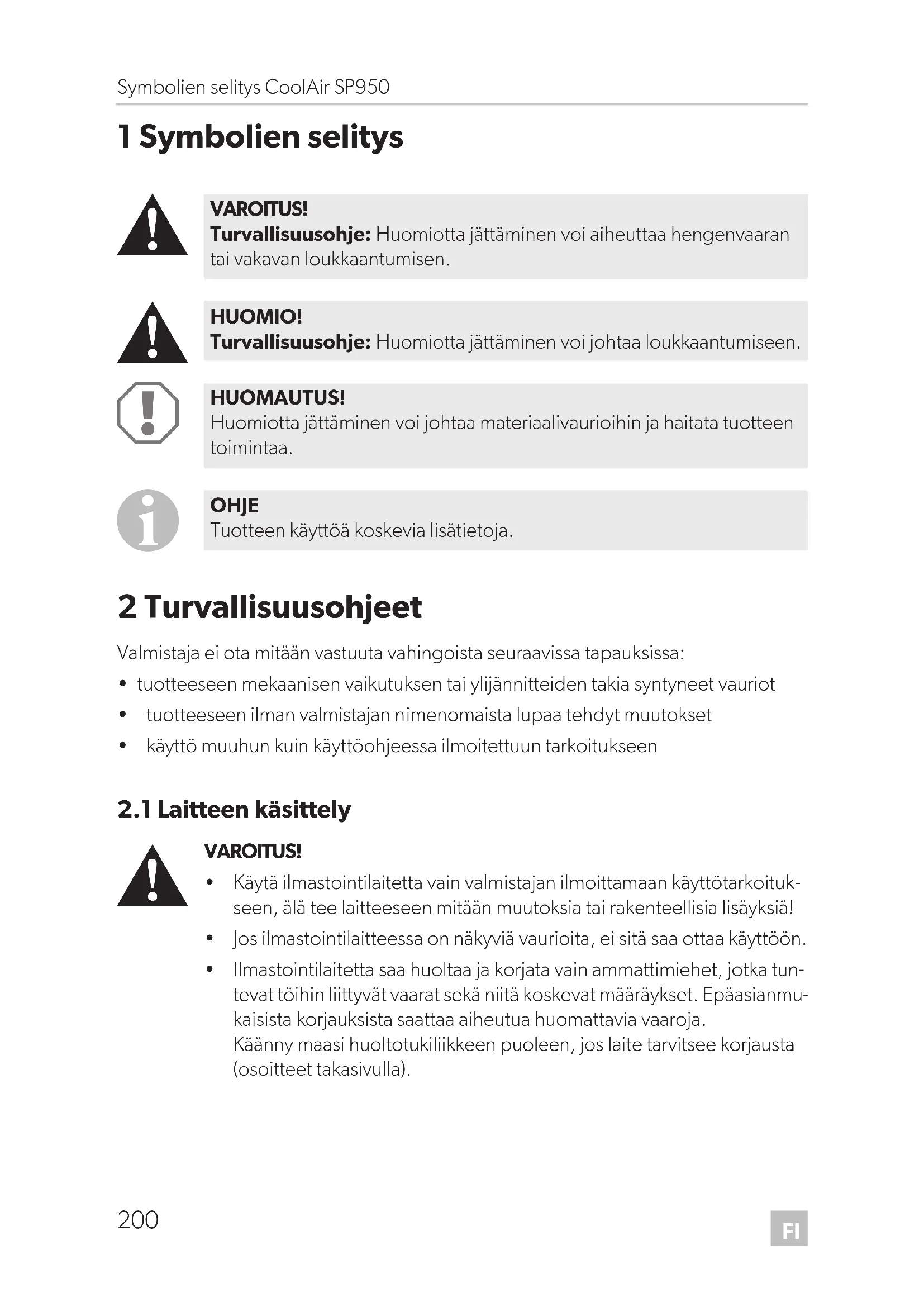 - Ilmastointilaitetta saa huoltaa ja korjata vain ammattimiehet, jotka tun- tevat töihin liittyvät vaarat sekä niitä koskevat määräykset. Epäasianmu- kaisista korjauksista saattaa aiheutua huomattavia vaaroja. Käänny maasi huoltotukiliikkeen puoleen, jos laite tarvitsee korjausta (osoitteet takasivulla). VAROITUS! Turvallisuusohje: Huomiotta jättäminen voi aiheuttaa hengenvaaran tai vakavan loukkaantumisen. HUOMIO! Turvallisuusohje: Huomiotta jättäminen voi johtaa loukkaantumiseen. HUOMAUTUS! Huomiotta jättäminen voi johtaa materiaalivaurioihin ja haitata tuotteen toimintaa. OHJE Tuotteen käyttöä koskevia lisätietoja. SP950-O-16s.book Seite 200 Freitag, 24. Februar 2017 4:26 16FI CoolAir SP950 Turvallisuusohjeet
