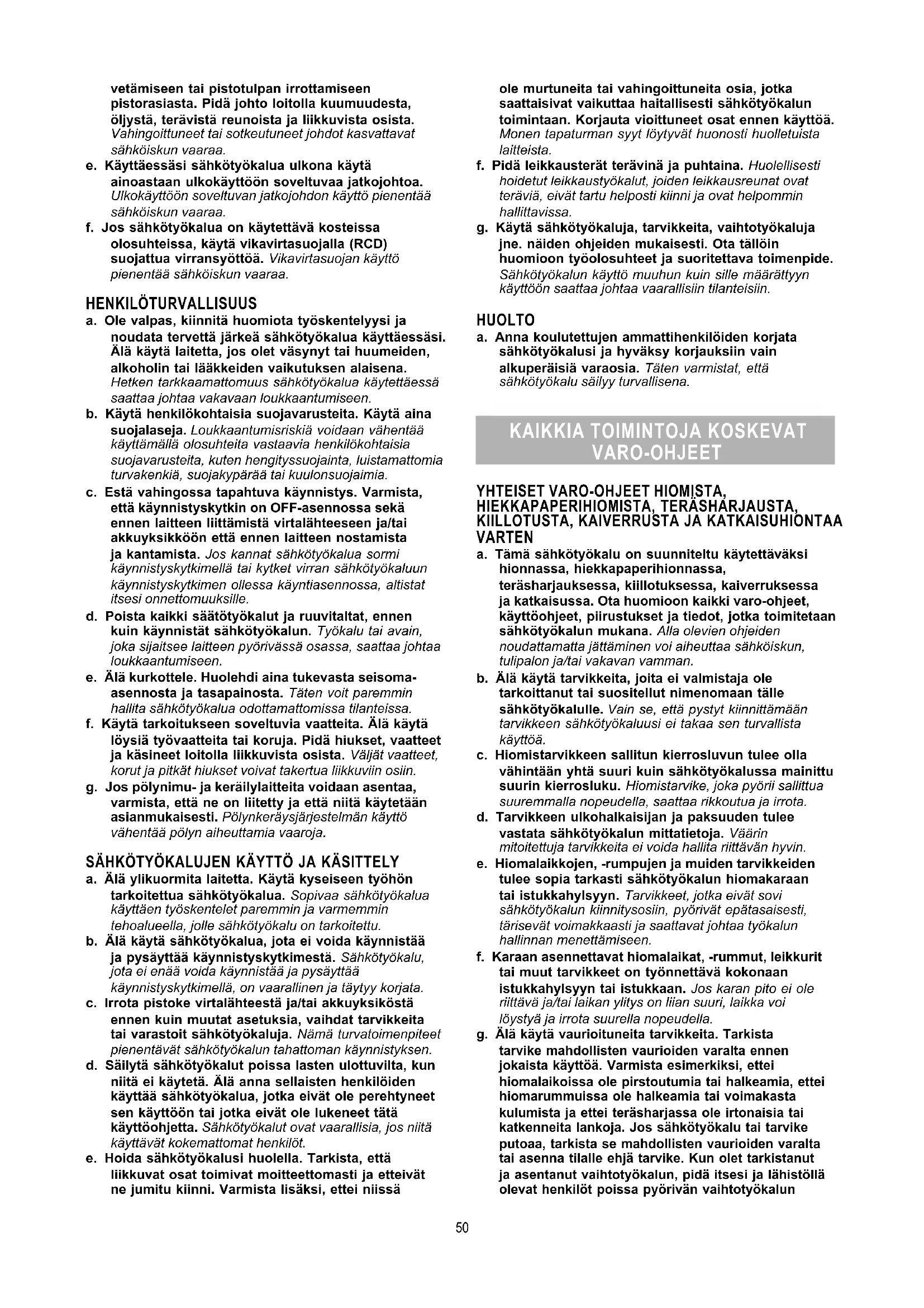 a. Sähkötyökalun pistotulpan tulee sopia pistorasiaan. Pistotulppaa ei saa muuttaa millään tavalla. Älä käytä pistorasia-adaptereita maadoitettujen sähkötyökalujen kanssa. Alkuperäisessä kunnossa olevat pistotulpat ja sopivat pistorasiat vähentävät sähköiskun vaaraa.b. Vältä koskettamasta maadoitettuja pintoja, kuten putkia, pattereita, liesiä tai jääkaappeja. Sähköiskun vaara kasvaa, jos kehosi on maadoitettu.c. Älä aseta sähkötyökalua alttiiksi sateelle tai kosteudelle. Veden tunkeutuminen sähkötyökalun sisään kasvattaa sähköiskun riskiä.d. Älä käytä verkkojohtoa väärin. Älä käytä verkkojohtoa sähkötyökalun kantamiseen, 49vetämiseen tai pistotulpan irrottamiseen pistorasiasta. Pidä johto loitolla kuumuudesta, öljystä, terävistä reunoista ja liikkuvista osista. Vahingoittuneet tai sotkeutuneet johdot kasvattavat sähköiskun vaaraa. e. Käyttäessäsi sähkötyökalua ulkona käytä ainoastaan ulkokäyttöön soveltuvaa jatkojohtoa. Ulkokäyttöön soveltuvan jatkojohdon käyttö pienentää sähköiskun vaaraa. f. Jos sähkötyökalua on käytettävä kosteissa olosuhteissa, käytä vikavirtasuojalla (RCD) suojattua virransyöttöä. Vikavirtasuojan käyttö pienentää sähköiskun vaaraa. HENKILÖTURVALLISUUS a. Ole valpas, kiinnitä huomiota työskentelyysi ja noudata tervettä järkeä sähkötyökalua käyttäessäsi. Älä käytä laitetta, jos olet väsynyt tai huumeiden, alkoholin tai lääkkeiden vaikutuksen alaisena. Hetken tarkkaamattomuus sähkötyökalua käytettäessä saattaa johtaa vakavaan loukkaantumiseen. b. Käytä henkilökohtaisia suojavarusteita. Käytä aina suojalaseja. Loukkaantumisriskiä voidaan vähentää käyttämällä olosuhteita vastaavia henkilökohtaisia suojavarusteita, kuten hengityssuojainta, luistamattomia turvakenkiä, suojakypärää tai kuulonsuojaimia. c. Estä vahingossa tapahtuva käynnistys. Varmista, että käynnistyskytkin on OFF-asennossa sekä ennen laitteen liittämistä virtalähteeseen ja/tai akkuyksikköön että ennen laitteen nostamista ja kantamista. Jos kannat sähkötyökalua sormi käynnistyskytkimellä tai kytket virran sähkötyökaluun käynnistyskytkimen ollessa käyntiasennossa, altistat itsesi onnettomuuksille. d. Poista kaikki säätötyökalut ja ruuvitaltat, ennen kuin käynnistät sähkötyökalun. Työkalu tai avain, joka sijaitsee laitteen pyörivässä osassa, saattaa johtaa loukkaantumiseen. e. Älä kurkottele. Huolehdi aina tukevasta seisoma- asennosta ja tasapainosta. Täten voit paremmin hallita sähkötyökalua odottamattomissa tilanteissa. f. Käytä tarkoitukseen soveltuvia vaatteita. Älä käytä löysiä työvaatteita tai koruja. Pidä hiukset, vaatteet ja käsineet loitolla liikkuvista osista. Väljät vaatteet, korut ja pitkät hiukset voivat takertua liikkuviin osiin. g. Jos pölynimu- ja keräilylaitteita voidaan asentaa, varmista, että ne on liitetty ja että niitä käytetään asianmukaisesti. Pölynkeräysjärjestelmän käyttö vähentää pölyn aiheuttamia vaaroja. SÄHKÖTYÖKALUJEN KÄYTTÖ JA KÄSITTELY a. Älä ylikuormita laitetta. Käytä kyseiseen työhön tarkoitettua sähkötyökalua. Sopivaa sähkötyökalua käyttäen työskentelet paremmin ja varmemmin tehoalueella, jolle sähkötyökalu on tarkoitettu. b. Älä käytä sähkötyökalua, jota ei voida käynnistää ja pysäyttää käynnistyskytkimestä. Sähkötyökalu, jota ei enää voida käynnistää ja pysäyttää käynnistyskytkimellä, on vaarallinen ja täytyy korjata. c. Irrota pistoke virtalähteestä ja/tai akkuyksiköstä ennen kuin muutat asetuksia, vaihdat tarvikkeita tai varastoit sähkötyökaluja. Nämä turvatoimenpiteet pienentävät sähkötyökalun tahattoman käynnistyksen. d. Säilytä sähkötyökalut poissa lasten ulottuvilta, kun niitä ei käytetä. Älä anna sellaisten henkilöiden käyttää sähkötyökalua, jotka eivät ole perehtyneet sen käyttöön tai jotka eivät ole lukeneet tätä käyttöohjetta. Sähkötyökalut ovat vaarallisia, jos niitä käyttävät kokemattomat henkilöt. e. Hoida sähkötyökalusi huolella. Tarkista, että liikkuvat osat toimivat moitteettomasti ja etteivät ne jumitu kiinni. Varmista lisäksi, ettei niissä ole murtuneita tai vahingoittuneita osia, jotka saattaisivat vaikuttaa haitallisesti sähkötyökalun toimintaan. Korjauta vioittuneet osat ennen käyttöä. Monen tapaturman syyt löytyvät huonosti huolletuista laitteista. f. Pidä leikkausterät terävinä ja puhtaina. Huolellisesti hoidetut leikkaustyökalut, joiden leikkausreunat ovat teräviä, eivät tartu helposti kiinni ja ovat helpommin hallittavissa. g. Käytä sähkötyökaluja, tarvikkeita, vaihtotyökaluja jne. näiden ohjeiden mukaisesti. Ota tällöin huomioon työolosuhteet ja suoritettava toimenpide. Sähkötyökalun käyttö muuhun kuin sille määrättyyn käyttöön saattaa johtaa vaarallisiin tilanteisiin. HUOLTO a. Anna koulutettujen ammattihenkilöiden korjata sähkötyökalusi ja hyväksy korjauksiin vain alkuperäisiä varaosia. Täten varmistat, että sähkötyökalu säilyy turvallisena.