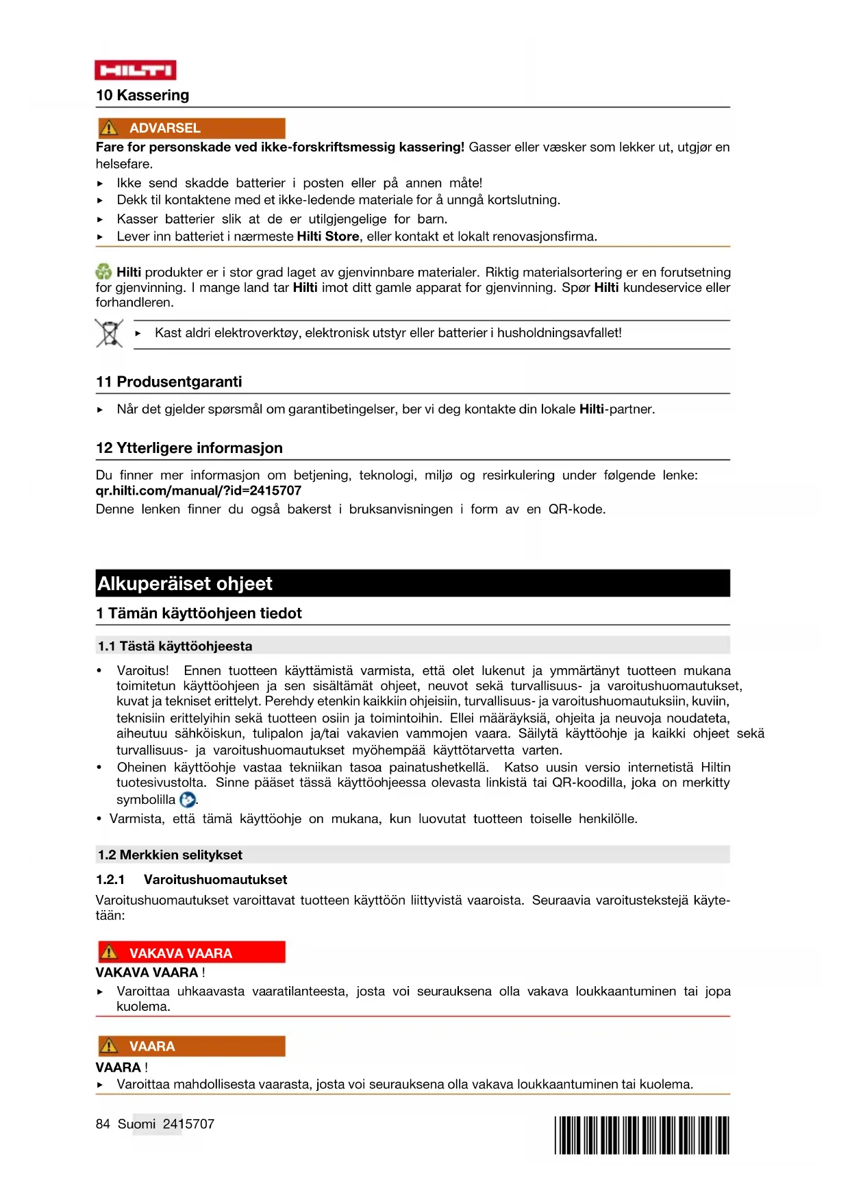 - Hilti-litiumioniakkujen käsittely Skannaamalla QR-koodin pääset suoraan käyttö- ohjeeseen.
