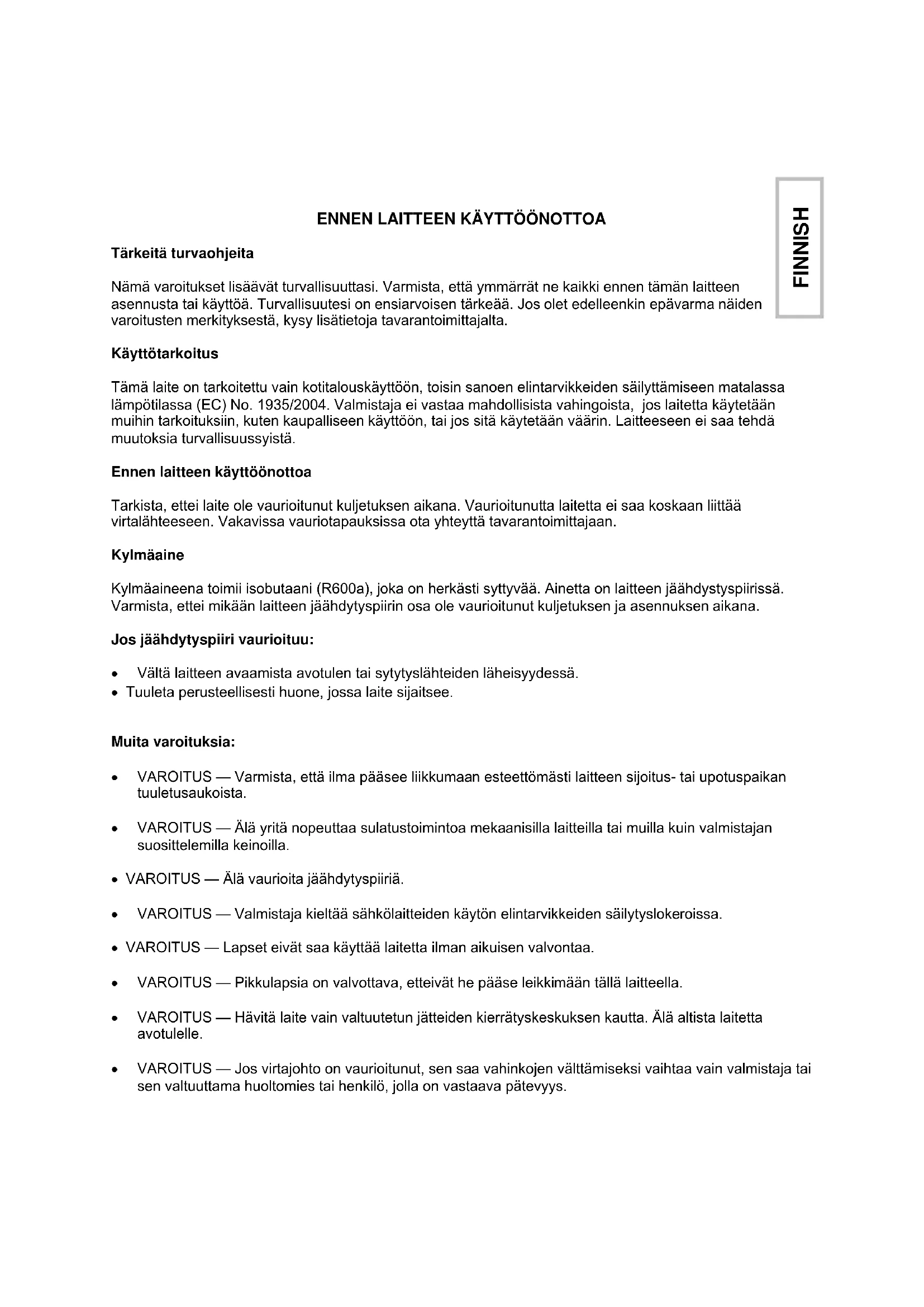 Kylmäineena toimii isobutaani (R600a), joka on herkästi syttyvä. Ainetta on laitteen jähdystyspirissä. Varmista, ettei mikaan laitteen jähdtyspirin osa ole vauroitunut kuljetuksen ja asennuksen aikana.