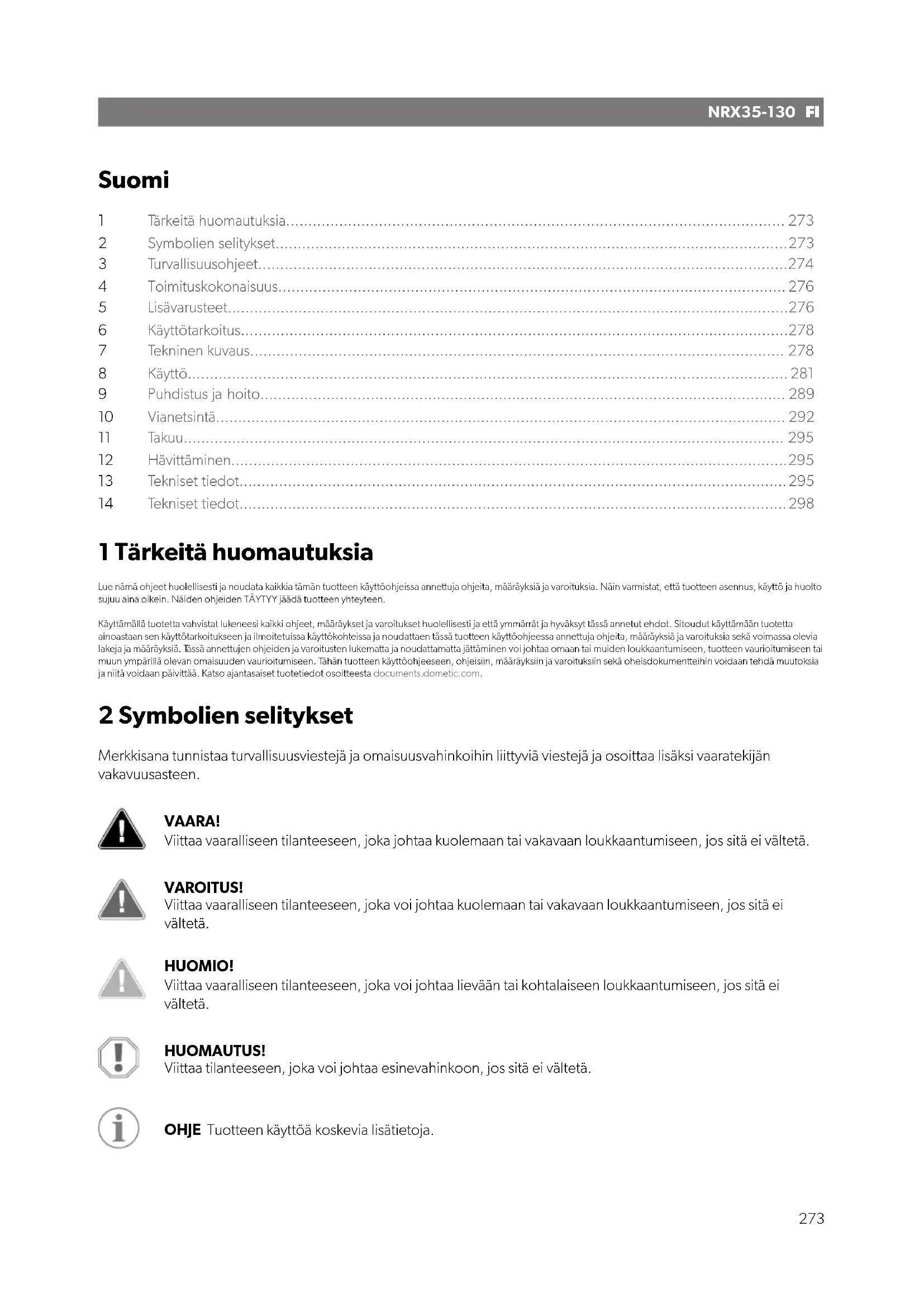 - 14 Tekniset tiedot 1 Tärkeitä huomautuksia Lue nämä ohjeet huolellisesti ja noudata kaikkia tämän tuotteen käyttöohjeissa annettuja ohjeita, määräyksiä ja varoituksia. Näin varmistat, että tuotteen asennus, käyttö ja huolto sujuu aina oikein. Näiden ohjeiden TÄYTYY jäädä tuotteen yhteyteen. Käyttämällä tuotetta vahvistat lukeneesi kaikki ohjeet, määräykset ja varoitukset huolellisesti ja että ymmärrät ja hyväksyt tässä annetut ehdot. Sitoudut käyttämään tuotetta ainoastaan sen käyttötarkoitukseen ja ilmoitetuissa käyttökohteissa ja noudattaen tässä tuotteen käyttöohjeessa annettuja ohjeita, määräyksiä ja varoituksia sekä voimassa olevia lakeja ja määräyksiä. Tässä annettujen ohjeiden ja varoitusten lukematta ja noudattamatta jättäminen voi johtaa omaan tai muiden loukkaantumiseen, tuotteen vaurioitumiseen tai muun ympärillä olevan omaisuuden vaurioitumiseen. Tähän tuotteen käyttöohjeeseen, ohjeisiin, määräyksiin ja varoituksiin sekä oheisdokumentteihin voidaan tehdä muutoksia ja niitä voidaan päivittää. Katso ajantasaiset tuotetiedot osoitteesta documents.dometic.com. 2 Symbolien selitykset Merkkisana tunnistaa turvallisuusviestejä ja omaisuusvahinkoihin liittyviä viestejä ja osoittaa lisäksi vaaratekijän vakavuusasteen. VAARA! Viittaa vaaralliseen tilanteeseen, joka johtaa kuolemaan tai vakavaan loukkaantumiseen, jos sitä ei vältetä. VAROITUS! Viittaa vaaralliseen tilanteeseen, joka voi johtaa kuolemaan tai vakavaan loukkaantumiseen, jos sitä ei vältetä. HUOMIO! Viittaa vaaralliseen tilanteeseen, joka voi johtaa lievään tai kohtalaiseen loukkaantumiseen, jos sitä ei vältetä. HUOMAUTUS! Viittaa tilanteeseen, joka voi johtaa esinevahinkoon, jos sitä ei vältetä. OHJE Tuotteen käyttöä koskevia lisätietoja. 273FINRX35-130 3 Turvallisuusohjeet Perusturvallisuus VAROITUS! Sähköiskun vaara Jääkaapin saavat asentaa ja irrottaa ainoastaan tehtävään pätevät henkilöt. Anna kosteisiin tiloihin ja vedelle altistuville alueille tehtävät asennustyöt ainoastaan ammattilaisen tehtäväksi. Jos asennat jääkaapin katoksen tai vastaavan alle, varmista, että jääkaappi on suojassa sateelta ja roiskevedeltä. Jääkaappia ei saa ottaa käyttöön, jos siinä on näkyviä vaurioita. Ainoastaan pätevä henkilöstö saa korjata tätä jääkaappia. Epäasianmukaisista korjauksista saattaa aiheutua huomattavia vaaroja tai vahinkoa jääkaapille. Jos tämän jääkaapin liitäntäjohto vaurioituu, valmistajan tai valtuutetun asiakaspalvelun tai vastaavasti pätevän henkilön pitää vaihtaa se vaaran välttämiseksi. Kun sijoitat jääkaappia paikalleen, varmista, ettei virtajohto tartu kiinni mihinkään eikä vaurioidu. Älä sijoita siirrettäviä pistorasialistoja tai siirrettäviä virtalähteitä jääkaapin taakse. Älä kosketa avojohtimia koskaan paljain käsin. Liitä laite pistorasiaan, jolla liitäntä on varmasti tukeva, erityisesti jos laite pitää maadoittaa. Jos laitetta käytetään verkkosähköllä, varmista, että virransyötössä on vikavirtasuojakytkin (RCCB) tai maasulkukytkin (GFCI). Asennus on tehtävä soveltuvien määräysten mukaisesti, etenkin jos asennuspaikassa saattaa esiintyä kosteutta. VAROITUS! Palovaara Jäähdytyskierto sisältää pienen määrän ympäristöystävällistä kylmäainetta. Se ei vahingoita otsonikerrosta eikä edistä kasvihuoneilmiötä. Vuotava kylmäaine voi syttyä. Älä käytä äläkä säilytä jääkaappia suljetussa tilassa, jossa ilma ei liiku lainkaan tai liikkuu vain minimaalisen vähän. Varmista, että jääkaapin asennussyvennyksessä ei ole sähkökomponentteja eikä valonlähteitä, jotka normaalissa tai normaalista poikkeavassa käytössä synnyttävät kipinöitä tai valokaaren (esim. releet tai sulakerasiat). Jääkaapin eristeet sisältävät syttyvää syklopentaania, joten ne vaativat erityisen hävittämismenetelmän. Kun jääkaappi on tullut käyttöikänsä päähän, toimita se asianmukaiseen kierrätyspisteeseen. VAROITUS! Räjähdysvaara Älä säilytä jääkaapissa räjähdysalttiita esineitä kuten aerosolipurkkeja, joissa on ponneainetta. VAROITUS! Terveysvaara Tätä jääkaappia voivat käyttää valvonnan alaisuudessa myös vähintään 8-vuotiaat lapset samoin kuin henkilöt, joiden fyysiset, aistinvaraiset tai henkiset kyvyt ovat rajoittuneet tai joilta puuttuu laitteen käytön vaatima kokemus tai tietämys, mikäli edellä mainittuja henkilöitä on opastettu käyttämään jääkaappia turvallisesti ja mikäli henkilöt ymmärtävät laitteen käyttöön liittyvät riskit. 3–8-vuotiaat lapset saavat täyttää ja tyhjentää jääkaappia. Lapset eivät saa ilman valvontaa puhdistaa laitetta eivätkä ryhtyä käyttäjälle sallittuihin kunnossapitotöihin. Lapsia tulee valvoa sen varmistamiseksi, etteivät he leiki jääkaapilla. VAROITUS! Lasten loukkuun jäämisen vaara Varmista, että hyllyt on asennettu ja varmistettu niin, etteivät lapset voi lukita itseään jääkaapin sisälle. p. 298