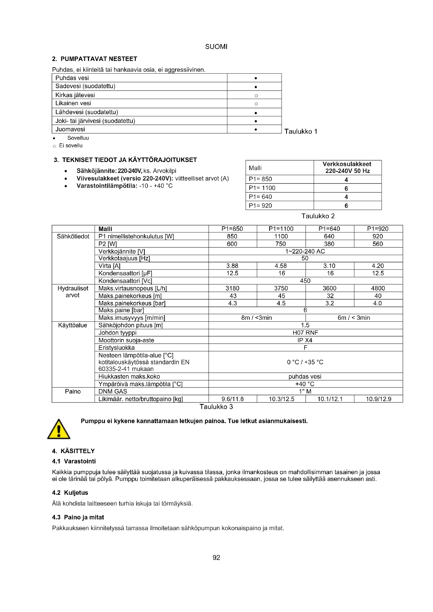Nesteen lämpötila-alue [°C] kotitalouskäytössä standardin EN 60335-2-41 mukaan 0 °C / +35 °C Hiukkasten maks.koko puhdas vesi Ympäröivä maks.lämpötila [°C] +40 °C Paino DNM GAS 1'' M Likimäär. netto/bruttopaino [kg] 9.6/11.8 10.3/12.5 10.1/12.1 10.9/12.9 Taulukko 3