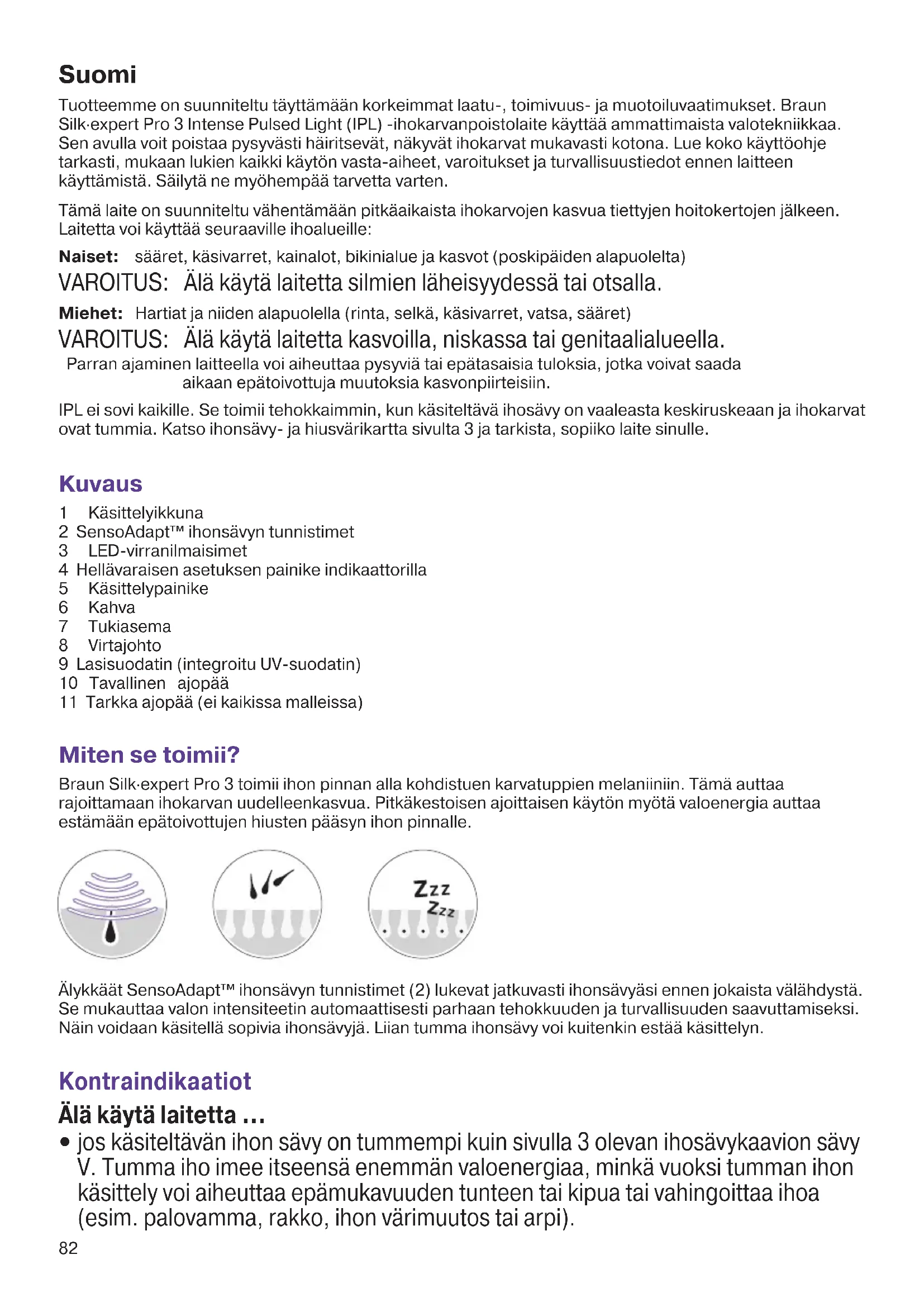 Lapsia tulisi valvoa ja varmistaa, että he eivät leiki laitteella. Säilytä laite aina lasten ulottumattomissa. Sähkö - ja Paloturvallisuus Tarkista säännöllisesti, ettei laitteessa ja johdoissa ole näkyviä vahingoittumisen merkkejä. Mikäli laitteessa näkyy vaurioita tai murtumia, lopeta laitteen käyttö. Vaurioituneen laitteen käyttö voi aiheuttaa sähköiskun. Mikäli ilmenee vikoja, tarkis- tuta ja korjauta laite valtuutetussa huoltokeskuksessa. Valtuuttamaton huoltotyö voi aiheuttaa vakavia vaaratilanteita käyttäjälle. Irrota laitteen virtajohto pistorasiasta aina käytön jälkeen. VAARA Älä yritä korjata tai avata laitetta, sillä voit joutua alttiiksi vaarallisille sähkökompo- nenteille tai valoimpulssille, jotka voivat aiheuttaa vakavan loukkaantumisen tai pysyvän silmävamman. Älä käytä veden lähellä tai märillä pinnoilla, kuten kylpyammeessa, suihkussa, altaassa tai muissa vettä sisältävissä paikoissa. Älä käytä laitetta, jos se kastuu. Märän laitteen käyttö voi aiheuttaa sähköiskun. Älä käytä, jos laite on vaurioitunut (esim. rikkoutunut kotelo, vaurioitunut johto jne.). Sisäiset osat sisältävät vaarallisia sähkölatauksia. Älä käytä, jos lasisuodatin (9) on rikkoutunut tai se puuttuu. Tarkista lasisuodatin säännöllisesti vaurioiden varalta. Älä koske lasisuodattimeen käytön aikana tai heti sen jälkeen, koska suodatin kuumenee. Älä käytä öljypohjaisia tai syttyviä puhdistusaineita (alkoholi, asetonit), sillä ne voi- vat aiheuttaa tulipalon vaaran. Älä käytä hankaavia puhdistusaineita. Ne voivat vahingoittaa laitetta tai naarmuttaa lasisuodatinta. 91815976_Victoria_Pro3_Euro_01.indd 8491815976_Victoria_Pro3_Euro_01.indd 84 27.06.18 13:0427.06.18 13:04 Business Use - P&G AUTHORIZED POA-00053579 Rev 001 Effective Date 2018-07-02 Printed 2018-07-25 Page 84 of 9085 Älä yritä käyttää laitetta muuhun kuin ihokarvojen poistamiseen. Älä käytä laitetta millään muulla pinnalla kuin iholla. Älä paina käsittelypainiketta, jos käsittelyikkuna (1) ei ole asetettuna kokonaan ihoa vasten. Älä tuki ilmanvaihtoaukkoja. Laite saattaa ylikuumentua ja aiheuttaa sähköiskun tai tulipalon vaaran. Käyttö Käsiteltävän alueen valmistelu Poista näkyvät ihokarvat iholta ennen laitteen käyttämistä. Voit käyttää haluamaasi karvanpoistomenetelmää. Jotta käsittelyikkuna pysyisi puhtaana ja ehjänä, varmista, ettei ihon pinnalla ole enää karvoja. Puhdista käsiteltävä alue ja taputtele kuivaksi. Virran kytkeminen laitteeseen: Liitä tukiasema pistorasiaan virtajohdon (8) avulla. Käynnistä laite painamalla hellävaraisen asetuksen painiketta (4). LED-virtapalkit (3) valaistuvat kerran, ja puhallin käy lyhyesti. Tämä tarkoittaa, että laite on VALMIUStilassa. Käytön aikana laite kuumenee hiukan. Valon automaattinen mukauttaminen Kun molemmat ihonsävyn tunnistimet (2) koskettavat ihoa, laite lukee ihonsävysi ja valitsee sopivan valon intensiteetin. Sitä ilmaisevat virtapalkkien (3) valkoiset LED-valot. Ne vahvistavat, että laite on käyttövalmis. vaalea ihonsävy U korkea valon voimakkuus tumma ihonsävy U matala valon voimakkuus ja ei valoja ei ihokosketusta U Laitteen valo ei vilku. punainen valo ihonsävy virheellinen U Laitteen valo ei vilku. Hellävarainen tila Vähennä valon voimakkuutta painamalla hellävaraisen asetuksen painiketta (4). Hellävaraisen tilan ilmaisin syttyy, kun se on käytössä. Saat sen pois päältä painamalla hellävaraisen asetuksen painiketta uudelleen. Tehonilmaisinpalkit vilkkuvat merkiksi valonvoimakkuusasetuksen muutoksesta. Kun hellävaraisen asetuksen painiketta (4) pidetään pohjassa yli kolmen sekunnin ajan, laite kytkeytyy pois päältä. Jos laitetta ei käytetä 10 minuuttiin, se kytkeytyy automaattisesti pois päältä. Voit aktivoida sen painamalla hellävaraisen asetuksen painiketta. Kokeilu pienellä alueella Ennen ensimmäistä käsittelykertaa on suositeltavaa kokeilla Braun Silk·expert -laitetta pienellä alueella siihen kehon osaan, jota aiot käsitellä (kooltaan noin 2 x 3 cm, vastaa kahta vierekkäin tehtyä käsittelyä). Suorita aluetesti luvussa «Käsittelytavat» osiossa Tarkkuustila kuvatulla tavalla «TARKKUUSKÄSITTELY». Tarkista testialue 48 tunnin kuluttua. Jos iho vaikuttaa normaalilta, aloita ensimmäinen käsittely. Jos ilmenee ihoreaktioita, lopeta laitteen käyttö ja ota yhteyttä lääkäriin. Älä käsittele testialuetta uudelleen vähintään viikkoon testin jälkeen. Käsittelytavat Käsiteltävän alueen on oltava karvaton, puhdas ja kuiva. Ennen kuin painat käsittelypainiketta, katso poispäin laitteesta, jotta vältät kirkkaan valon. 91815976_Victoria_Pro3_Euro_01.indd 8591815976_Victoria_Pro3_Euro_01.indd 85 27.06.18 13:0427.06.18 13:04 Business Use - P&G AUTHORIZED POA-00053579 Rev 001 Effective Date 2018-07-02 Printed 2018-07-25 Page 85 of 9086 LIUKUMINEN suurten alueiden (esim. säärten) nopeaan ja tehokkaaseen käsittelyyn TARKKUUSKÄSITTELY pienten, vaikeasti saavutettavien alueiden käsittelyyn (esim. naisten kasvot, bikinirajat, kainalot, polvet, leuka, nilkat)