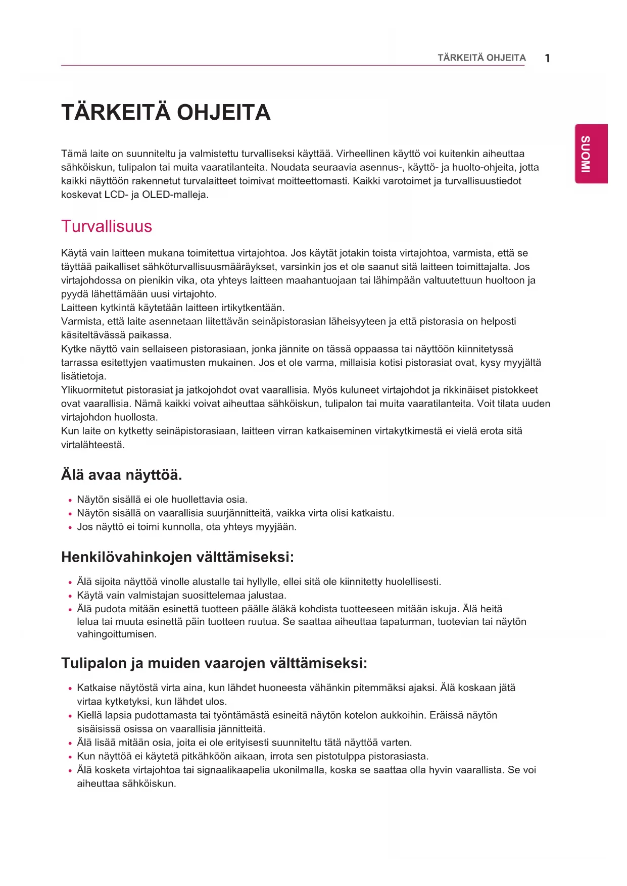 Tämä laite on suunniteltu ja valmistettu turvalliseksi käyttää. Virheellinen käyttö voi kuitenkin aiheuttaa sähköiskun, tulipalon tai muita vaaratilanteita. Noudata seuraavia asennus-, käyttö- ja huolto-ohjeita, jotta kaikki näyttöön rakennetut turvalaitteet toimivat moitteettomasti. Kaikki varotoimet ja turvallisuustiedot koskevat LCD- ja OLED-malleja. Turvallisuus Käytä vain laitteen mukana toimitettua virtajohtoa. Jos käytät jotakin toista virtajohtoa, varmista, että se täyttää paikalliset sähköturvallisuusmääräykset, varsinkin jos et ole saanut sitä laitteen toimittajalta. Jos virtajohdossa on pienikin vika, ota yhteys laitteen maahantuojaan tai lähimpään valtuutettuun huoltoon ja pyydä lähettämään uusi virtajohto.Laitteen kytkintä käytetään laitteen irtikytkentään.Varmista, että laite asennetaan liitettävän seinäpistorasian läheisyyteen ja että pistorasia on helposti käsiteltävässä paikassa.Kytke näyttö vain sellaiseen pistorasiaan, jonka jännite on tässä oppaassa tai näyttöön kiinnitetyssä tarrassa esitettyjen vaatimusten mukainen. Jos et ole varma, millaisia kotisi pistorasiat ovat, kysy myyjältä lisätietoja.Ylikuormitetut pistorasiat ja jatkojohdot ovat vaarallisia. Myös kuluneet virtajohdot ja rikkinäiset pistokkeet ovat vaarallisia. Nämä kaikki voivat aiheuttaa sähköiskun, tulipalon tai muita vaaratilanteita. Voit tilata uuden virtajohdon huollosta.Kun laite on kytketty seinäpistorasiaan, laitteen virran katkaiseminen virtakytkimestä ei vielä erota sitä virtalähteestä. Älä avaa näyttöä.