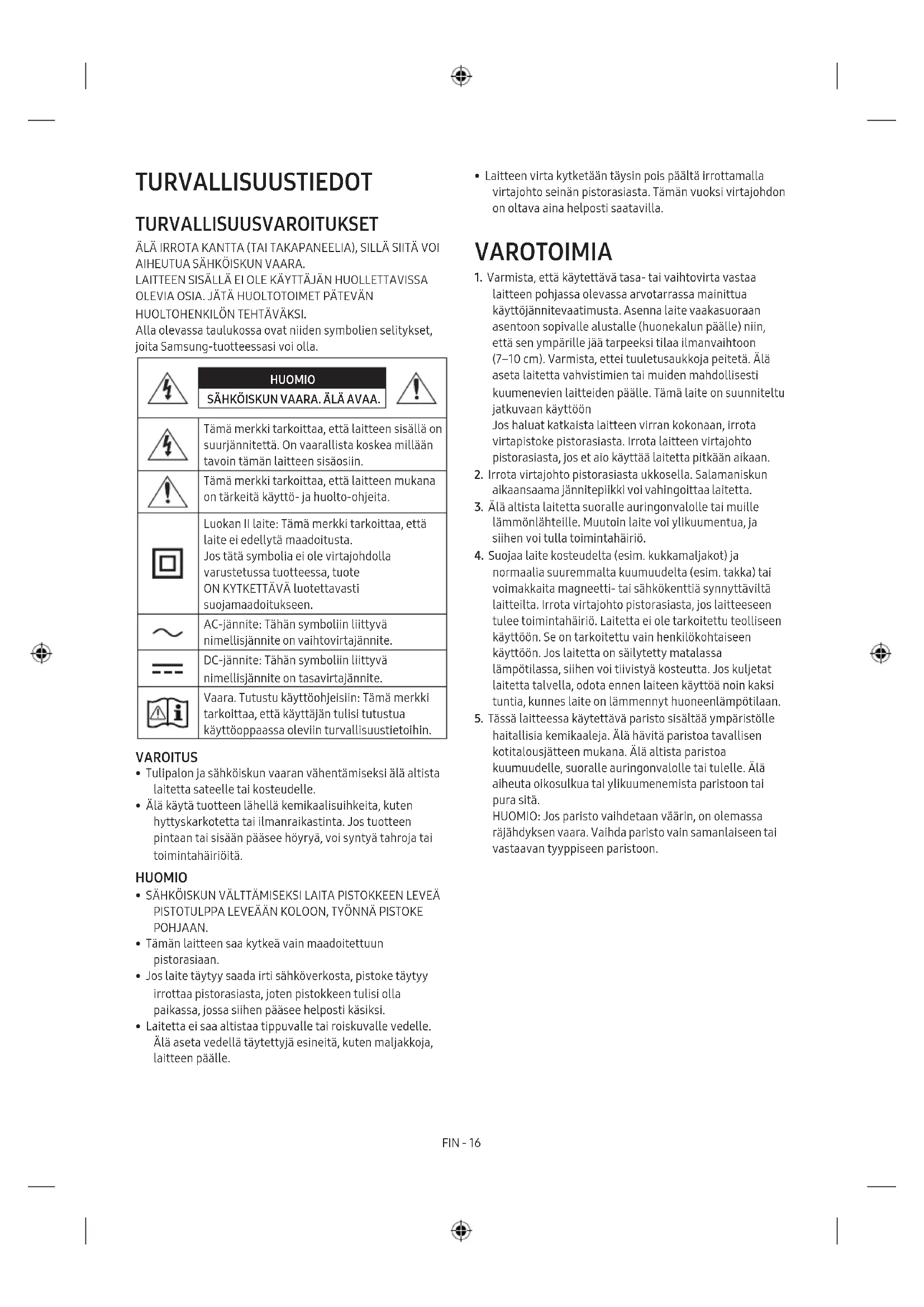 - LANGATTOMAN LAITTEEN LÄHTÖTEHO RF-lähettimen enimmäisteho 100 mW alueella 2,4 GHz – 2,4835 GHz 200 mW alueella 5,15 GHz – 5,25 GHz ja 5,47 GHz – 5,725 GHz 100 mW alueella 5,25 GHz – 5,35 GHz 25 mW alueella 5,725–5,875 GHzFIN - 22 [Tuotteen paristojen oikea hävittäminen] (Jätteiden lajittelua käyttävät maat) Tämä merkintä paristossa, käyttöoppaassa tai pakkauksessa tarkoittaa, että tämän tuotteen sisältämiä paristoja ei saa hävittää muun kotitalousjätteen seassa, kun niiden käyttöikä on päättynyt. Kemiallinen symboli Hg, Cd tai Pb ilmaisee, että paristo sisältää elohopeaa, kadmiumia tai lyijyä yli EU-direktiivin 2006/66 salliman määrän. Jos paristoja ei hävitetä oikein, nämä aineet voivat vahingoittaa ihmisten terveyttä tai ympäristöä. Suojaa luonnonvaroja ja edistä materiaalien uusiokäyttöä erottelemalla paristot muusta jätteestä ja toimittamalla ne kierrätettäväksi paikalliseen maksuttomaan paristojen palautusjärjestelmään. Tuotteen turvallinen hävittäminen (elektroniikka ja sähkölaitteet) (Jätteiden lajittelua käyttävät maat) Oheinen merkintä tuotteessa, lisävarusteissa tai käyttöohjeessa merkitsee, että tuotetta tai lisävarusteina toimitettavia sähkölaitteita (esim. laturia, kuulokkeita tai USB kaapelia) ei saa hävittää kotitalousjätteen mukana niiden käyttöiän päätyttyä. Virheellisestä jätteenkäsittelystä ympäristölle ja terveydelle aiheutuvien haittojen välttämiseksi tuote ja lisävarusteet on eroteltava muusta jätteestä ja kierrätettävä kestävän kehityksen mukaista uusiokäyttöä varten. Kotikäyttäjät saavat lisätietoja tuotteen ja lisävarusteiden turvallisesta kierrätyksestä ottamalla yhteyttä tuotteen myyneeseen jälleenmyyjään tai paikalliseen ympäristöviranomaiseen. Yrityskäyttäjien tulee ottaa yhteyttä tavarantoimittajaan ja selvittää hankintasopimuksen ehdot. Tuotetta tai sen lisävarusteita ei saa hävittää muun kaupallisen jätteen seassa. Lisätietoja Samsungin ympäristösitoumuksista ja tuotekohtaisista lainsäädännöllisistä velvollisuuksista (esim. REACH, WEEE ja paristot) löydät osoitteesta www.samsung.com/uk/aboutsamsung/sustainability/ environment/our-commitment/data/.NOR - 23 SIKKERHETSINFORMASJON SIKKERHETSADVARSLER FOR Å REDUSERE RISIKOEN FOR ELEKTRISK STØT SKAL IKKE DEKSLET FJERNES (ELLER BAKSIDEN). INGEN INNVENDIGE DELER KAN REPARERES AV BRUKEREN. OVERLAT SERVICE TIL KVALIFISERT SERVICEPERSONELL. Tabellen nedenfor viser en forklaring av symbolene som kan vises på Samsung-produktet ditt. FORSIKTIG
