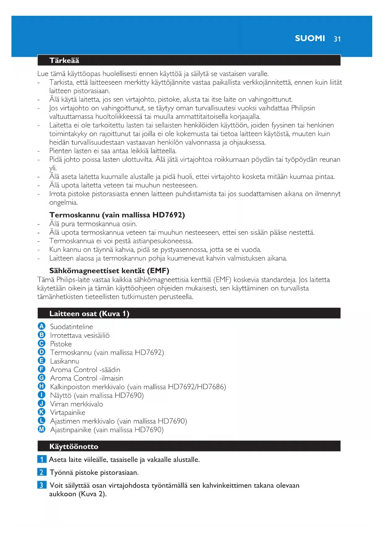ESPAÑOL3031 Tärkeää Lue tämä käyttöopas huolellisesti ennen käyttöä ja säilytä se vastaisen varalle. Tarkista, että laitteeseen merkitty käyttöjännite vastaa paikallista verkkojännitettä, ennen kuin liität laitteen pistorasiaan. Älä käytä laitetta, jos sen virtajohto, pistoke, alusta tai itse laite on vahingoittunut. Jos virtajohto on vahingoittunut, se täytyy oman turvallisuutesi vuoksi vaihdattaa Philipsin valtuuttamassa huoltoliikkeessä tai muulla ammattitaitoisella korjaajalla. Laitetta ei ole tarkoitettu lasten tai sellaisten henkilöiden käyttöön, joiden fyysinen tai henkinen toimintakyky on rajoittunut tai joilla ei ole kokemusta tai tietoa laitteen käytöstä, muuten kuin heidän turvallisuudestaan vastaavan henkilön valvonnassa ja ohjauksessa. Pienten lasten ei saa antaa leikkiä laitteella. Pidä johto poissa lasten ulottuvilta. Älä jätä virtajohtoa roikkumaan pöydän tai työpöydän reunan yli. Älä aseta laitetta kuumalle alustalle ja pidä huoli, ettei virtajohto kosketa mitään kuumaa pintaa. Älä upota laitetta veteen tai muuhun nesteeseen. Irrota pistoke pistorasiasta ennen laitteen puhdistamista tai jos suodattamisen aikana on ilmennyt ongelmia. Termoskannu (vain mallissa HD7692) Älä pura termoskannua osiin. Älä upota termoskannua veteen tai muuhun nesteeseen, ettei sen sisään pääse nestettä. Termoskannua ei voi pestä astianpesukoneessa. Kun kannu on täynnä kahvia, pidä se pystyasennossa, jotta se ei vuoda. Laitteen alaosa ja termoskannun pohja kuumenevat kahvin valmistuksen aikana. Sähkömagneettiset kentät (EMF) Tämä Philips-laite vastaa kaikkia sähkömagneettisia kenttiä (EMF) koskevia standardeja. Jos laitetta käytetään oikein ja tämän käyttöohjeen ohjeiden mukaisesti, sen käyttäminen on turvallista tämänhetkisten tieteellisten tutkimusten perusteella. Laitteen osat (Kuva 1) A Suodatinteline B Irrotettava vesisäiliö C Pistoke D Termoskannu (vain mallissa HD7692) E Lasikannu F Aroma Control -säädin G Aroma Control -ilmaisin H Kalkinpoiston merkkivalo (vain mallissa HD7692/HD7686) I Näyttö (vain mallissa HD7690) J Virran merkkivalo K Virtapainike L Ajastimen merkkivalo (vain mallissa HD7690) M Ajastinpainike (vain mallissa HD7690) Käyttöönotto