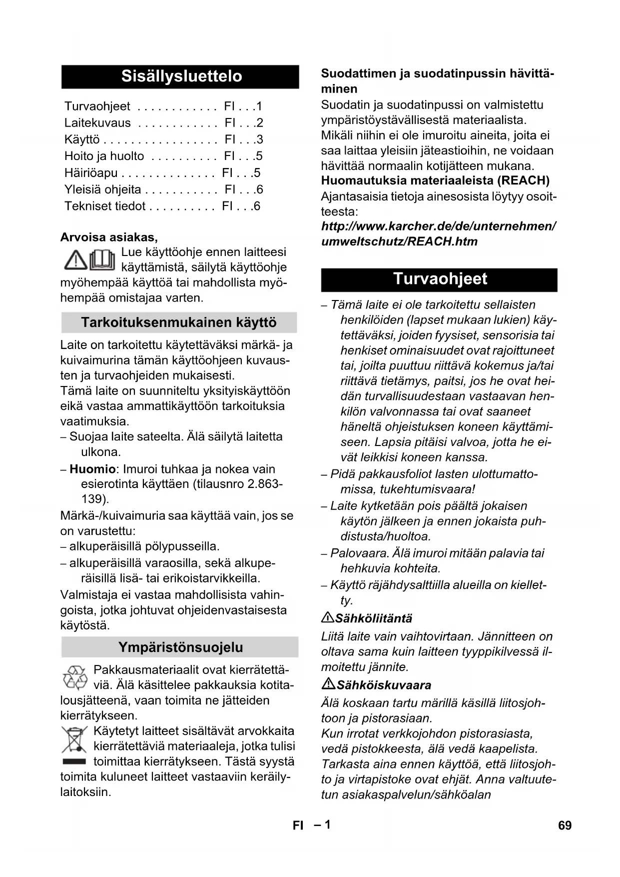 J 1 73FI– 6 puhdistuksen jälkeen takaisin paikal- leen (huomioi merkintä ja symbolit). Aseta ensin uimuri paikalleen, aseta sit- ten päälle uimurikori ja lukitse paikal- leen. Jos laitteen imuteho heikkenee, tarkasta seuraavat seikat: Varuste, imuletku tai imuputket ovat tukkeutuneet, poista tukos. Poimusuodatin on likaantunut: Laitteet ilman ExPress-suodattimen- puhdistusta: Irrota ja puhdista poimu- suodatin (katso kohtaa "Poimusuodattimen puhdistaminen"). Laitteet, joissa on ExPress-suodatti- menpuhdistus: Paina 3 kertaa suodat- timen puhdistuspainiketta, jos tarpeen toista puhdistus imuletkun ollessa sul- jettuna ("Poimusuodattimen puhdista- minen"). Puhdista suodatin tarvittaessa virtaa- vassa vedessä. Vaihda vahingoittunut poimusuodatin uuteen. Suodatinpussi on täynnä: Aseta tilalle uusi suodatinpussi (Katso tilausnumero tämän käyttöohjeen lopussa olevasta varaosaluettelosta). 몇 Huomio Älä heitä pois suodatinpussikiinnitintä! Kussakin maassa ovat voimassa valtuutta- mamme myyntiorganisaation julkaisemat takuuehdot. Materiaali- ja valmistusvirheis- tä aiheutuvat virheet laitteessa korjaamme takuuaikana maksutta. Takuutapauksessa ota yhteys ostostositteineen jälleenmyy- jään tai lähimpään valtuutettuun asiakas- palveluun. (Osoite, katso takasivua) KÄRCHER -edustustomme vastaa mielel- lään kysymyksiisi ja auttaa mahdollisissa häiriötilanteissa. (Osoite, katso takasivua) Tärkeimpien osien varaosaluettelo löytyy tämän käyttöohjeen lopusta. Varaosat ja erityisvarusteet saat kauppiaal- tasi tai lähimmältä KÄRCHER tytäryhtiöltä. (Osoite, katso takasivua) Tekniset tiedot ovat auki käännettävillä si- vuilla. Seuraavana siellä käytettyjen sym- bolien selitykset. Oikeus teknisiin muutoksiin pidätetään! Vähenevä imuteho Yleisiä ohjeita Takuu Asiakaspalvelu Varaosien ja erityisvarusteiden tilaaminen Tekniset tiedot Jännite Teho P nenn Teho P max Laitepistorasian maks. liitantäte-
