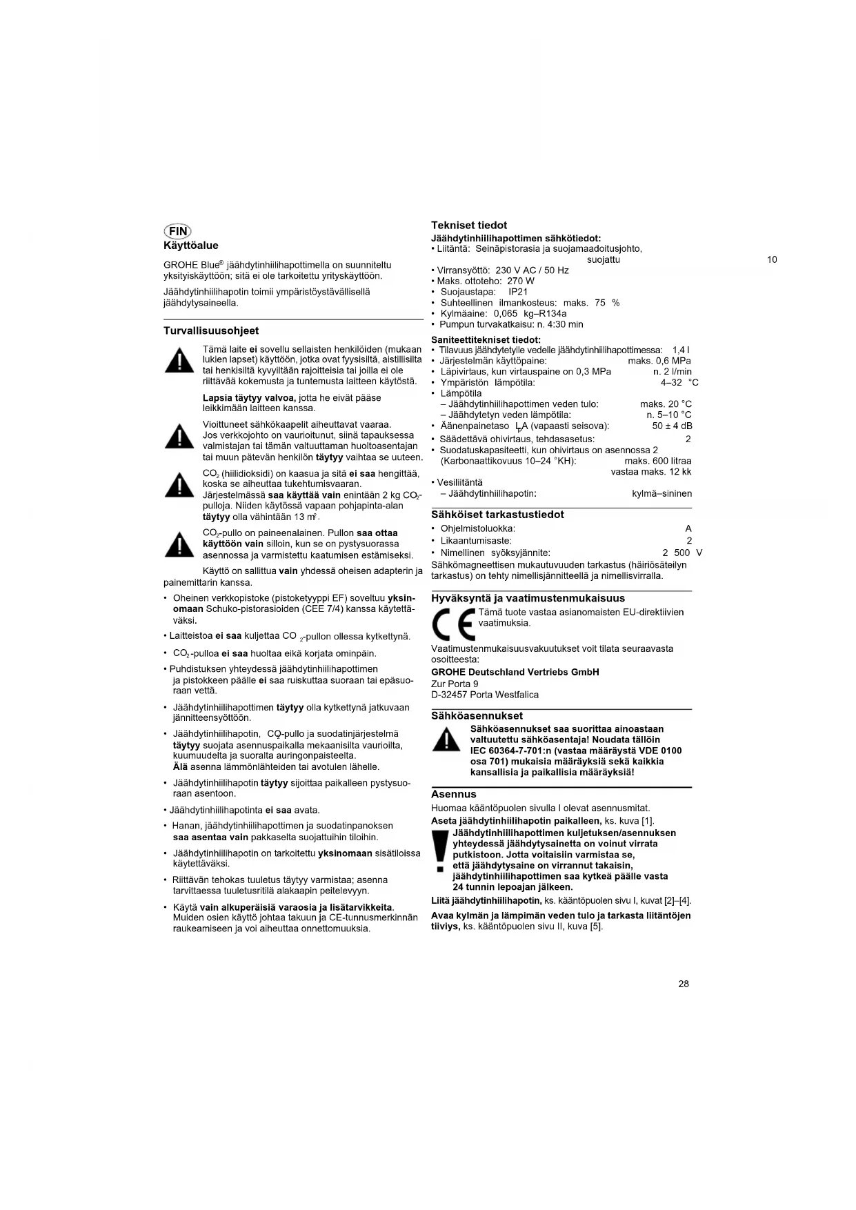 - Nimellinen syöksyjännite: 2 500 V Sähkömagneettisen mukautuvuuden tarkastus (häiriösäteilyn tarkastus) on tehty nimellisjännitteellä ja nimellisvirralla. Hyväksyntä ja vaatimustenmukaisuus Vaatimustenmukaisuusvakuutukset voit tilata seuraavasta osoitteesta: GROHE Deutschland Vertriebs GmbH Zur Porta 9 D-32457 Porta Westfalica Sähköasennukset Sähköasennukset saa suorittaa ainoastaan valtuutettu sähköasentaja! Noudata tällöin IEC 60364-7-701:n (vastaa määräystä VDE 0100 osa 701) mukaisia määräyksiä sekä kaikkia kansallisia ja paikallisia määräyksiä! Asennus Huomaa kääntöpuolen sivulla I olevat asennusmitat. Aseta jäähdytinhiilihapotin paikalleen, ks. kuva [1]. Jäähdytinhiilihapottimen kuljetuksen/asennuksen yhteydessä jäähdytysainetta on voinut virrata putkistoon. Jotta voitaisiin varmistaa se, että jäähdytysaine on virrannut takaisin, jäähdytinhiilihapottimen saa kytkeä päälle vasta 24 tunnin lepoajan jälkeen. Liitä jäähdytinhiilihapotin, ks. kääntöpuolen sivu I, kuvat [2]–[4]. Avaa kylmän ja lämpimän veden tulo ja tarkasta liitäntöjen tiiviys, ks. kääntöpuolen sivu II, kuva [5]. Tämä tuote vastaa asianomaisten EU-direktiivien vaatimuksia.29 Kytke hanan ja jäähdytinhiilihapottimen välinen pistoliitin, ks. kuva [6]. Liitä virransyöttö järjestelmään verkkopistokkeella, ks. kuva [7]. Näytön ilmoitus syttyy ja näyttää suodattimen jäännöskapasiteetin prosentteina. Kytke CO