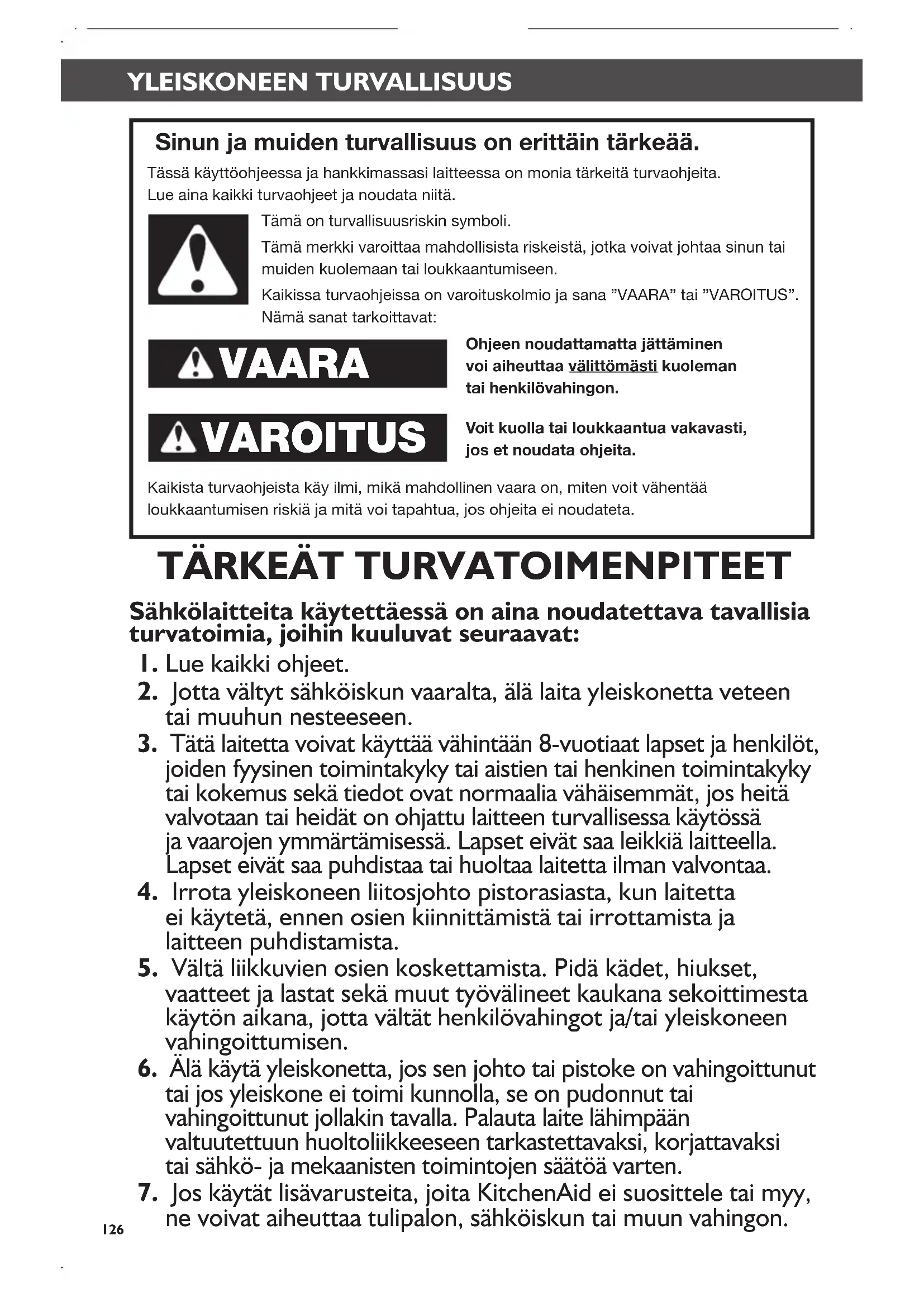 ne voivat aiheuttaa tulipalon, sähköiskun tai muun vahingon. W10648168A_11_FI.indd 126 1/29/14 3:23 PM127 Suomi YLEISKONEEN TURVALLISUUS