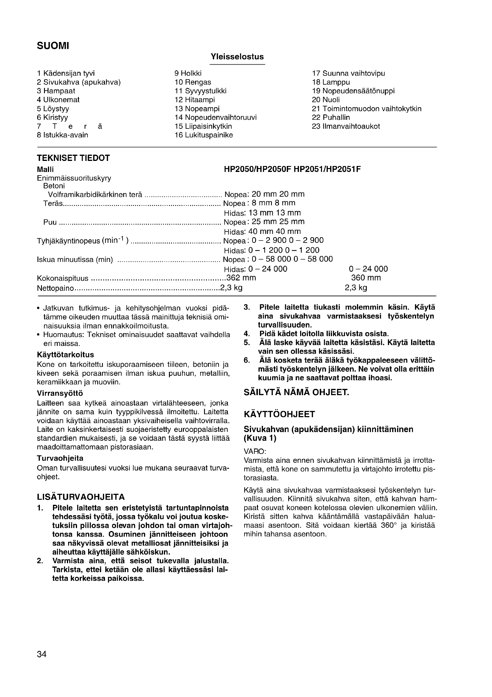 Sivukahvan (apukädensijan) kiinnittäminen (Kuva 1) VARO: Varmista aina ennen sivukahvan kiinnittämistä ja irrotta- mista, että kone on sammutettu ja virtajohto irrotettu pis- torasiasta. Käytä aina sivukahvaa varmistaaksesi työskentelyn tur- vallisuuden. Kiinnitä sivukahva siten, että kahvan ham- paat osuvat koneen kotelossa olevien ulkonemien väliin. Kiristä sitten kahva kääntämällä vastapäivään halua- maasi asentoon. Sitä voidaan kiertää 360° ja kiristää mihin tahansa asentoon.35 Poranterän kiinnittäminen ja irrottaminen (Kuva 2 ja 3) VARO: Varmista aina ennen terän kiinnittämistä ja irrottamista, että laitteen virta on katkaistu ja pistoke irrotettu virtaläh- teestä. Malleille HP2050 ja HP2050F Terä kiinnitetään työntämällä se istukkaan niin syvälle kuin se menee. Kiristä sitten istukka käsin. Aseta istukka- avain kuhunkin kolmesta reiästä ja kiristä myötäpäivään. Pidä huolta, että kiristät kaikki kolme reikää yhtä kireälle. Terä irrotetaan kääntämällä istukka-avainta vastapäivään yhdessä reiässä ja löysentämällä sitten istukka käsin. Kun olet käyttänyt istukka-avainta, muista palauttaa se alkuperäiseen paikkaan. Malleille HP2051 ja HP2051F Pitele rengasta ja avaa istukan leuat kiertämällä kaulusta vastapäivään. Työnnä terä niin syvälle istukkaan kuin se menee. Pitele rengasta tiukasti ja kiristä istukka kiertä- mällä kaulusta myötäpäivään. Terä irrotetaan pitelemällä rengasta ja kiertämällä kaulusta vastapäivään. Syvyystulkki (Kuva 4) Syvyystulkki on kätevä, kun halutaan porata samansyvyi- siä reikiä. Löysennä sivukahvaa ja työnnä syvyystulkki sivukahvassa olevaan reikään. Säädä syvyystulkki haluamaasi syvyyteen ja kiristä sivukahva. HUOMAA: Syvyystulkkia ei voi käyttää asennossa, jossa syvyys- tulkki osuu vaihteistoon. Kytkimen käyttäminen (Kuva 5) VARO: Varmista aina ennen koneen liittämistä virtalähteeseen, että liipaisinkytkin toimii moitteettomasti ja palautuu vapautettaessa “OFF” -asentoon. Kone käynnistetään yksinkertaisesti painamalla liipai- sinta. Koneen käyntinopeus kasvaa lisättäessä liipaisi- meen kohdistuvaa puristusvoimaa. Kone pysähtyy vapautettaessa liipaisin. Kone saadaan käymään jatku- vasti painamalla liipaisinta ja painamalla sitten lukituspai- niketta. Tämä lukitustila saadaan purettua painamalla liipaisin kokonaan pohjaan ja vapauttamalla se. Kone on varustettu nopeudensäätöruuvilla, jonka avulla voidaan rajoittaa (muutettavissa) koneen suurinta nope- utta. Kierrä nopeudensäätöruuvia myötäpäivään, kun haluat nopeuttaa käyntiä ja vastapäivään, kun haluat hidastaa käyntiä. Lamppujen sytyttäminen (Mallit HP2050F ja HP2051F) VARO: Älä katso suoraan valoon tai valonlähteeseen. Lamppu sytytetään painamalla liipaisinta. Lamppu sam- mutetaan vapauttamalla liipaisin. HUOMAUTUS: Pyyhi lika lampun linssiltä kuivalla liinalla. Varo naarmut- tamasta lamppua, sillä tämä voi heikentää valotehoa. Suunnanvaihtokytkimen käyttäminen (Kuva 6) Tässä koneessa on pyörimissuunnan vaihtamiseen tar- koitettu suunnanvaihtokytkin. Siirrä suunnanvaihtokytkin asentoon