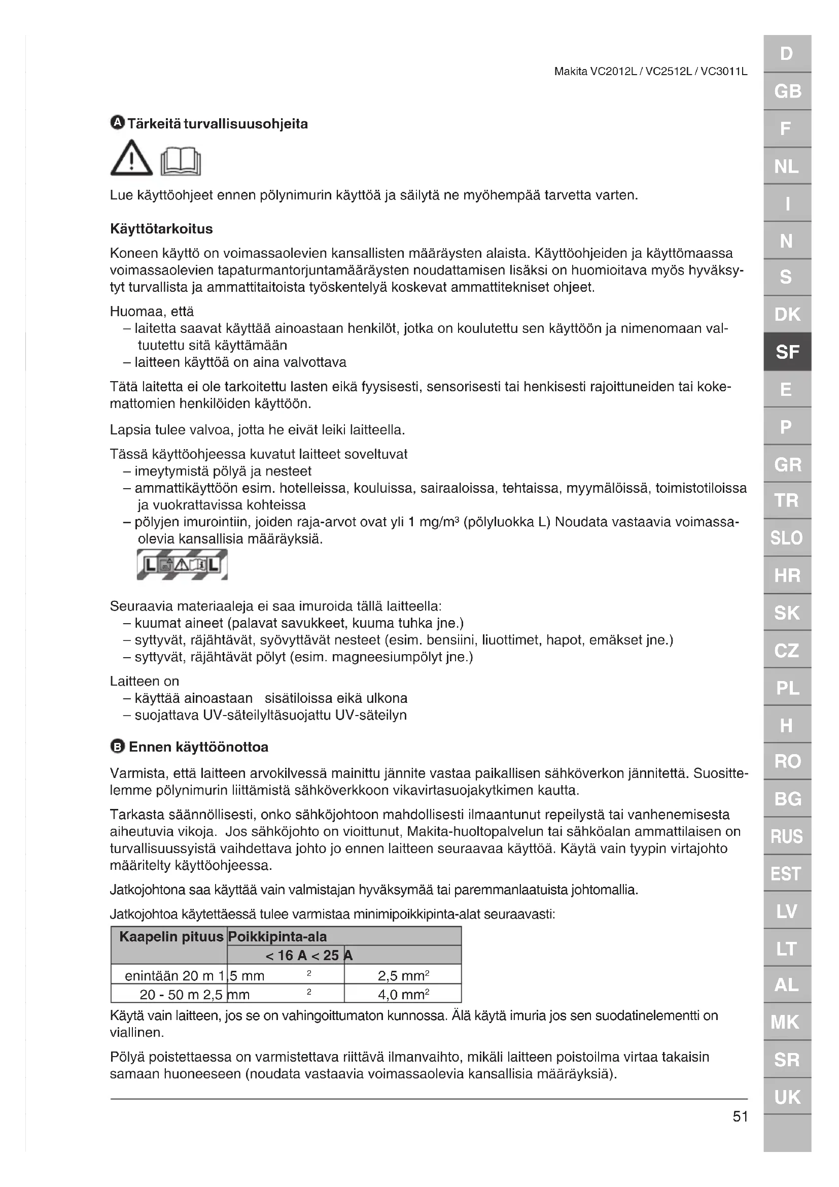 Ennen käyttöönottoa Varmista, että laitteen arvokilvessä mainittu jännite vastaa paikallisen sähköverkon jännitettä. Suositte- lemme pölynimurin liittämistä sähköverkkoon vikavirtasuojakytkimen kautta. Tarkasta säännöllisesti, onko sähköjohtoon mahdollisesti ilmaantunut repeilystä tai vanhenemisesta aiheutuvia vikoja. Jos sähköjohto on vioittunut, Makita-huoltopalvelun tai sähköalan ammattilaisen on turvallisuussyistä vaihdettava johto jo ennen laitteen seuraavaa käyttöä. Käytä vain tyypin virtajohto määritelty käyttöohjeessa. Jatkojohtona saa käyttää vain valmistajan hyväksymää tai paremmanlaatuista johtomallia. Jatkojohtoa käytettäessä tulee varmistaa minimipoikkipinta-alat seuraavasti: Kaapelin pituus Poikkipinta-ala < 16 A < 25 A enintään 20 m 1,5 mm