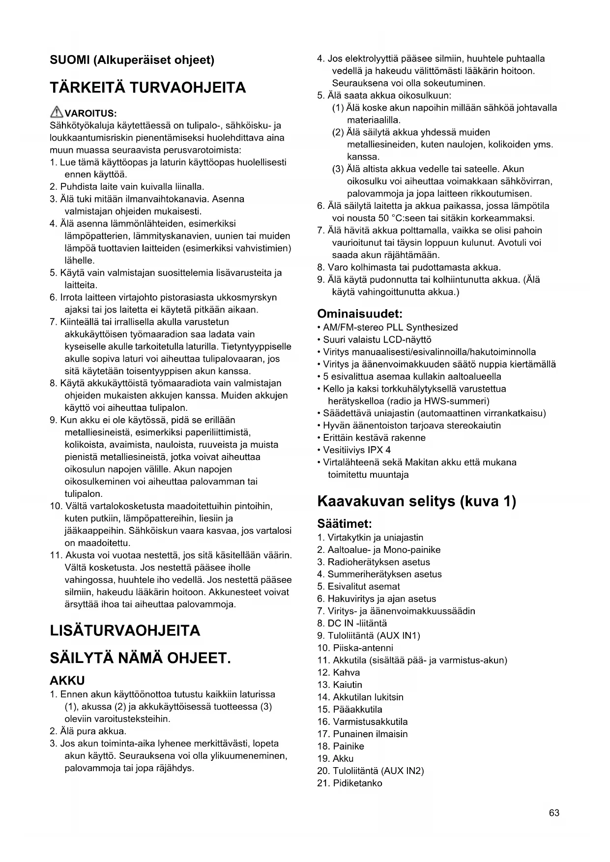 - Älä koskaan käytä bensiiniä, ohentimia, alkoholia tms. aineita. Muutoin pinta voi halkeilla tai sen värit ja muoto voivat muuttua. Tekniset tiedot: Tehontarve Verkkovirtasovitin DC 12 V 700 mA, plusnapa keskellä Akku UM-3 (AA-koko) x 2 varmistusta varten Ryhmäakku: 7,2–18 V Liukulukitusakku: 9,6–18 V Taajuusalue FM 87,50–108 MHz (0,05 MHz:n välein) AM 522–1 629 kHz (9 kHz:n välein) Kytkentäominaisuudet Kaiutin 3 tuumaa 8 ohmia Lähtöteho 7,2 V: 0,5 W x 2, 9,6 V: 1 W x 2 10,8 V: 1,2 W x 2, 12 V: 1,5 W x 2 14,4 V: 2,2 W x 2, 18 V: 3,5 W x 2 Tuloliitäntä 3,5 mm (AUX IN1/AUX IN2) Antennijärjestelmä FM: piiska-antenni AM: sauva-antenni Mitat (L x K x S), mm 280 x 302 x 163 Paino (ilman akkua) 4,0 kg68 ΕΛΛΗΝΙΚΑ (Πρωτογενείς οδηγίες) ΣΗΜΑΝΤΙΚΕΣ ΟΔΗΓΙΕΣ