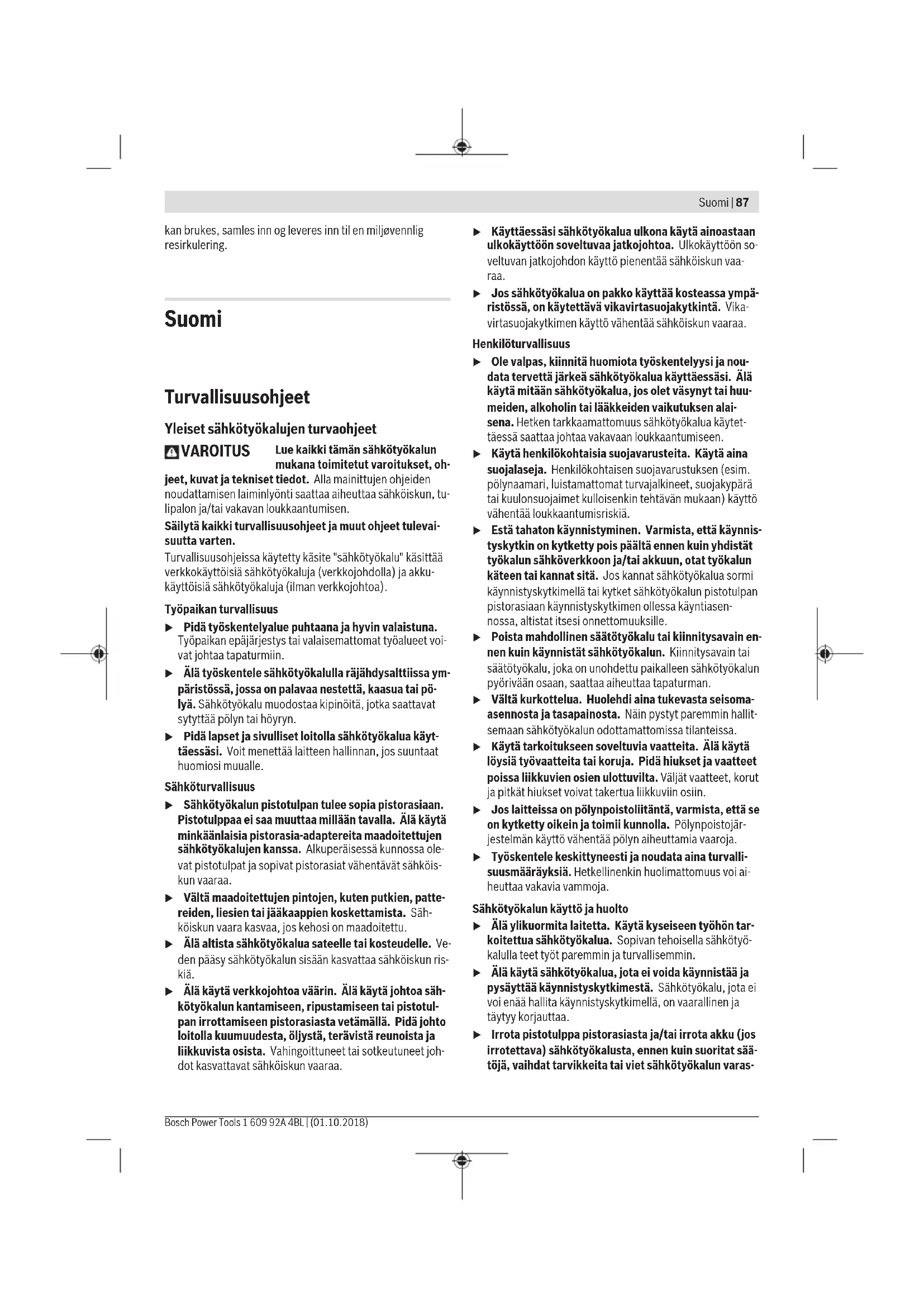 Hiomapaperin vaihto ja kiinnitys hiomalevyyn Hiomalevyssä (11) on tarrakangas, joka mahdollistaa tarra- kiinnitteisten hiomapaperien nopean ja helpon asennuksen. Optimaalisen kiinnityksen varmistamiseksi koputtele hioma- levyn (11) tarrakangas puhtaaksi, ennen kuin asennat hio- mapaperin (12). Aseta hiomapaperi (12) yhdeltä sivultaan hiomalevyn (11) reunan kohdalle ja paina sen jälkeen koko hiomapaperi kun- nolla kiinni hiomalevyyn. Varmista optimaalista pölynpoistoa varten, että hiomapape- rin reiät ovat kohdakkain hiomalevyn reikien kanssa. Kun haluat irrottaa hiomapaperin (12), ota kiinni sen yh- destä kärjestä ja vedä hiomapaperi irti hiomalevystä (11). Voit käyttää kaikkia Bosch-tarvikevalikoiman Delta 93 mm - sarjan hiomapapereita, kiillotuskarhunkieliä ja puhdistuskar- hunkieliä. Muut hiomatarvikkeet (esimerkiksi karhunkielet ja kiillotus- huovat) kiinnitetään hiomalevyyn samalla tavalla. Pölyn-/purunpoisto Työstettävistä materiaaleista syntyvä pöly (esimerkiksi lyijy- pitoinen pinnoite, tietyt puulaadut, kivi ja metalli) voi olla ter- veydelle vaarallista. Pölyn koskettaminen tai hengittäminen saattaa aiheuttaa käyttäjälle tai lähellä oleville henkilöille al- lergisia reaktioita ja/tai hengitystiesairauksia. Tiettyjen pölylaatujen (esimerkiksi tammi- tai pyökkipöly) katsotaan aiheuttavan syöpää, varsikin puunsuojaukseen käytettävien lisäaineiden yhteydessä (kromaatti, puunsuoja- aine). Asbestipitoisia materiaaleja saavat käsitellä vain asiantuntevat ammattilaiset. – Käytä mahdollisuuksien mukaan materiaalille soveltuvaa pölynpoistoa. – Huolehdi työkohteen hyvästä tuuletuksesta. – Suosittelemme käyttämään suodatusluokan P2 hengitys- suojanaamaria. Noudata käsiteltäviä materiaaleja koskevia maakohtaisia määräyksiä. u Estä pölyn kertyminen työpisteeseen. Pöly saattaa olla herkästi syttyvää. Pölynpoistovarusteen liitäntä (katso kuva C) Pölynpoistovaruste (17) on tarkoitettu vain hiomalevyllä (11) tehtäviin töihin, sitä ei käytetä muiden käyttötarvikkei- den yhteydessä. Käytä hionnassa aina pölynpoistoa.Kun aiot asentaa pölynpoistovarusteen (17) (lisätarvike), ota käyttötarvike ja syvyydenrajoitin (13) pois. Työnnä pölynpoistovaruste (17) käyttötarvikkeen pitimen (6) yli sähkötyökalun kiinnityskaulan rajoittimeen asti. Käännä pölynpoistovaruste haluamaasi asentoon (ei suoraan sähkötyökalun alapuolelle). Paina pölynpoistovarusteen lu- kitseva kiinnitysvipu (15) kiinni. Työnnä imuletkun (18) käyttötarvikemuhvi pölynpoistoput- ken (16) päälle. Kytke imuletku (18) pölynimuriin (lisätar- vike). Tämän käyttöoppaan lopussa olevassa yleiskatsaus neuvoo, miten työkalun voi kytkeä erilaisiin pölynimureihin. Pölynimurin tulee soveltua työstettävälle materiaalille. Käytä erikoisimuria terveydelle erittäin vaarallisten, syöpää aiheuttavien tai kuivien pölylaatujen imurointiin. Käyttö Käyttöönotto u Huomioi sähköverkon jännite! Virtalähteen jännitteen tulee vastata sähkötyökalun laitekilvessä olevia tietoja. Käynnistys ja pysäytys u Varmista, että voit painaa käynnistyskytkintä irrotta- matta otetta kädensijasta. Käynnistä sähkötyökalu työntämällä käynnistyskytkintä (1) eteenpäin, kunnes kytkimen kohdalla lukee "I". Elektroninen pehmeä käynnistys rajoittaa käynnistyksen vääntömomenttia ja pidentää moottorin käyttöikää. Vakioelektroniikka pitää värähtelytaajuuden lähes identti- senä sekä tyhjäkäynnillä että kuormituksessa ja varmistaa ta- saisen työskentelytehon. Sammuta sähkötyökalu työntämällä käynnistyskytkintä (1) taaksepäin, kunnes kytkimen kohdalla lukee "0". Värähtelytaajuuden asetus Voit säätää tarvittavan värähtelytaajuuden myös käytön ai- kana värähtelytaajuuden säätöpyörällä (2). Tarvittava värähtelytaajuus riippuu materiaalista ja työolo- suhteista ja sen voi määrittää käytännön testeillä. Suosittelemme käyttämään kovien materiaalien (esimerkiksi puu tai metalli) sahaus-, katkaisu- ja hiontatöissä värähtely- taajuuden porrasta "6", pehmeiden materiaalien (esimer- kiksi muovi) työstössä kannattaa käyttää värähtelytaajuuden porrasta "4". Työskentelyohjeita u Irrota pistotulppa pistorasiasta ennen kaikkia sähkö- työkaluun kohdistuvia töitä. u Odota, kunnes sähkötyökalu on pysähtynyt, ennen kuin asetat sen säilytysalustalle. Huomautus: älä peitä työskentelyn aikana sähkötyökalun tuuletusaukkoja (3), koska muuten sähkötyökalun elinikä ly- henee. Toimintaperiaate Käyttötarvike työstää materiaalia 2,8°:een edestakaisella liikkeellä maks. 20000 r/min nopeudella. Tämä mahdollistaa tarkan työskentelyn ahtaimmissakin käyttökohteissa. Paina käyttötarviketta kevyesti ja tasai- sesti työkappaletta vasten, koska muuten työstöteho heikkenee ja käyttötarvike saattaa jumittua. Liikuta sähkötyökalua edestakaisin työs- kentelyn aikana, jotta käyttötarvike ei kuumene liikaa eikä jumitu. Sahaus u Käytä vain ehjiä ja moitteettomassa kunnossa olevia sahanteriä. Taipunut tai tylsä sahanterä saattaa johtaa terän katkeamiseen, sahausjäljen heikentymiseen tai ta- kaiskuun. u Kun sahaat kevytrakennemateriaaleja, huomioi niitä koskevat lakimääräykset ja materiaalien valmistajien antamat suositukset. u Upotussahaus on sallittua vain pehmeiden materiaa- lien kanssa (esimerkiksi puu, kilpsilevy yms.)! Tarkista ennen HCS-sahanterillä sahausta, ettei työstettä- vissä puuosissa, lastulevyissä, rakennusmateriaaleissa, jne. ole vieraita esineitä, kuten nauloja, ruuveja, yms. Poista tar- vittaessa vieraat esineet tai käytä bimetallisahanteriä. Katkaisu Huomautus: huomioi seinälaattojen katkaisussa, että käyt- tötarvikkeet kuluvat pitkäaikaisessa käytössä erittäin voi- makkaasti. Hionta Hiontateho ja hiontajälki perustuvat pääasiassa valittuun hio- mapaperiin, asetettuun värähtelytaajuuteen ja voimaan