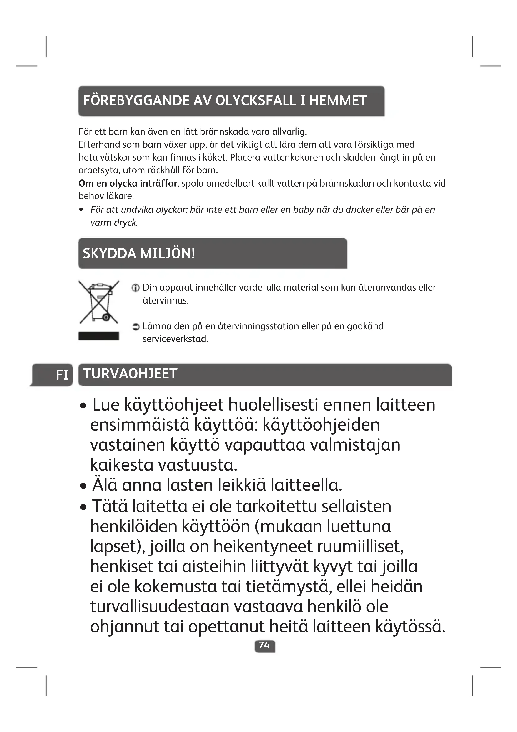- Tätälaitettaeioletarkoitettusellaisten henkilöidenkäyttöön(mukaanluettuna lapset),joillaonheikentyneetruumiilliset, henkisettaiaisteihinliittyvätkyvyttaijoilla eiolekokemustataitietämystä,elleiheidän turvallisuudestaanvastaavahenkilöole ohjannuttaiopettanutheitälaitteenkäytössä.75
