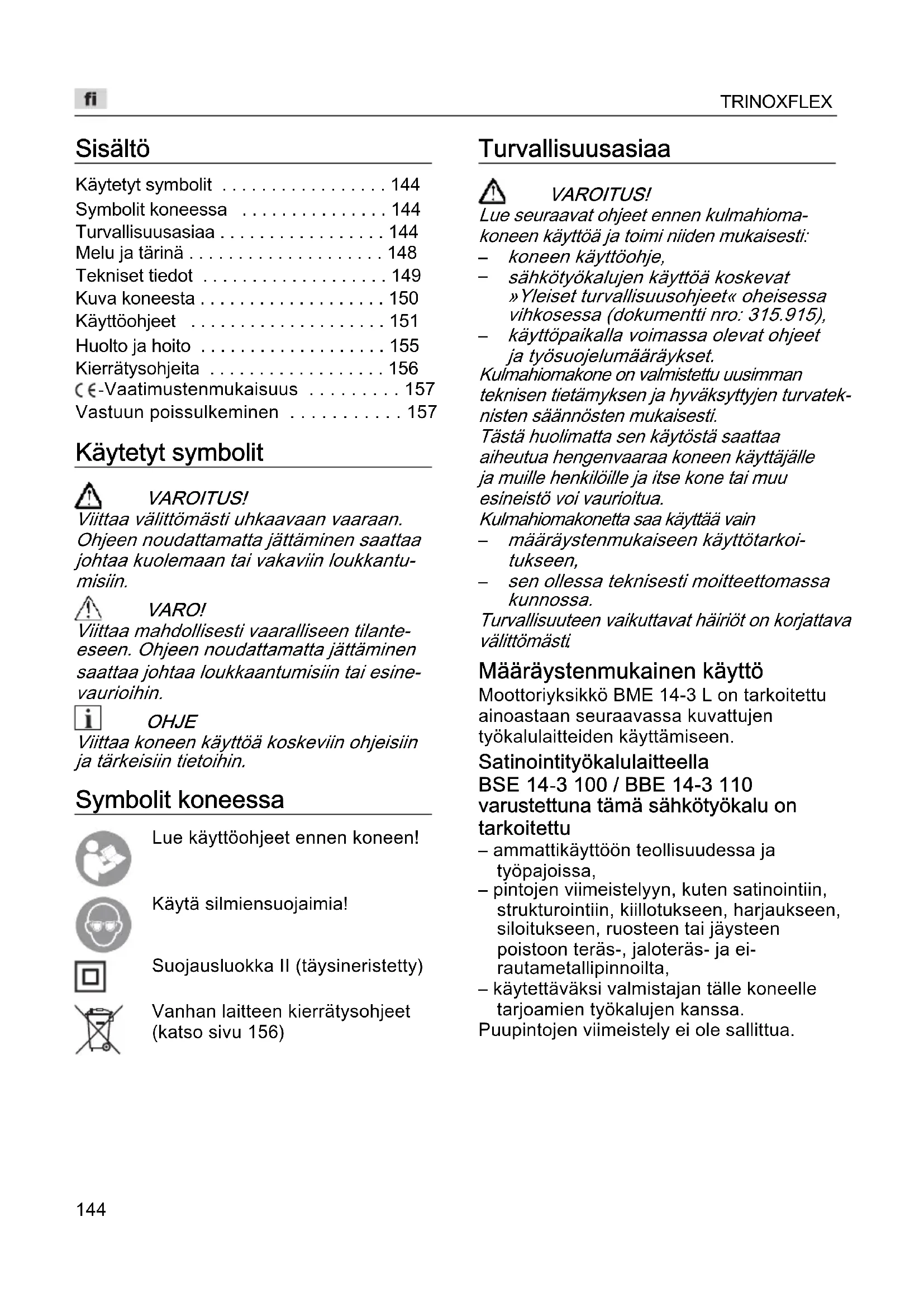 Älä käytä mitään tarvikkeita, joita valmis- taja ei ole hyväksynyt tai suositellut nimenomaan tälle sähkötyökalulle. Vaikka pystyt kiinnittämään lisätarvik- keen sähkötyökaluun, se ei takaa sen turvallista käyttöä. Käyttötyökalun sallitun kierrosnopeuden tulee olla vähintään yhtä suuri kuin säh- kötyökalussa ilmoitettu maksimi kierros- nopeus. Tarvike, joka pyörii sallittua nopeammin, saattaa mennä hajalle ja palaset sinkou- tuvat ympäristöön. Vaihtotyökalun ulkohalkaisijan ja pak- suuden tulee vastata sähkötyökalun mittatietoja. Vääränkokoisia vaihtotyöka- luja ei voida suojata tai hallita riittävästi. Hiomalaikkojen ja laippojen tulee sopia tarkasti sähkötyökalusi hiomakaraan. Käytettäessä vaihtotyökaluja, jotka liitetään laippaan, tulee vaihtotyökalun reiän halkaisijan sopia laipan kiinnityshalkaisijaan. Vaihtotyökalut, joita ei kiinnitetä oikein sähkötyökaluun, pyörivät epätasaisesti, tärisevät voimakkaasti ja saattavat johtaa hallinnan menettämiseen. Älä käytä vioittuneita vaihtotyökaluja. Tarkista ennen jokaista käyttöä, ettei vaihtotyökalussa, kuten hiomalaikoissa ole pirstoutumia tai halkemia, hioma- lautasessa halkeamia tai voimakasta kulumista, teräsharjassa irtonaisia tai katkenneita lankoja. Jos sähkötyökalu tai vaihtotyökalu putoaa, tarkista sen kunto. Käytä vain hyväkuntoisia ja ehjiä vaihto- työkaluja. Kun olet tarkistanut ja asenta- nut vaihtotyökalun, pysyttele poissa pyörivän vaihtotyökalun tasosta ja var- mista, että myös lähistöllä olevat henkilöt toimivat samoin, ja anna koneen käydä maksimi nopeudella noin minuutin ajan. Vioittuneet vaihtotyökalut menevät yleensä rikki tässä ajassa. Käytä henkilökohtaisia suojavarusteita. Käytä käyttökohteesta riippuen kokokas- vonaamaria, silmiensuojainta tai suojala- seja. Jos olosuhteet niin vaativat, käytä pölynaamaria, kuulonsuojaimia, suoja- käsineitä tai erikoissuojavaatetta, joka suojaa pieniltä hioma- ja materiaalihiuk- kasilta. Suojaa silmät lenteleviltä vierailta esi- neiltä tms., joita voi syntyä erilaisessa käytössä. Pölynaamarin tai hengityssuojaimen tulee suodattaa käytön aikana syntyvä pöly. Pidempiaikainen voimakkaalle melulle altistuminen saattaa vaikuttaa heikentävästi kuuloon.TRINOXFLEX