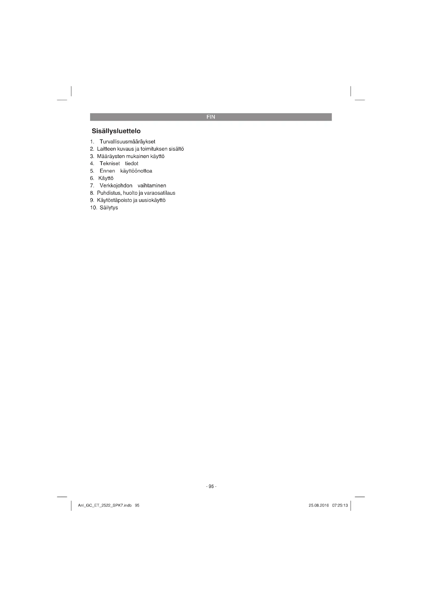 Säilytä laite ja sen varusteet valolta, kosteudelta ja pakkaselta suojatussa tilassa poissa lasten ulottuvilta. Paras säilytyslämpötila on 5°C ja 30°C välillä. Säilytä sähkötyökalut alkuperäispakkauk- sissaan. Anl_GC_ET_2522_SPK7.indb 99Anl_GC_ET_2522_SPK7.indb 99 25.08.2016 07:25:1325.08.2016 07:25:13FIN