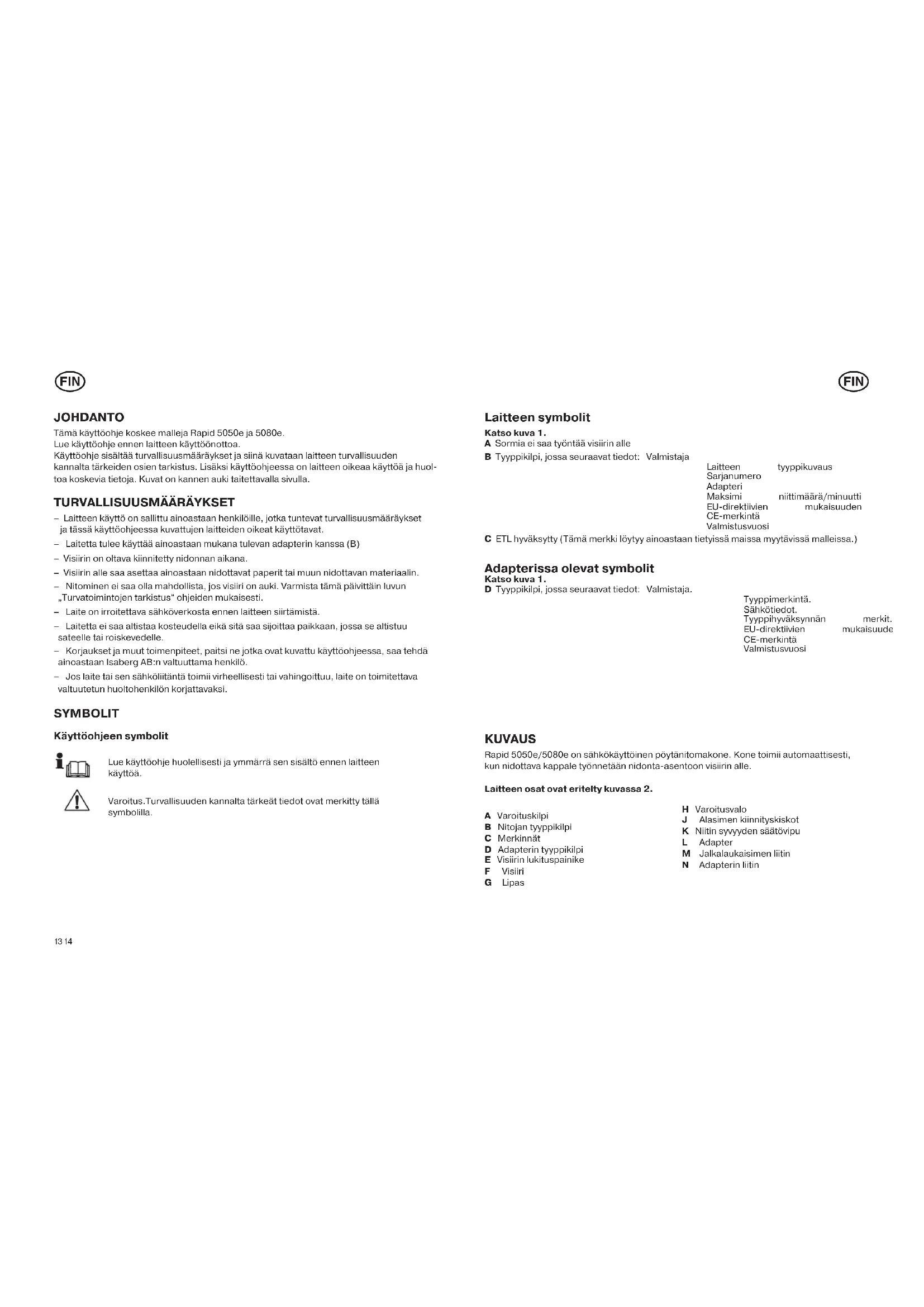 Laitteen symbolit Katso kuva 1. A Sormia ei saa työntää visiirin alle B Tyyppikilpi, jossa seuraavat tiedot: Valmistaja Laitteen tyyppikuvaus Sarjanumero Adapteri Maksimi niittimäärä/minuutti EU-direktiivien mukaisuuden ilmaiseva CE-merkintä Valmistusvuosi C ETL hyväksytty (Tämä merkki löytyy ainoastaan tietyissä maissa myytävissä malleissa.) Adapterissa olevat symbolit Katso kuva 1. D Tyyppikilpi, jossa seuraavat tiedot: Valmistaja. Tyyppimerkintä. Sähkötiedot. Tyyppihyväksynnän merkit. EU-direktiivien mukaisuuden ilmaiseva CE-merkintä Valmistusvuosi KUVAUS Rapid 5050e/5080e on sähkökäyttöinen pöytänitomakone. Kone toimii automaattisesti, kun nidottava kappale työnnetään nidonta-asentoon visiirin alle. Laitteen osat ovat eritelty kuvassa 2. A Varoituskilpi B Nitojan tyyppikilpi C Merkinnät D Adapterin tyyppikilpi E Visiirin lukituspainike F Visiiri G Lipas H Varoitusvalo J Alasimen kiinnityskiskot K Niitin syvyyden säätövipu L Adapter M Jalkalaukaisimen liitin N Adapterin liitin